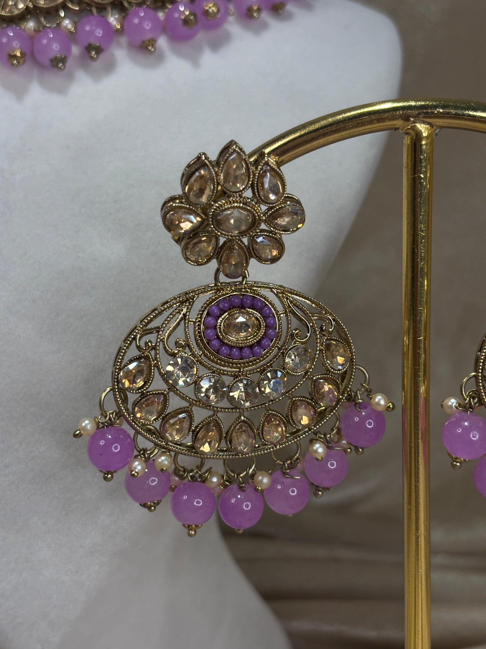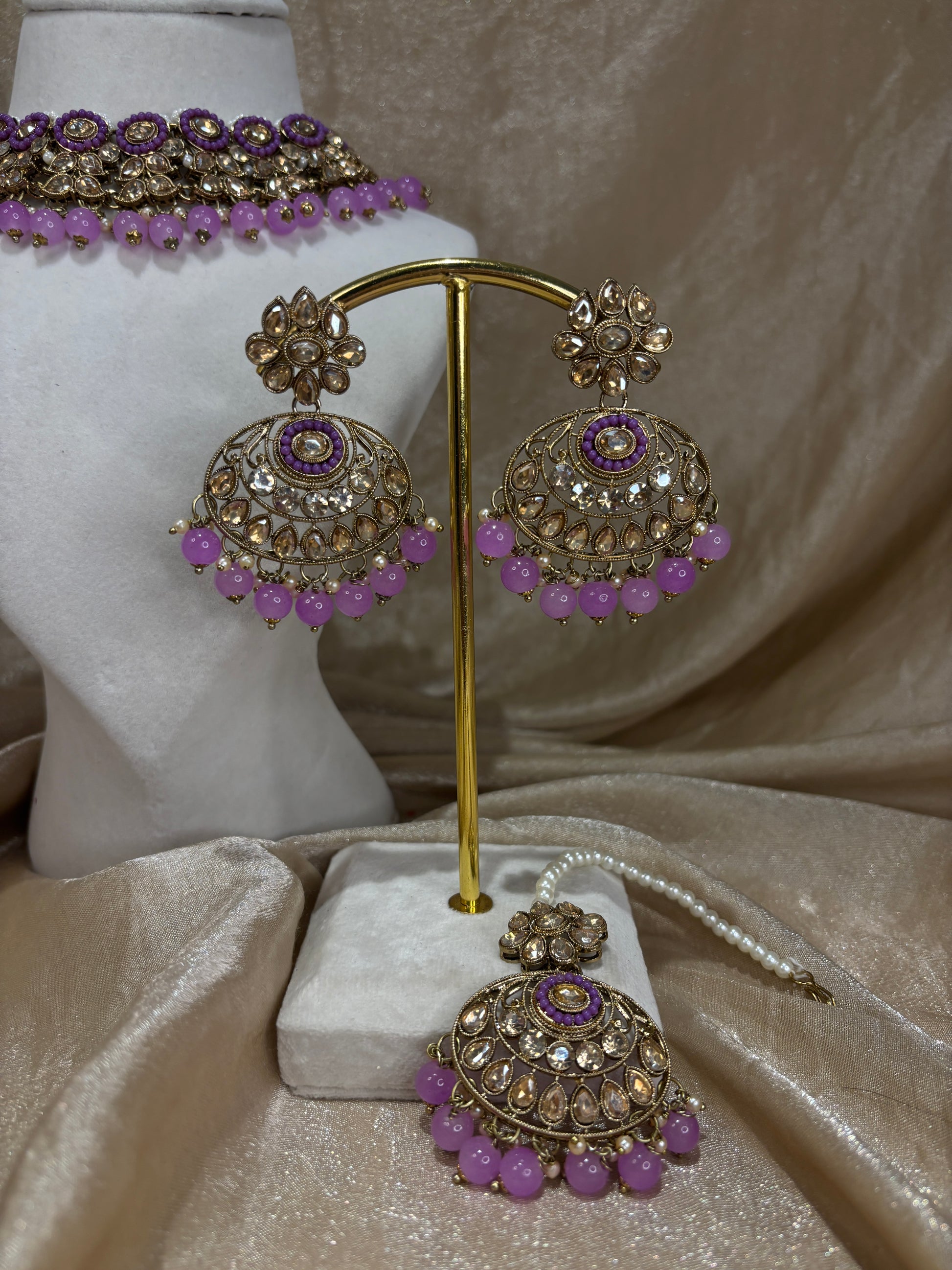 Lavender necklace set with small pearl details; comes with earrings and tikka