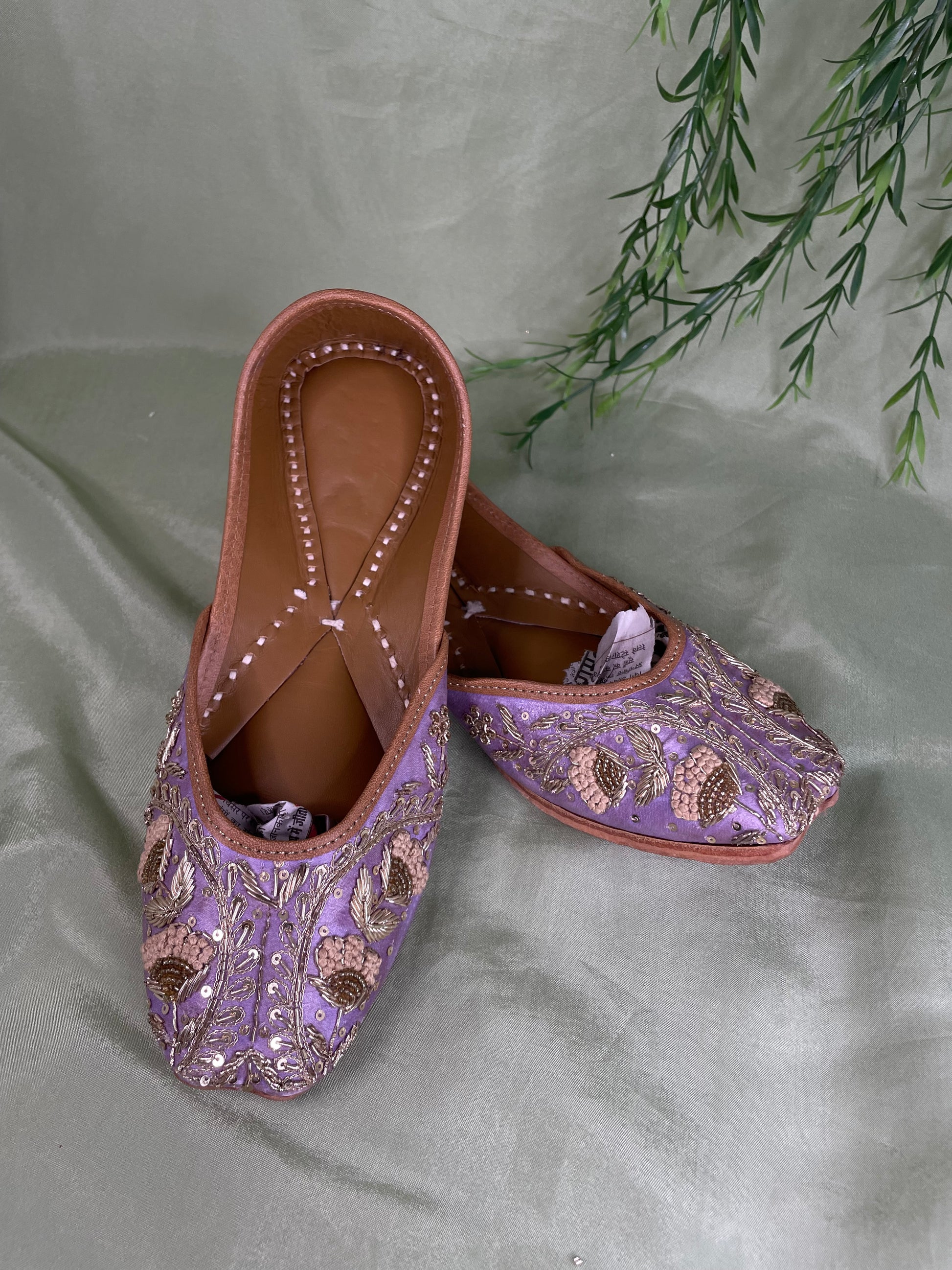 Pastel lavender jutti with flower detail tilla work. All of our juttiyan are double padded for maximum comfort!
