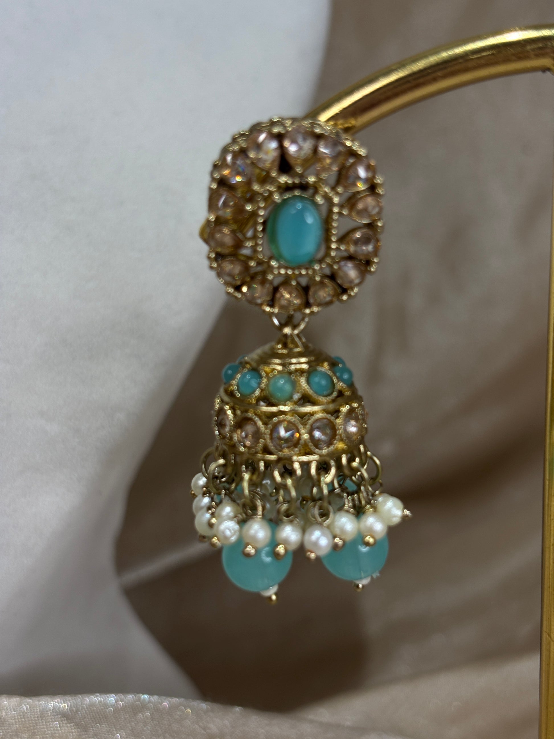 Light blue choker set with small pearl details; comes with earrings and tikka