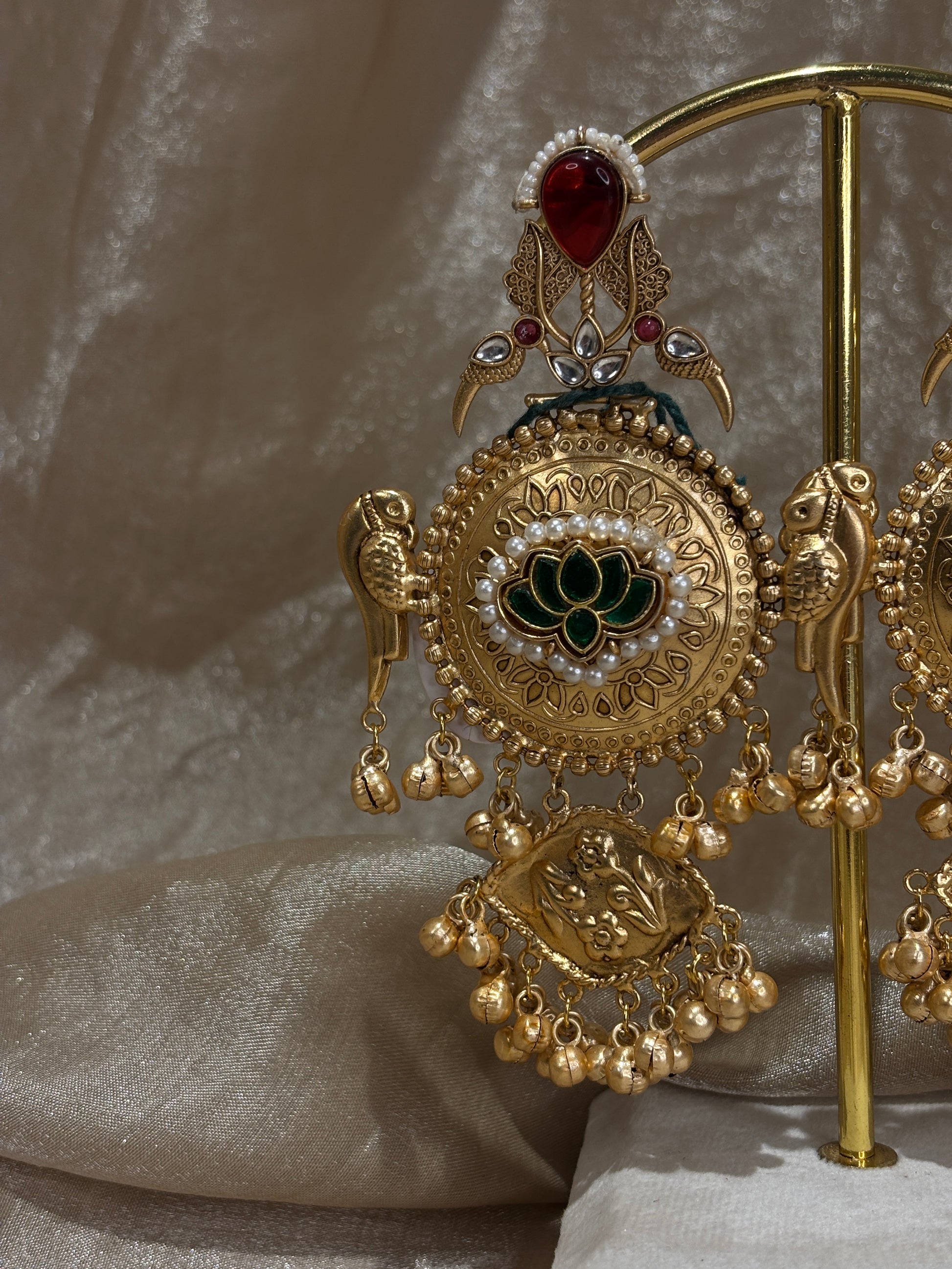 maroon and emerald green statement earrings; made with a 92.5 sterling silver base. comes with bells/ghungroos and bird details