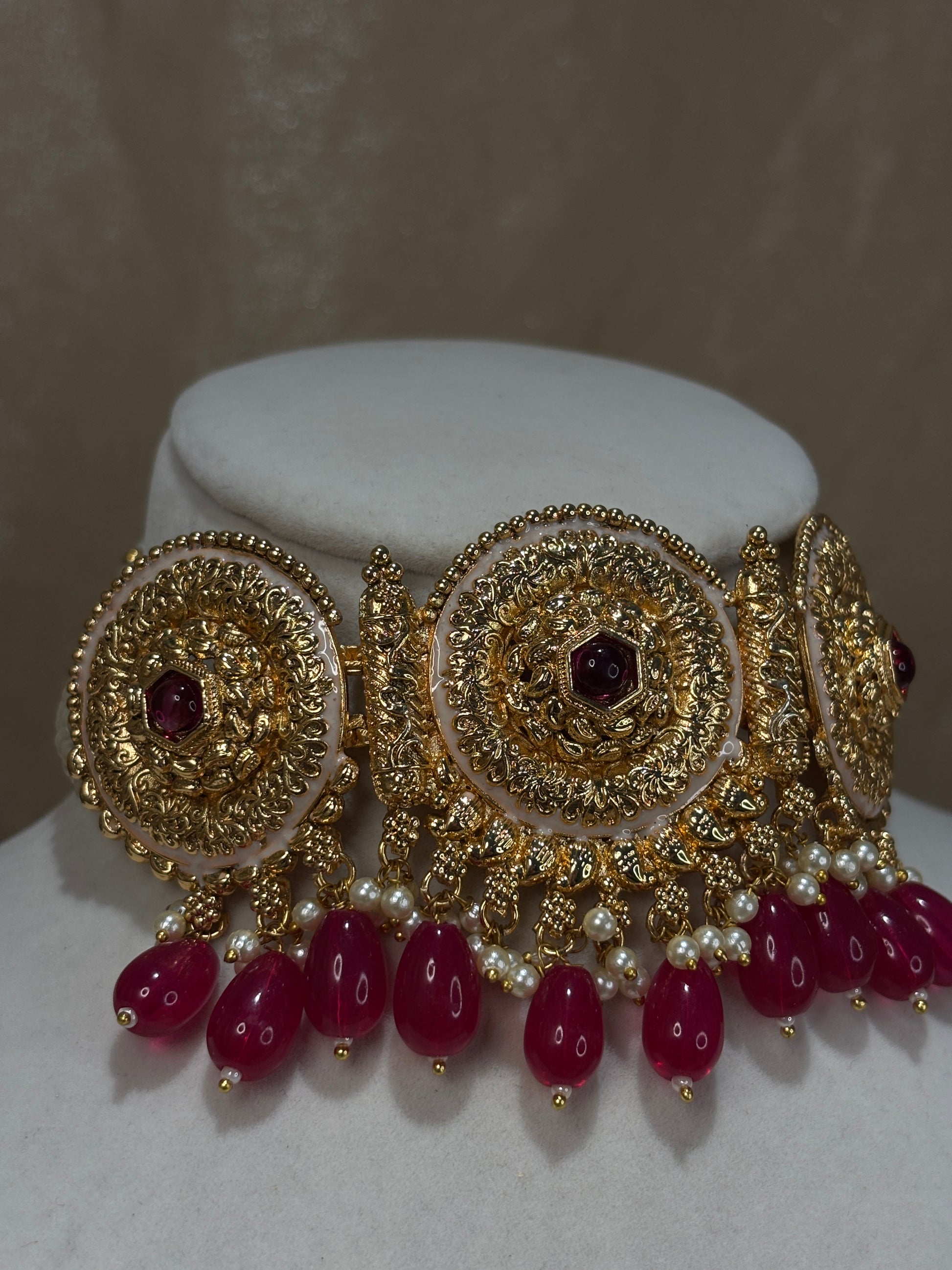 Antique gold choker in maroon with small pearl details; comes with earrings and tikka