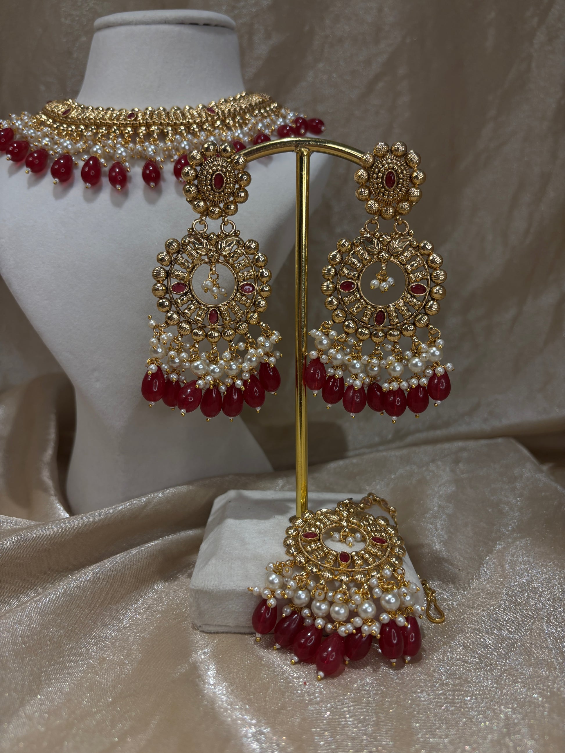 Antique gold necklace in maroon with small pearl details; comes with earrings and tikka