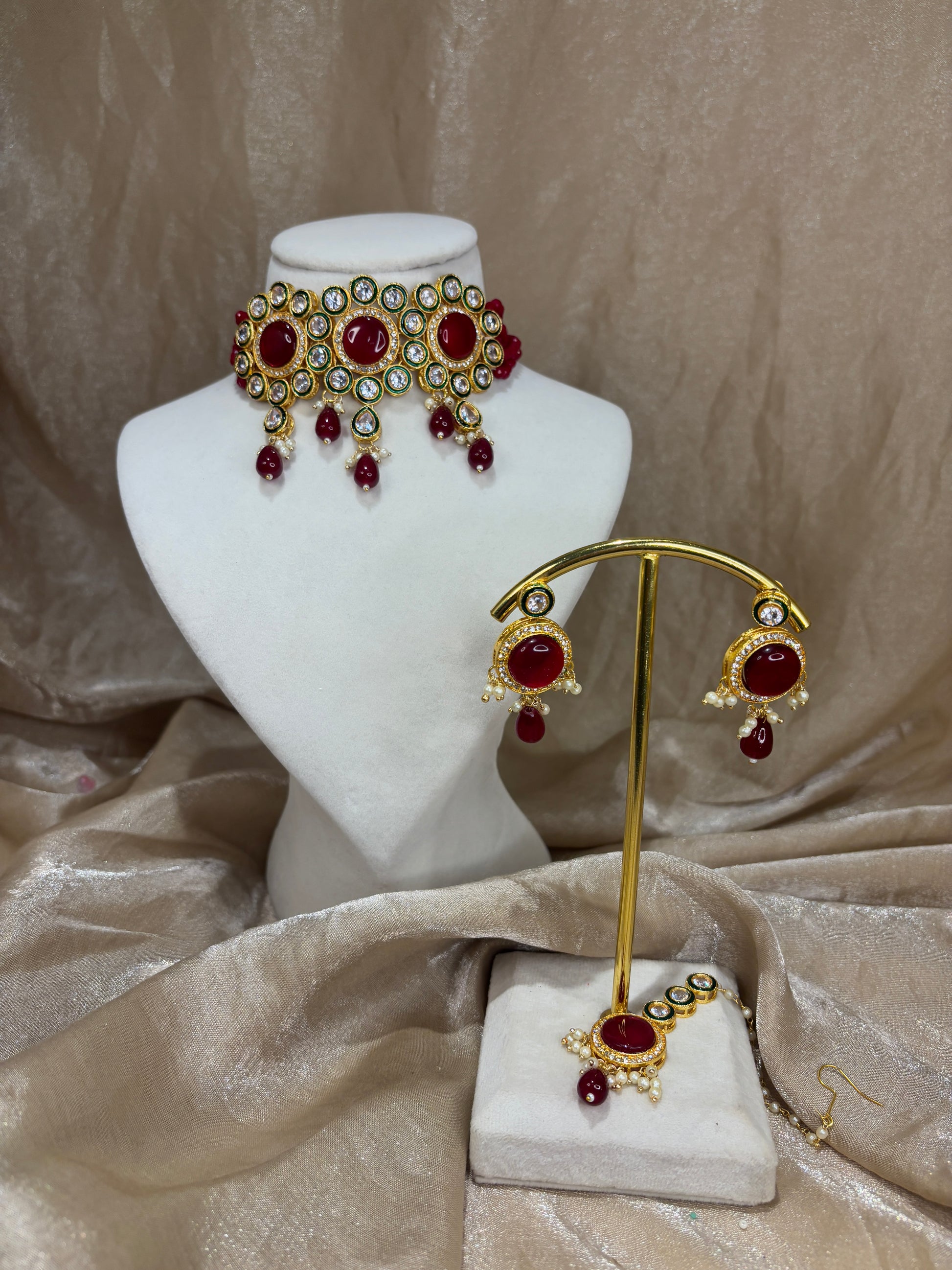 Maroon Mona Lisa choker with pearl details; comes with earrings and tikka