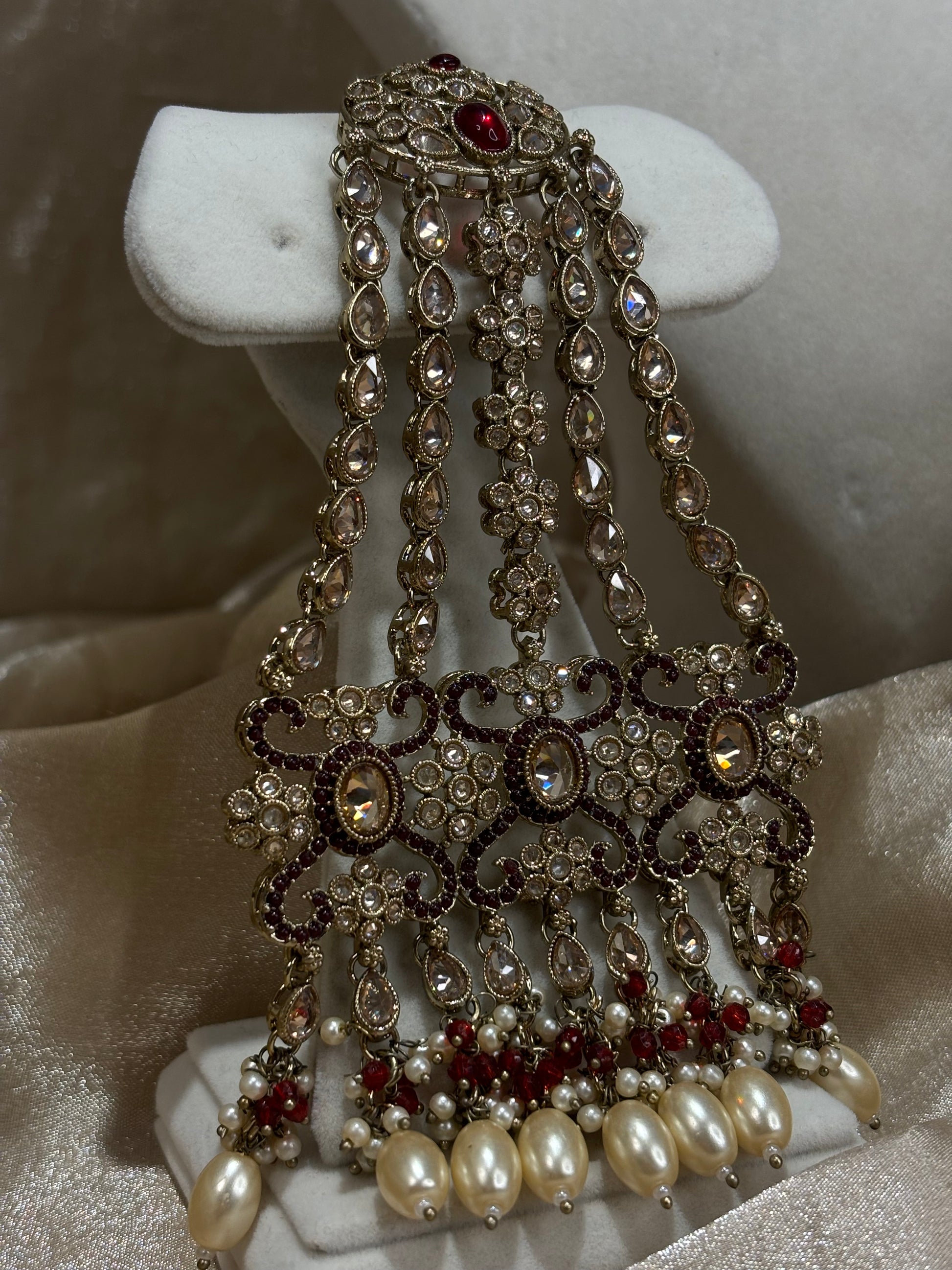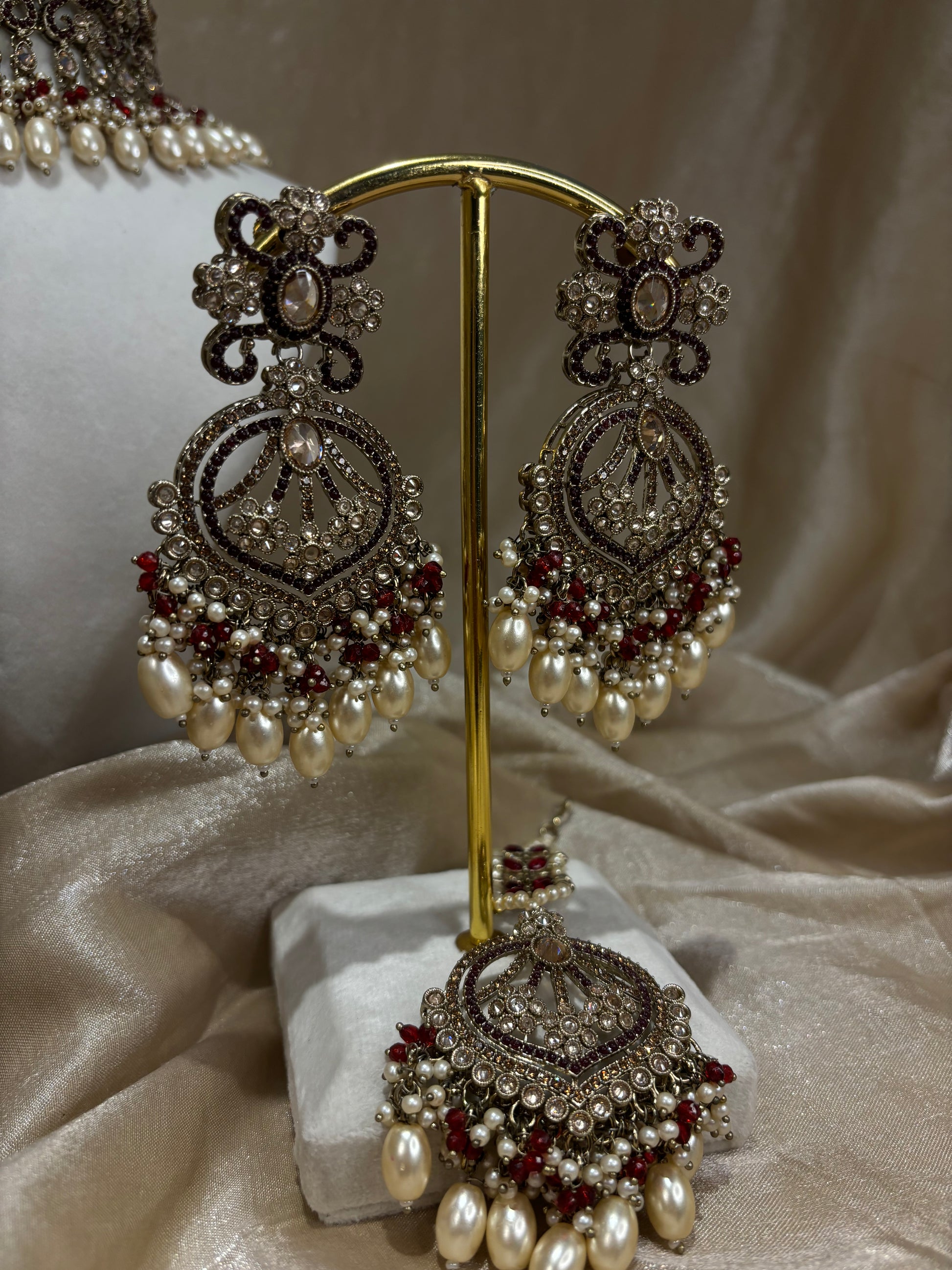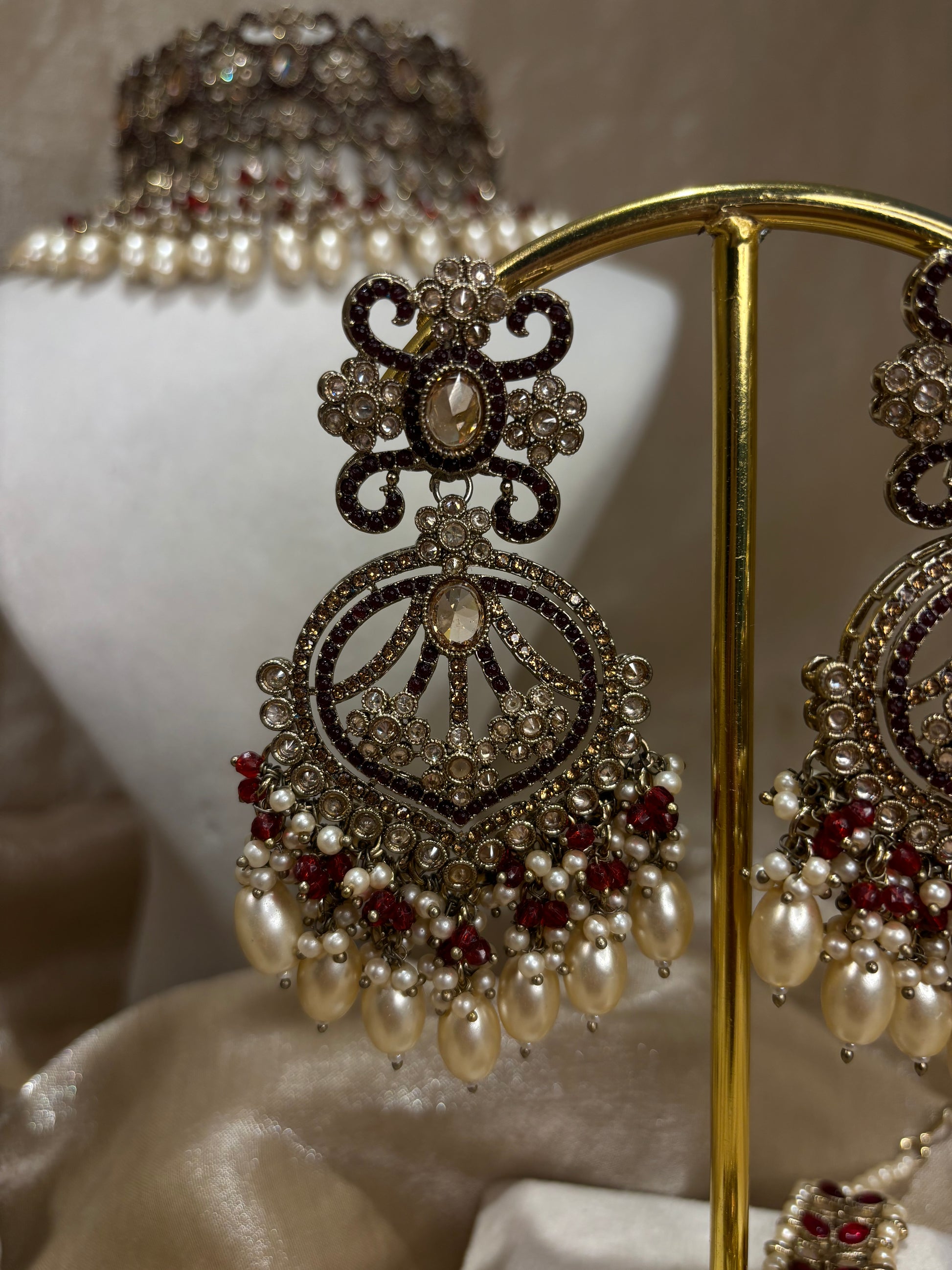 Heavy maroon choker set with nav rattan style pearl details; comes with heavy earrings, tikka and passa.