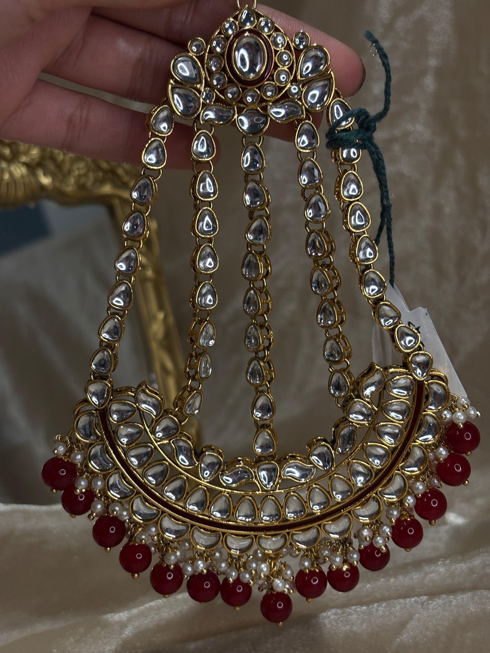 maroon kundan pasta with pearl details; about 5.5 inches long and 4.5 inches wide
