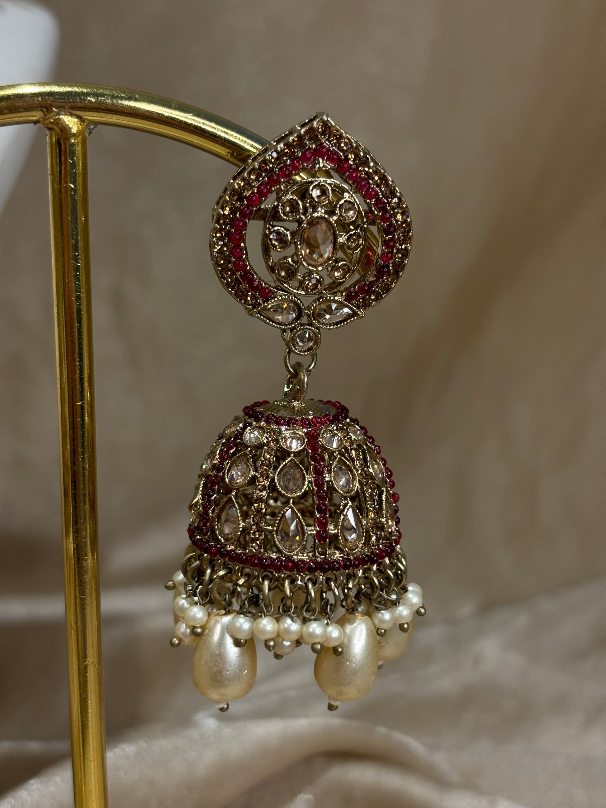 Maroon necklace set with champagne coloured pearl details; comes with jhumki, tikka, and passa.