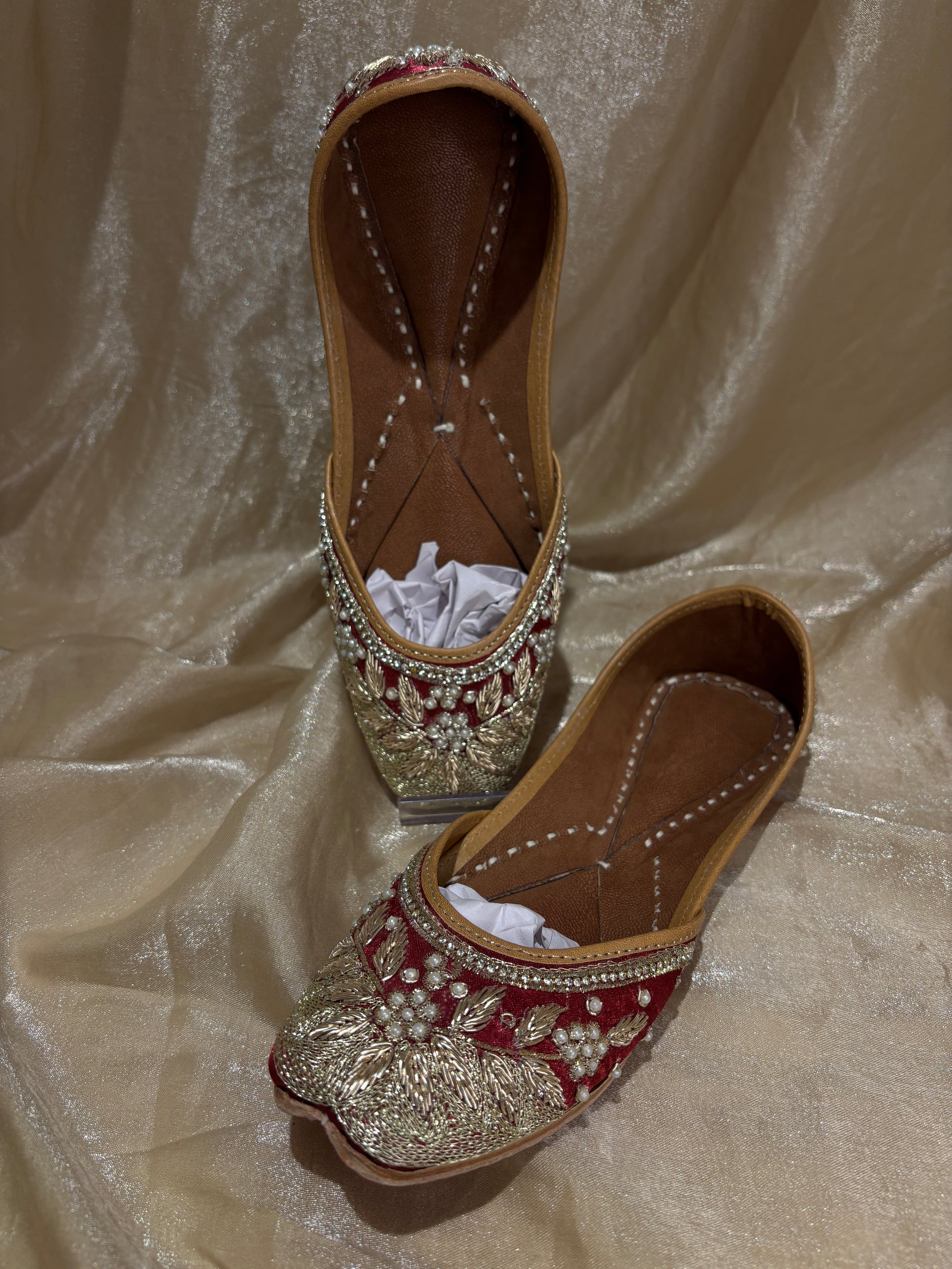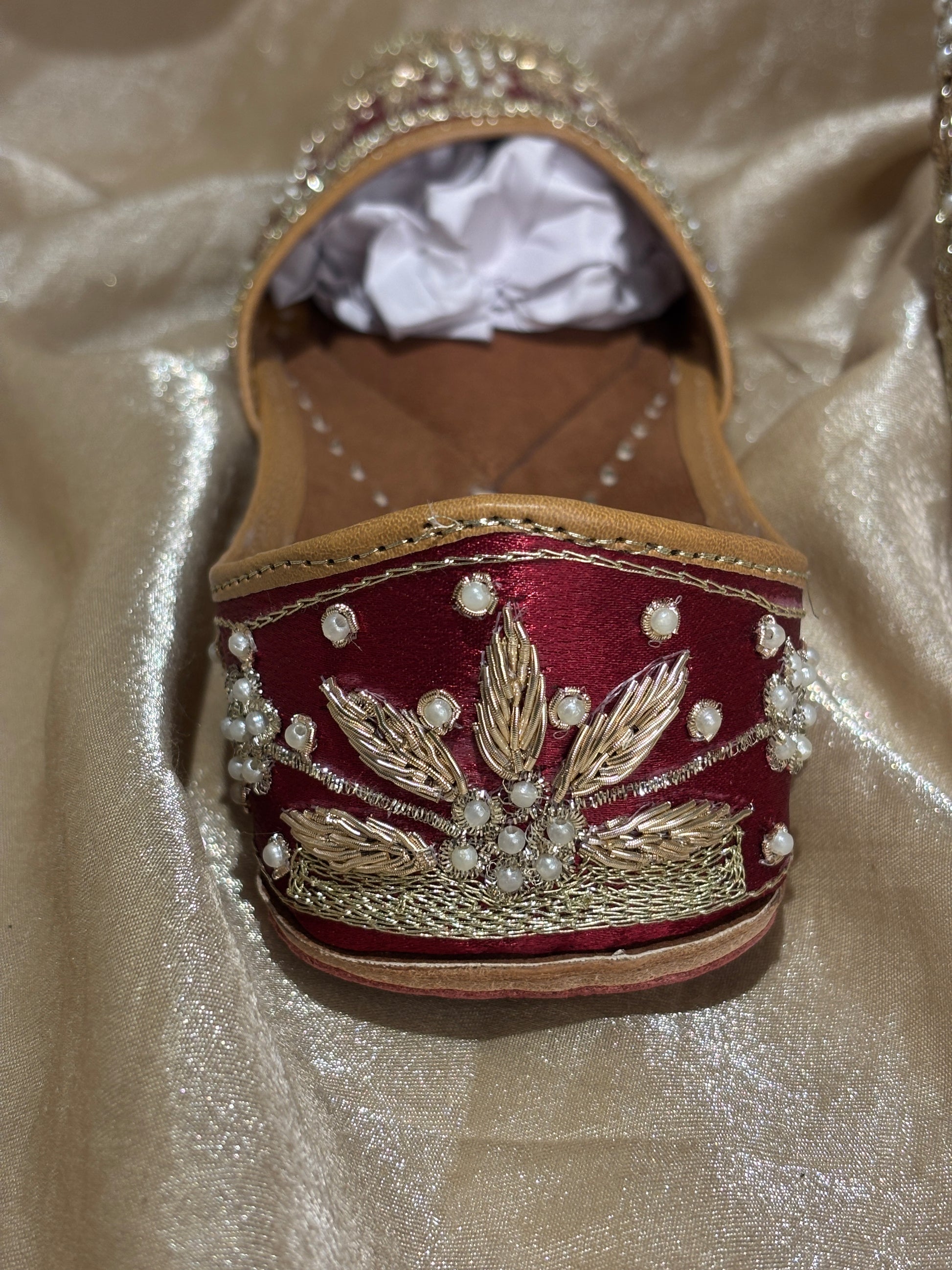 maroon punjabi jutti with detailed embroidery; all juttis come with double padding for ultimate comfort