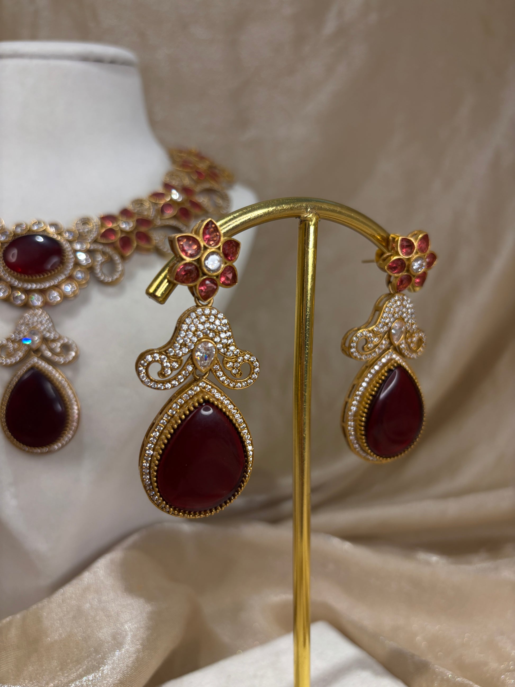 Deep maroon statement necklace set with moissanite stone details; comes with earrings