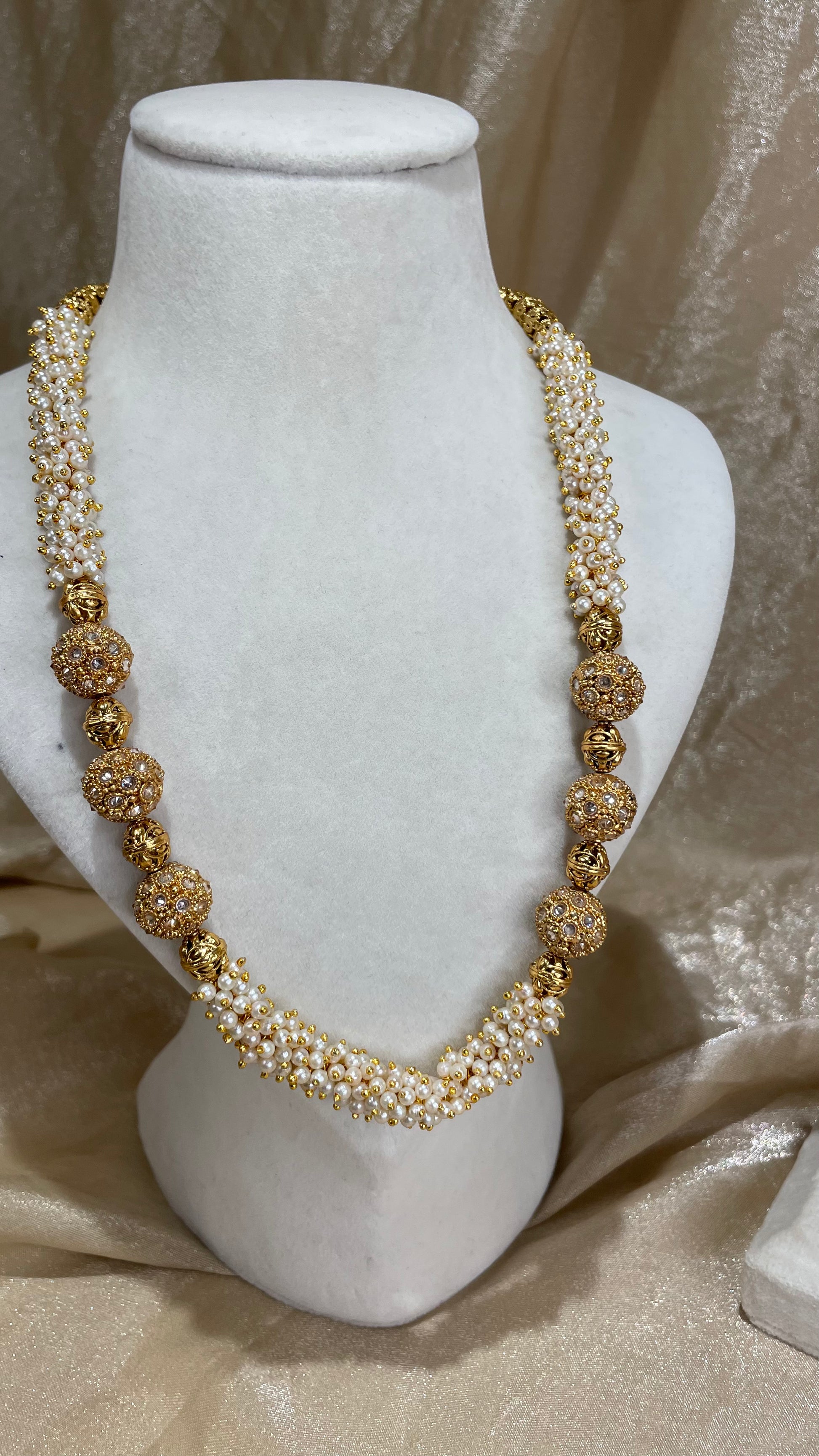single layer antique gold matar mala set with pearl details; comes with small jhumki earrings