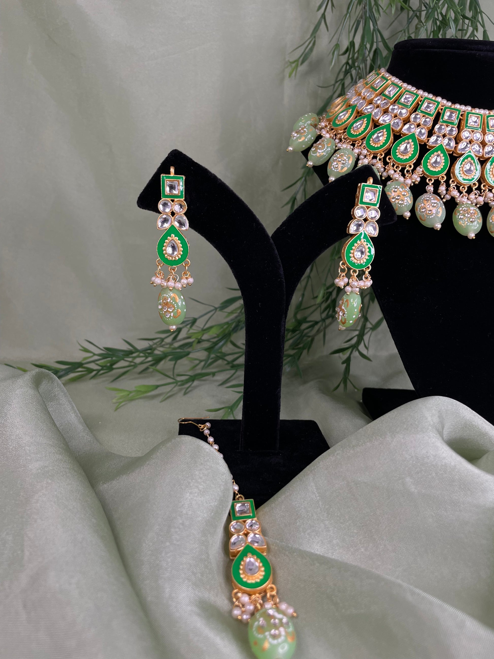 Mint green heavy choker set in white kundan; comes with earrings and tikka