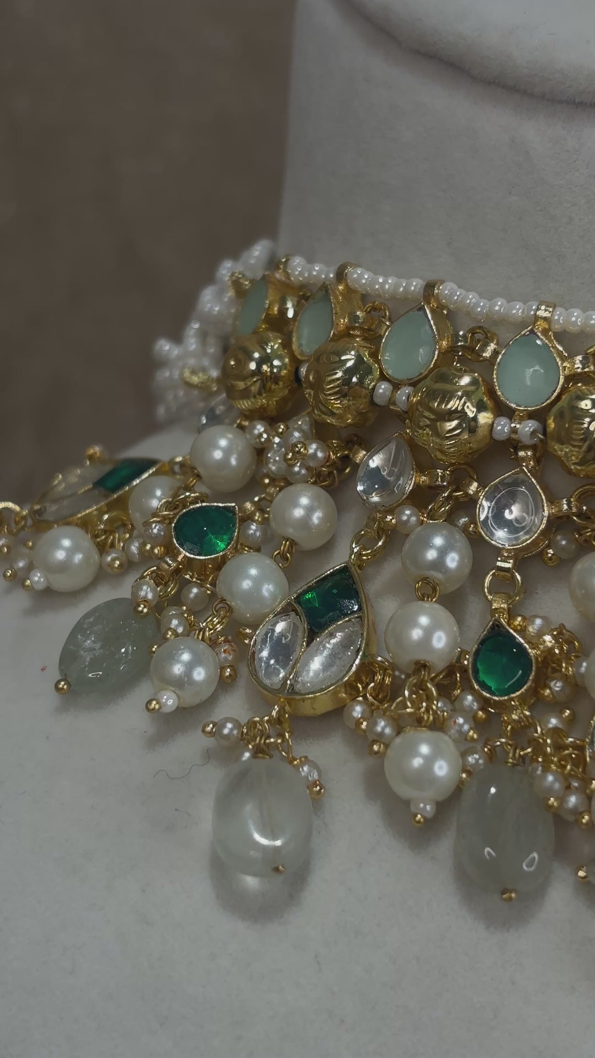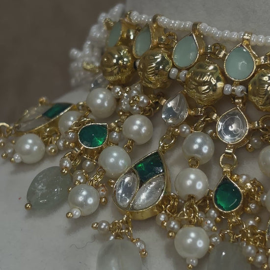 22k gold plated ahmedabadi pachi kundan choker with emerald green and mint green accents and pearl details; comes with earrings n