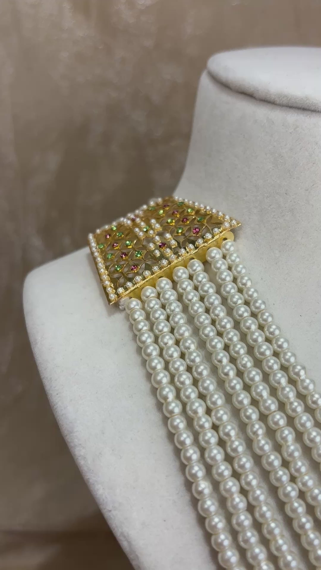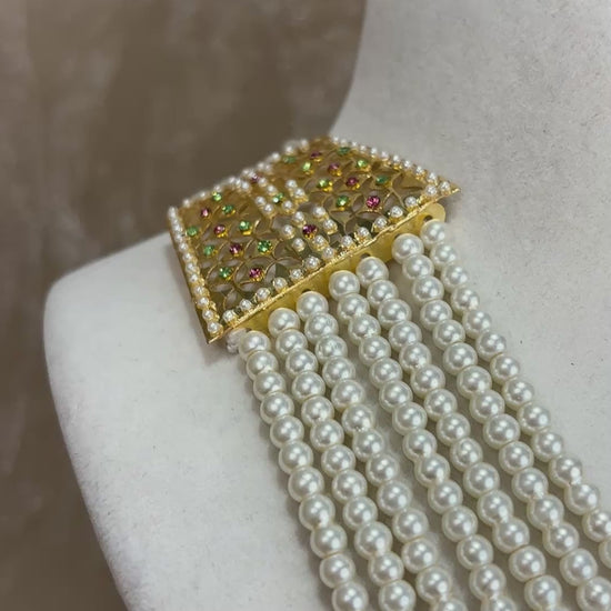Heavy pearl detail jadau necklace set with accents of mint green and baby pink; comes with earrings and tikka