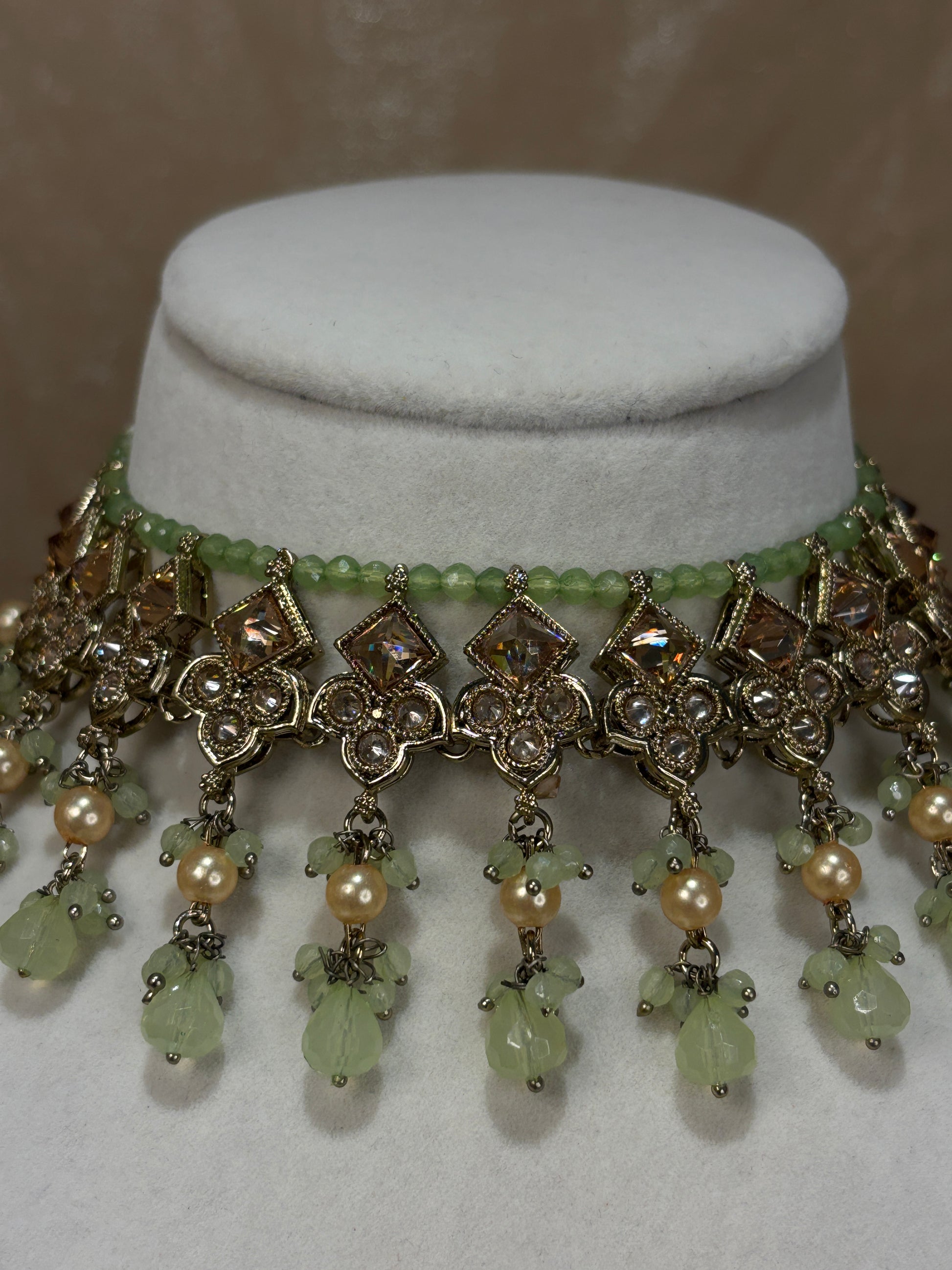 Mint green set with small pearl details; can be worn as a necklace and choker