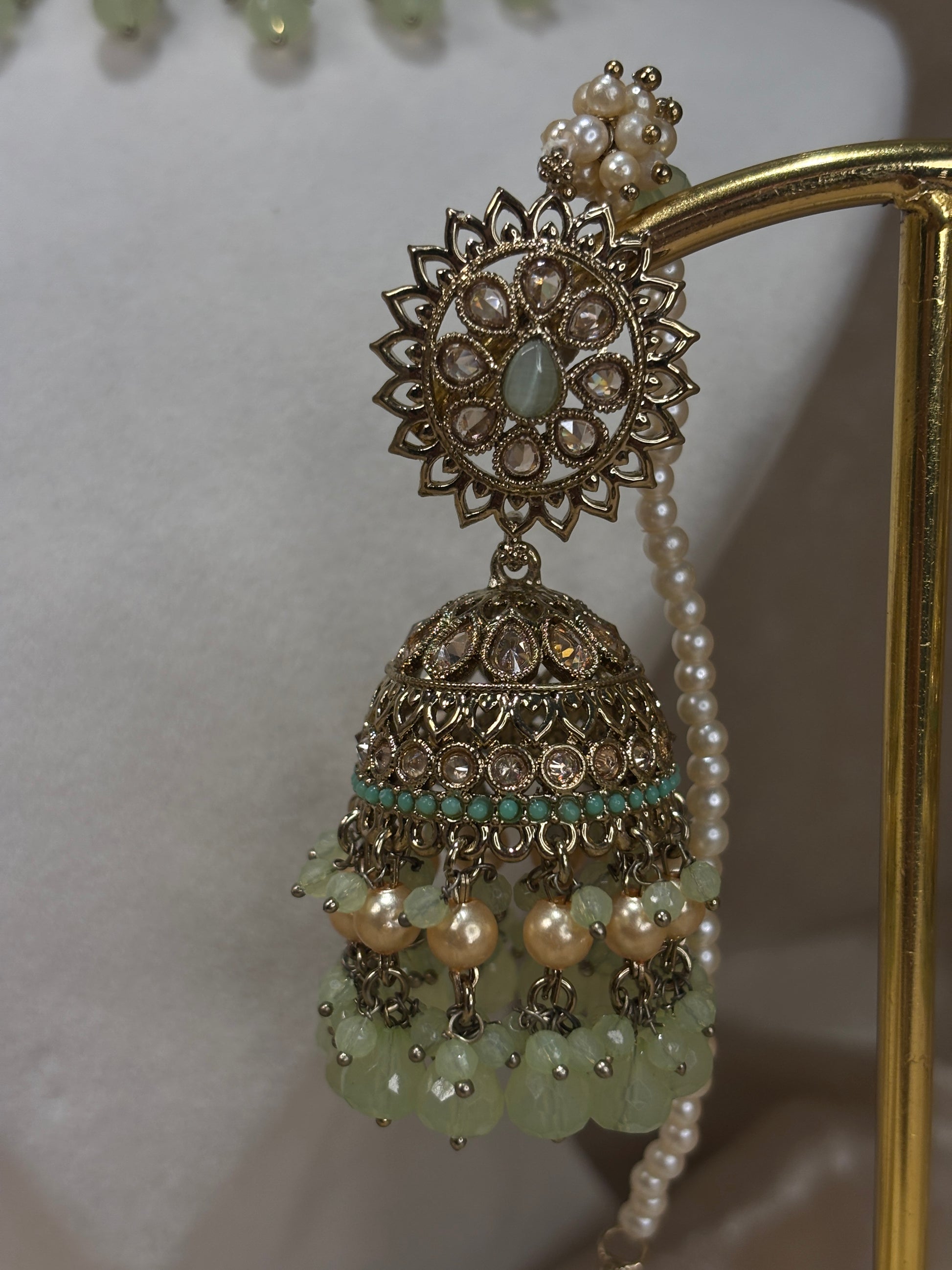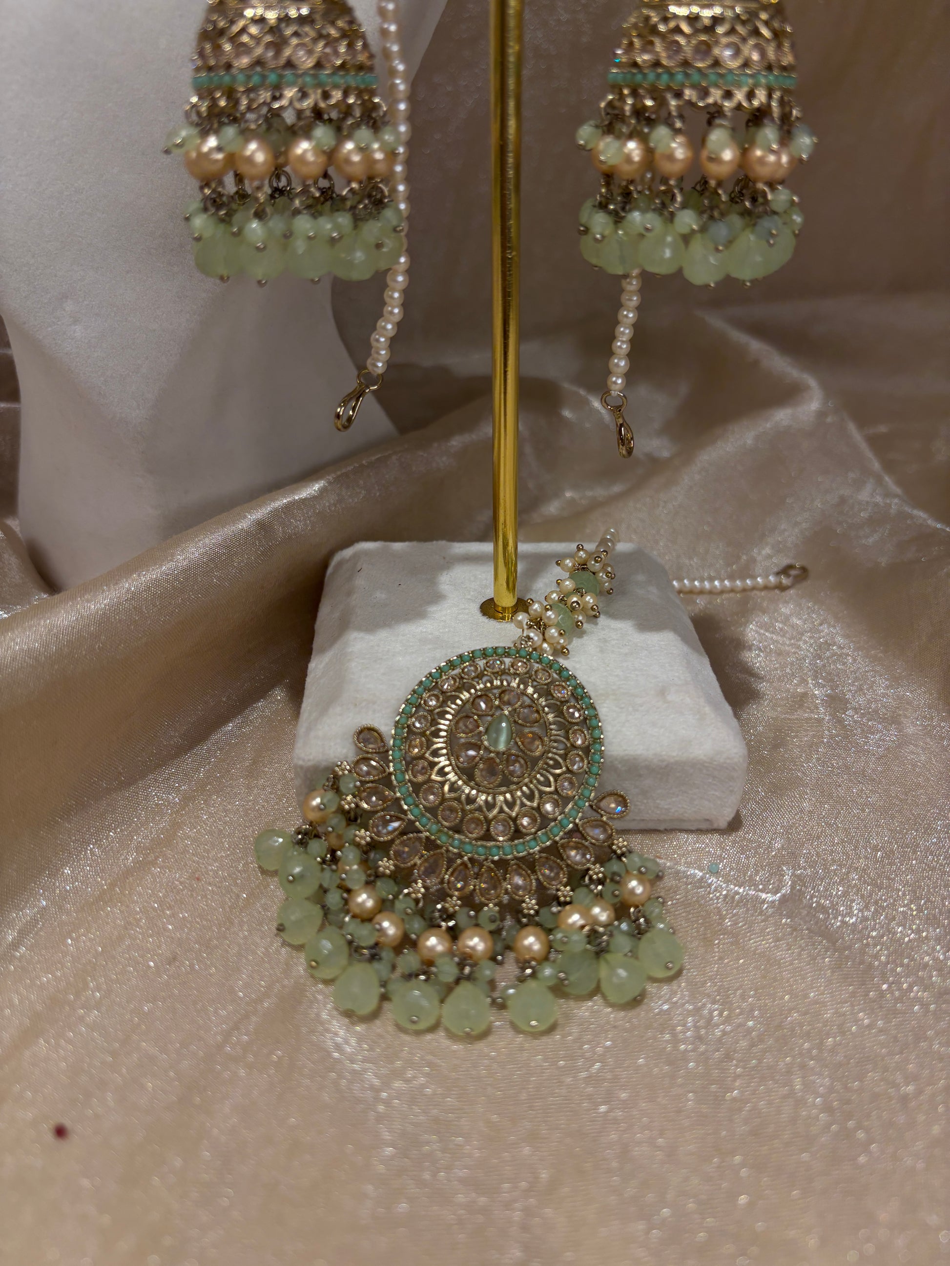 comes with jhumki earrings (With over the ear sahare) and oversized tikka