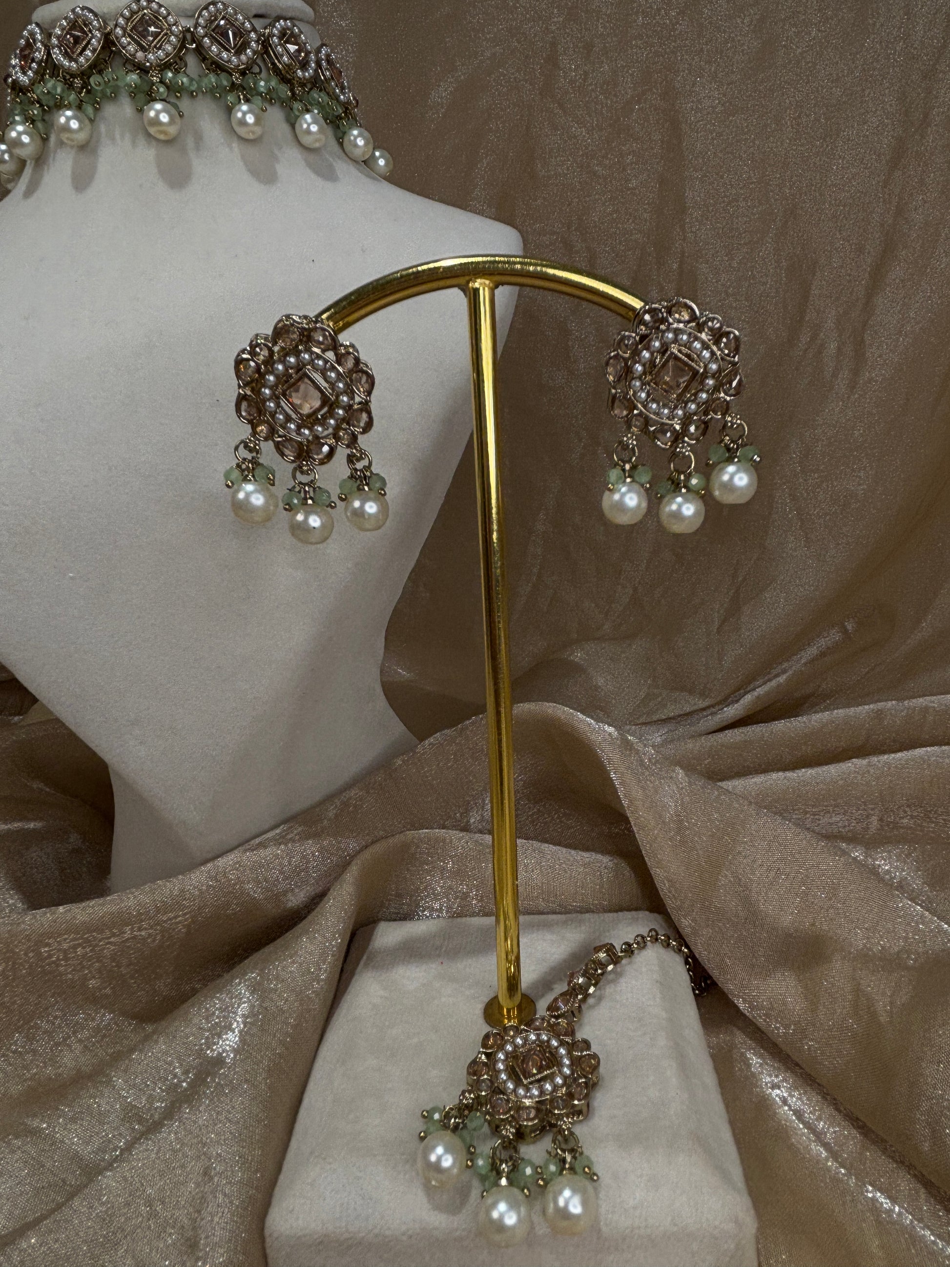 mInt green choker with pearl details; comes with small studs and tikka