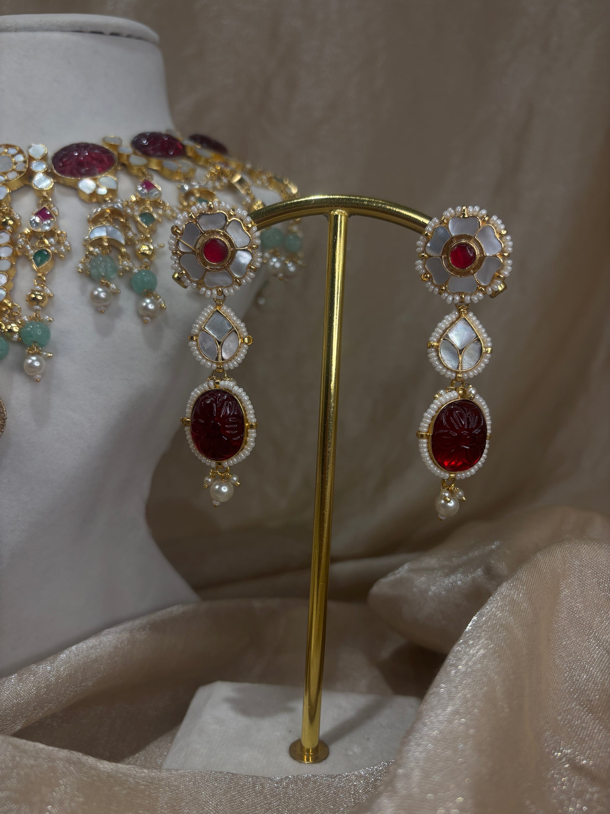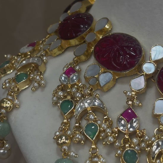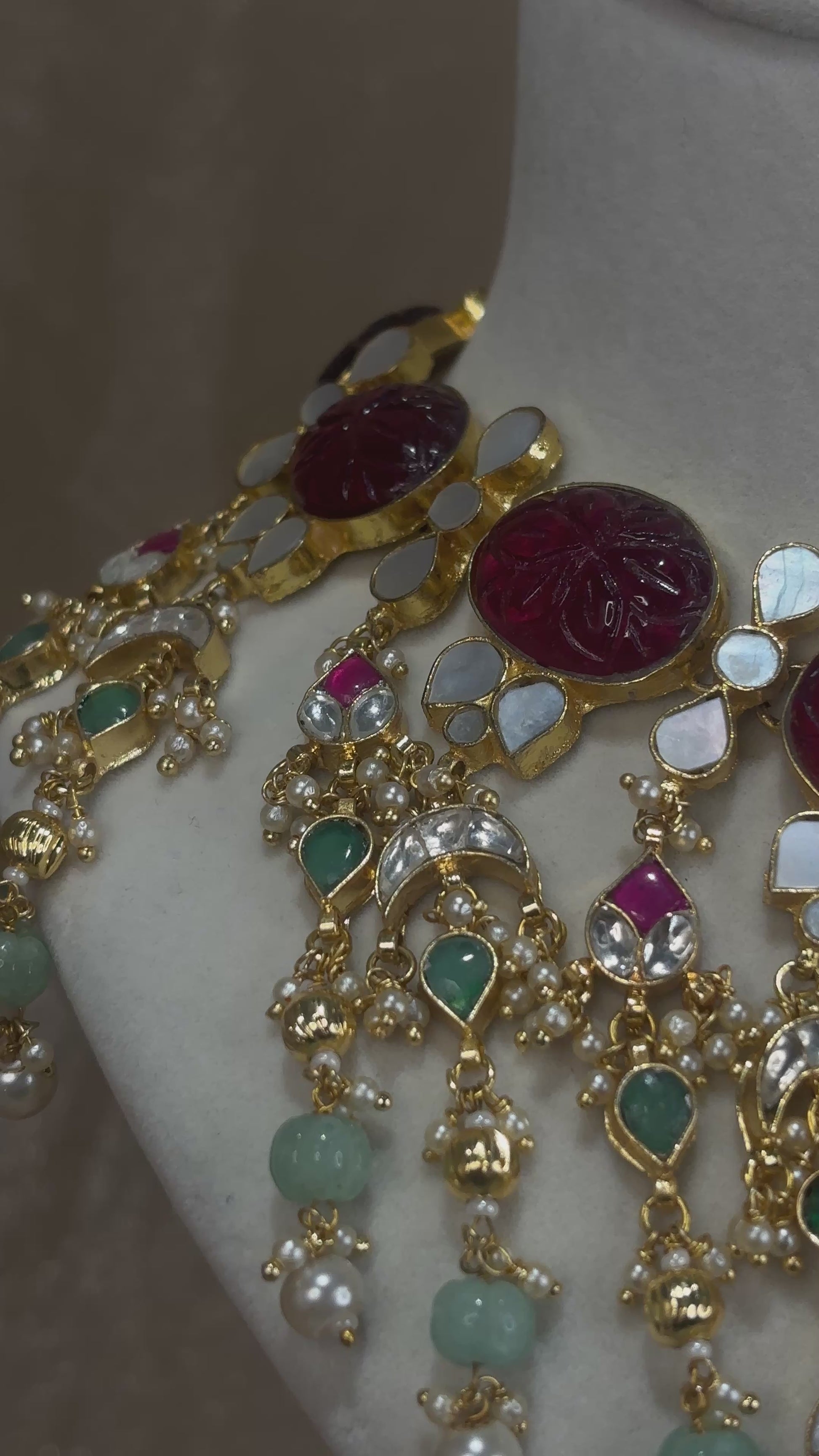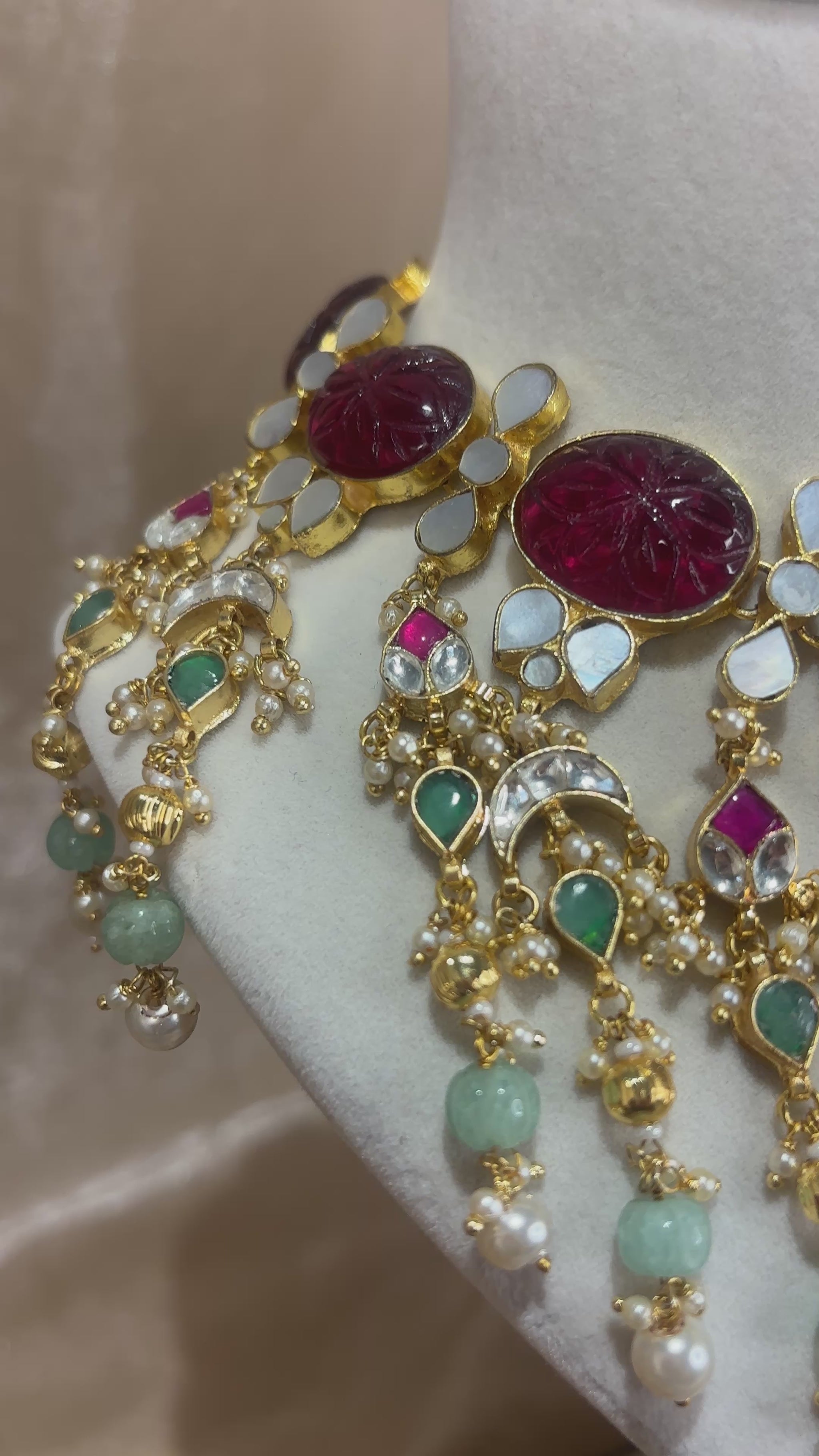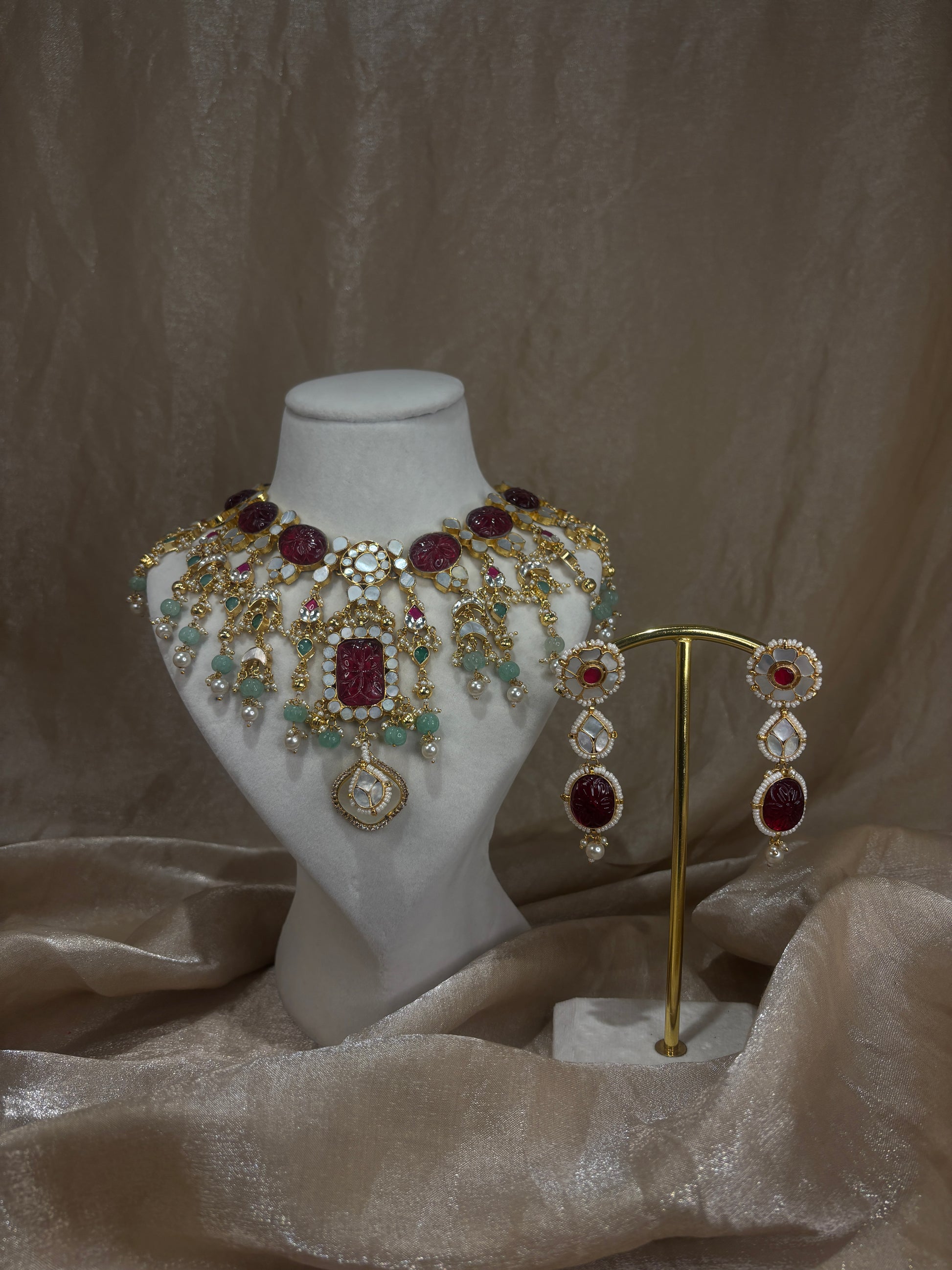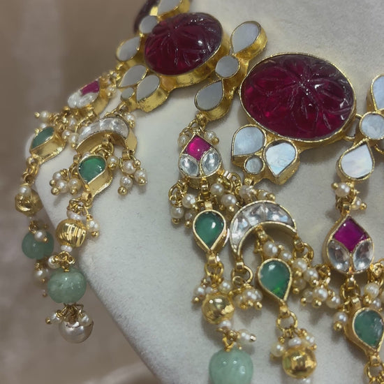Heavy bridal 22k gold plated ahmedbadi pachi kundan choker with maroon and sage green/mint green accents. Comes with earrings