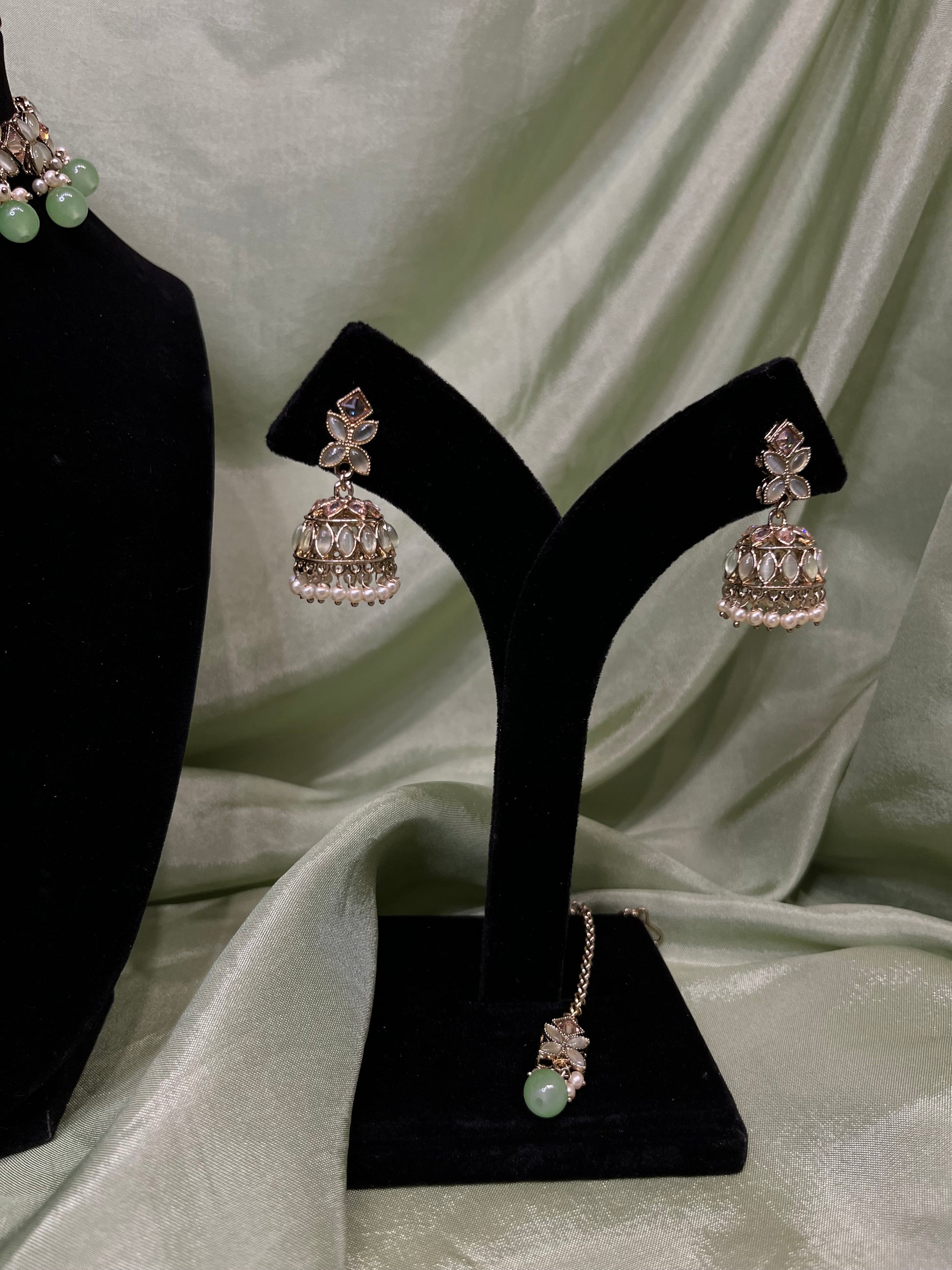 Mint green choker with mini jhumkis and tikka; choker may also be worn as a necklace.