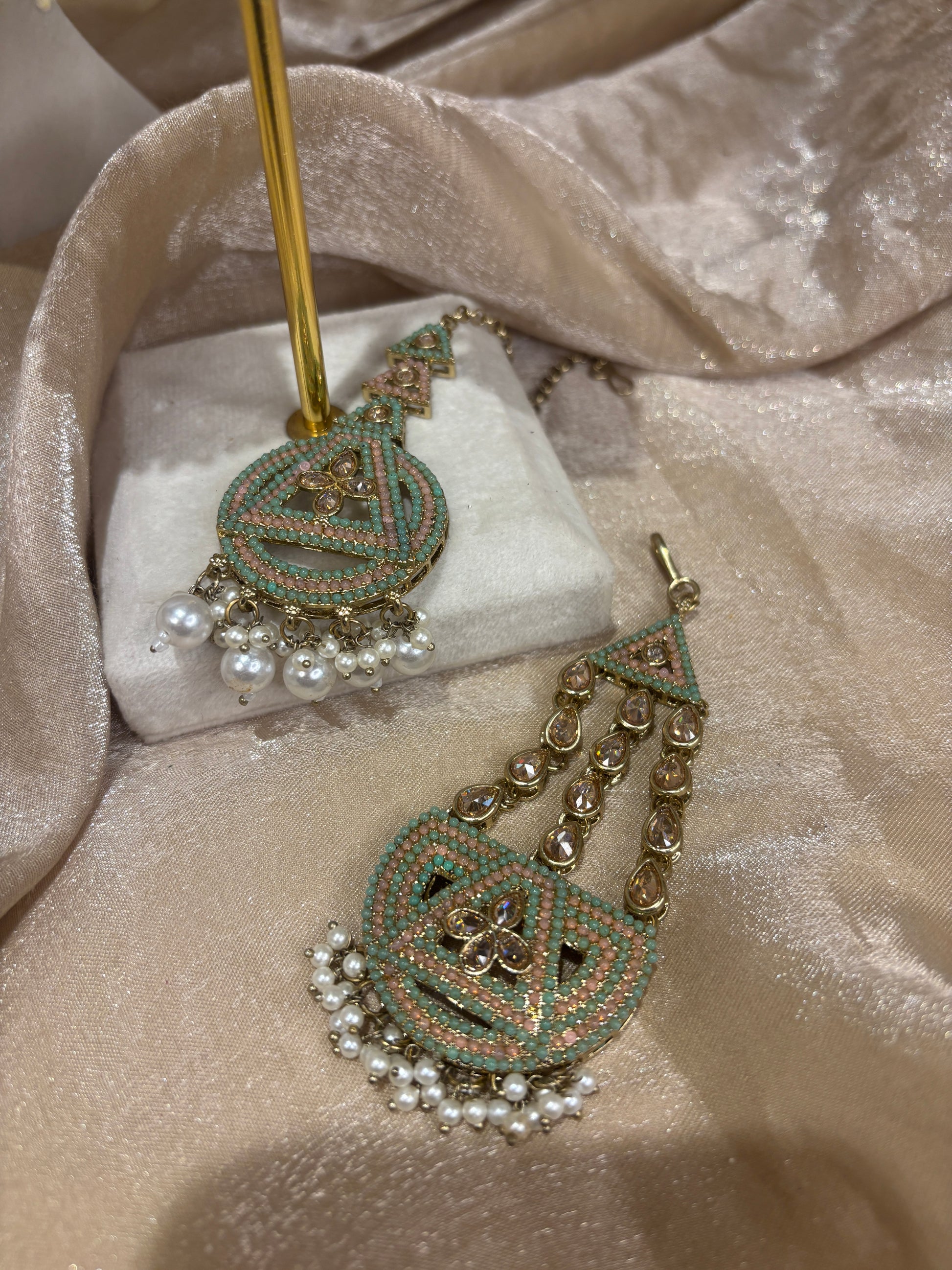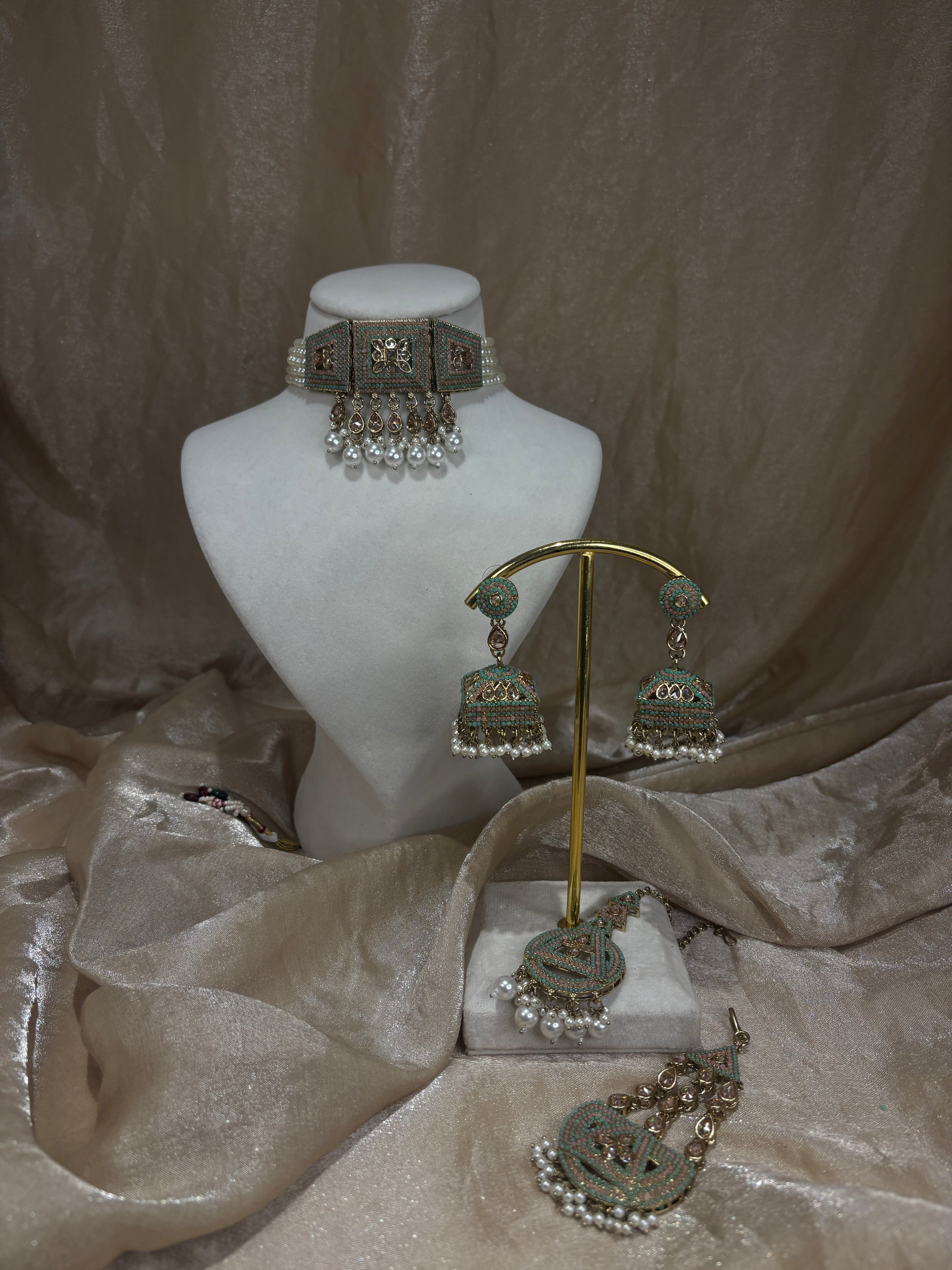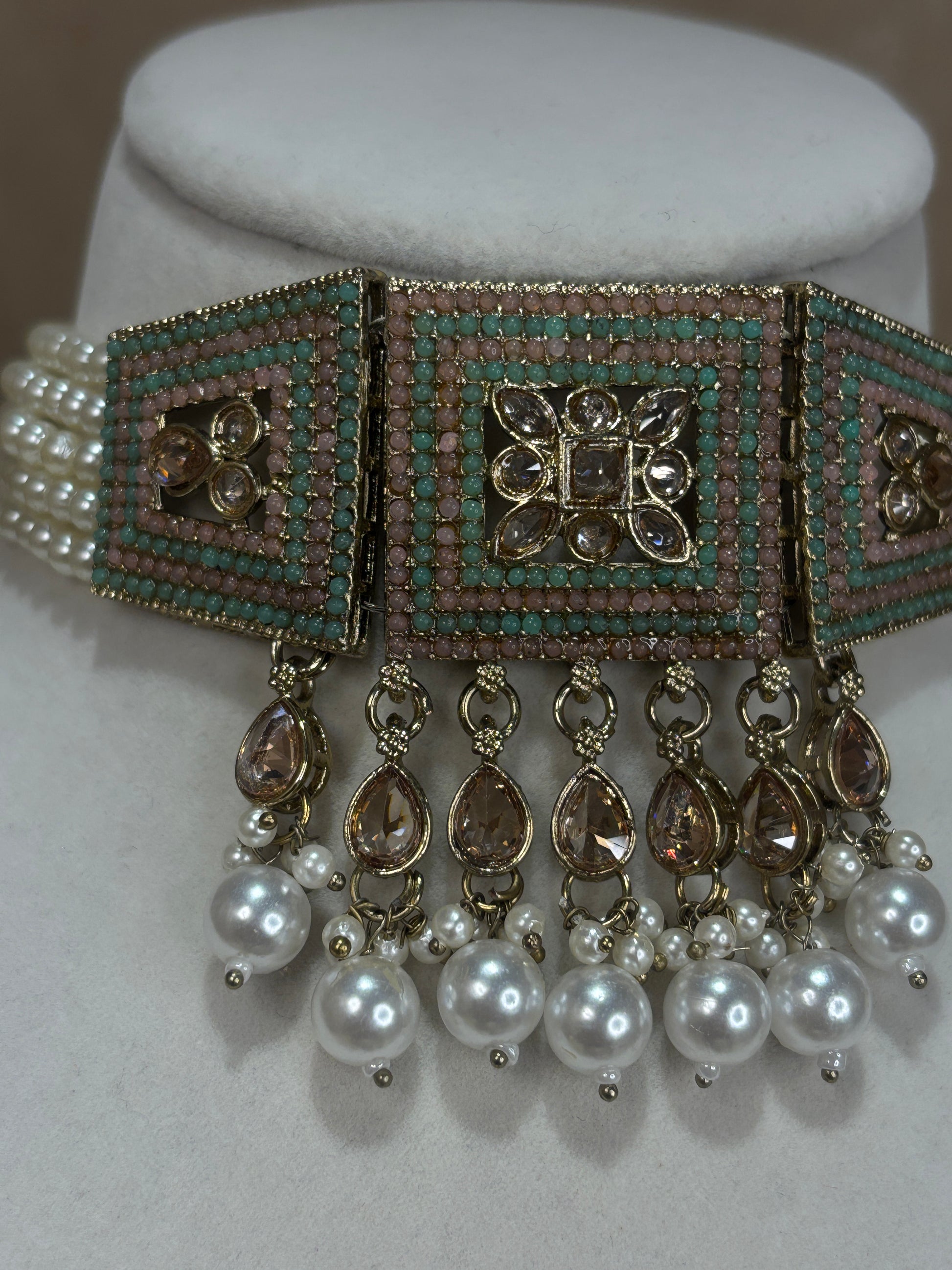 Mint green and baby pink detail choker set with small pearls; comes with earrings, tikka and passa