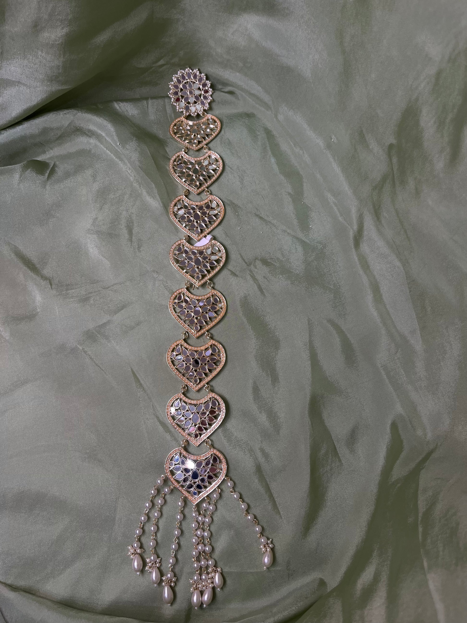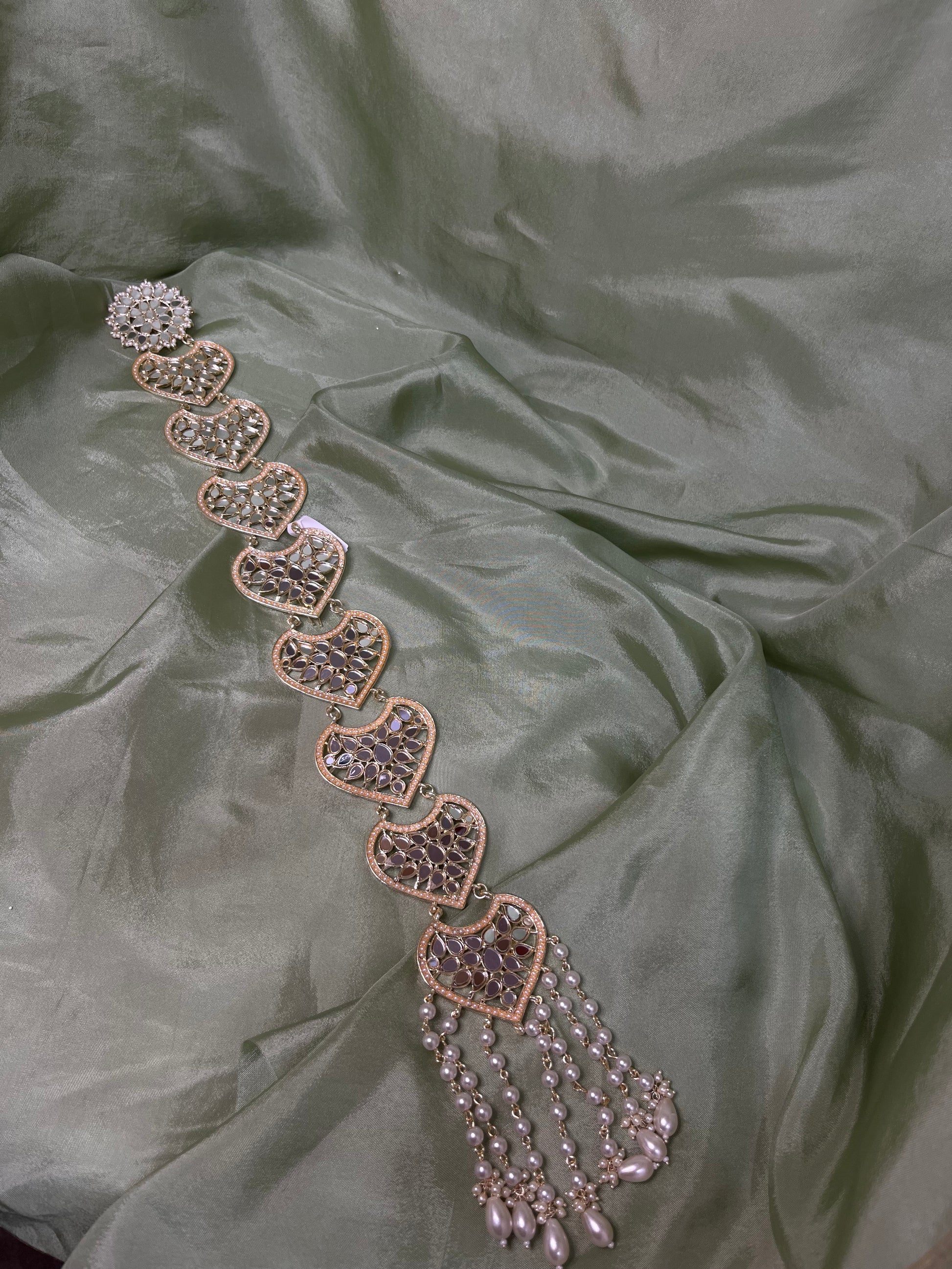 White kundan and mirror work braid accessory, has clips on the back to secure onto hair.