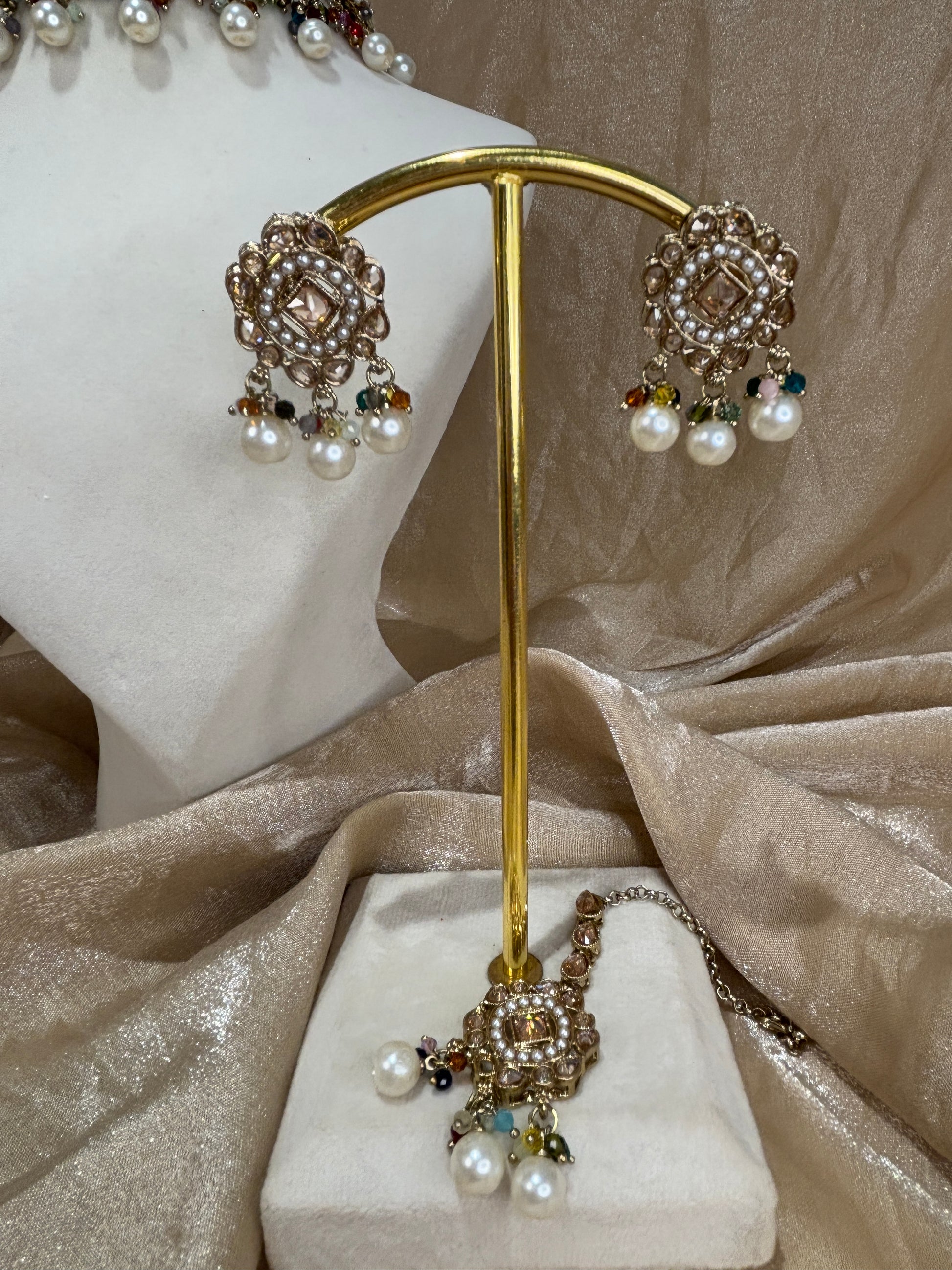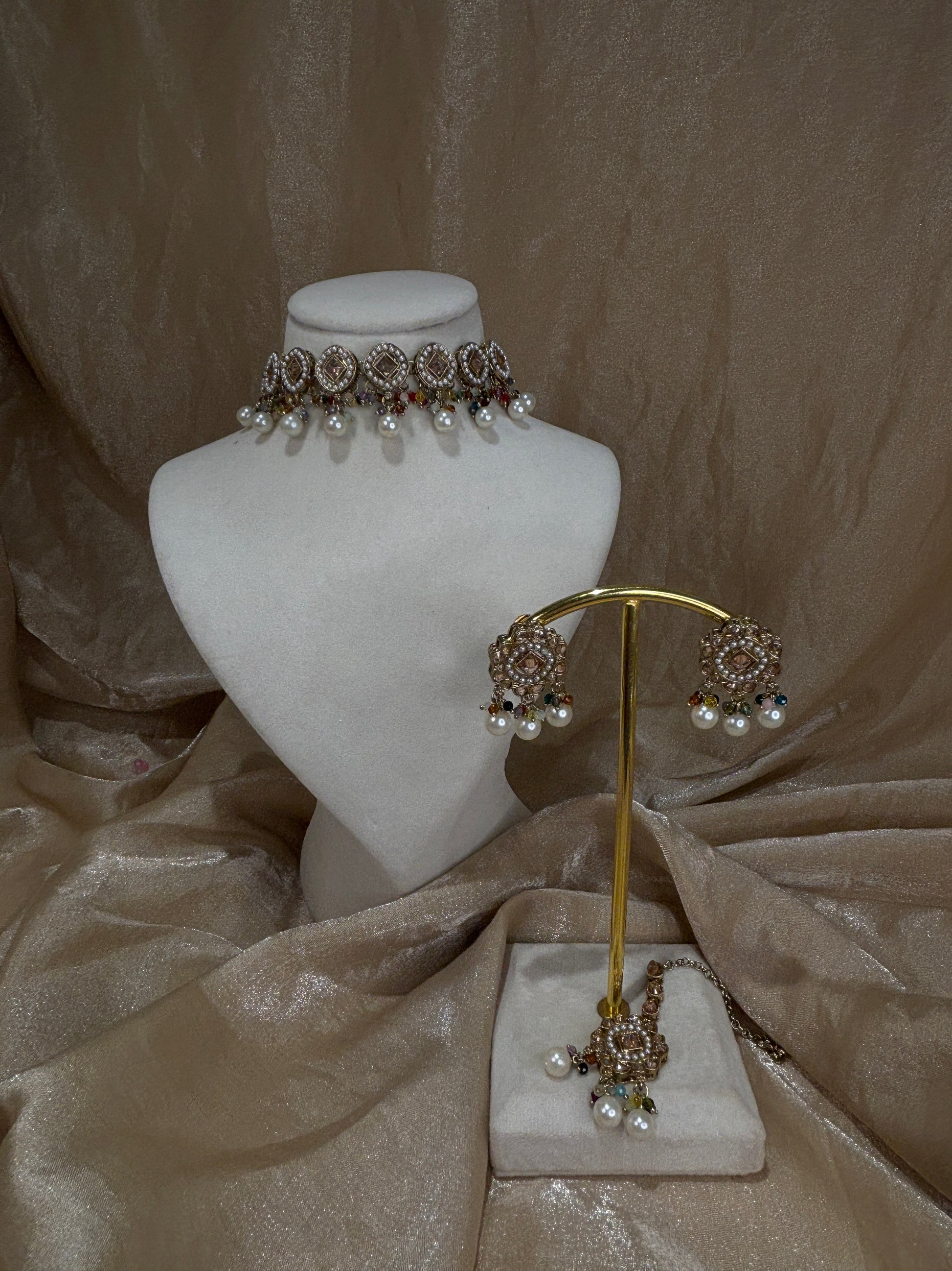 Multi-colour choker with pearl details; comes with small studs and tikka