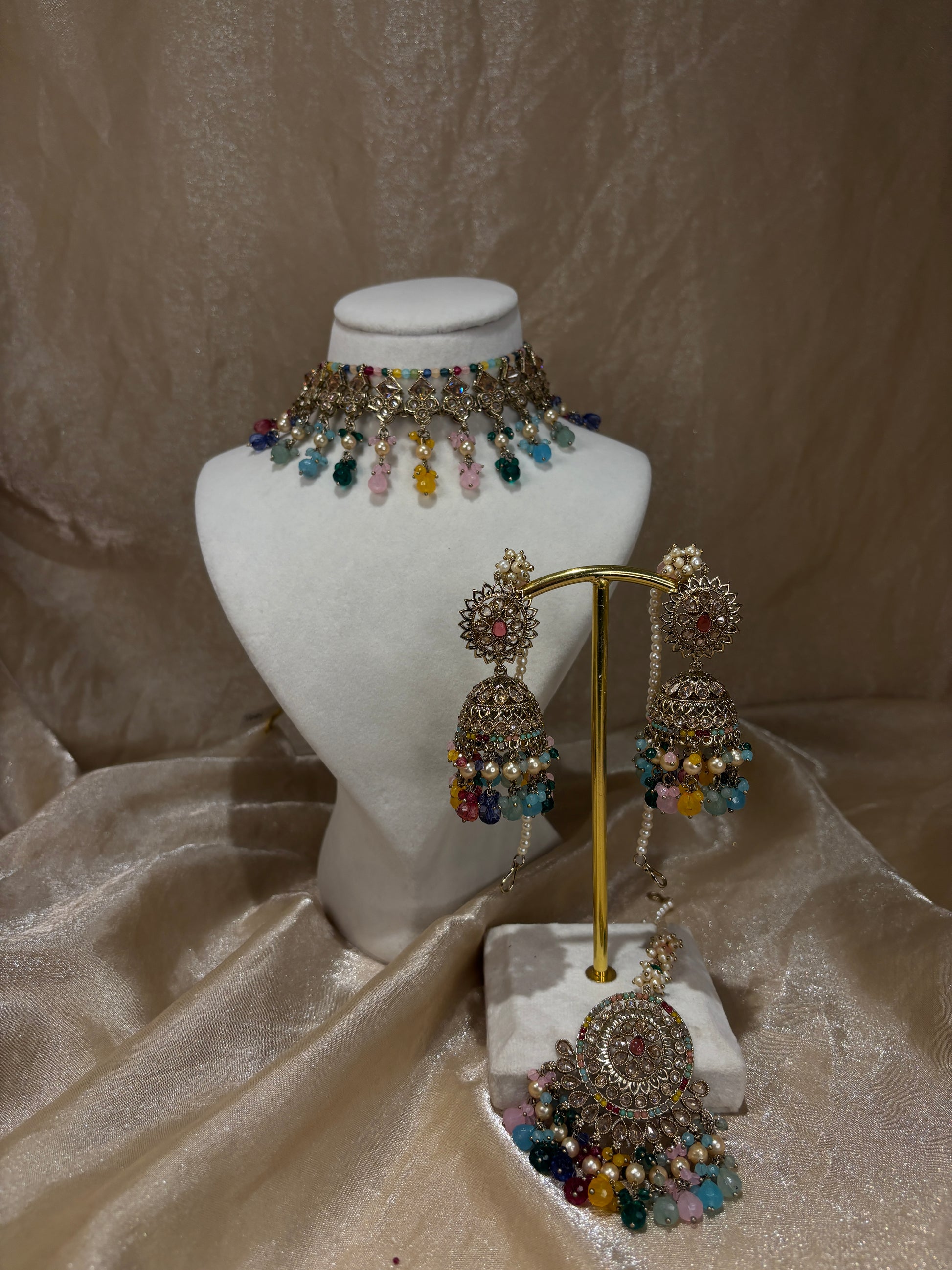 Multi-coloured set with small pearl details; can be worn as a necklace and choker
