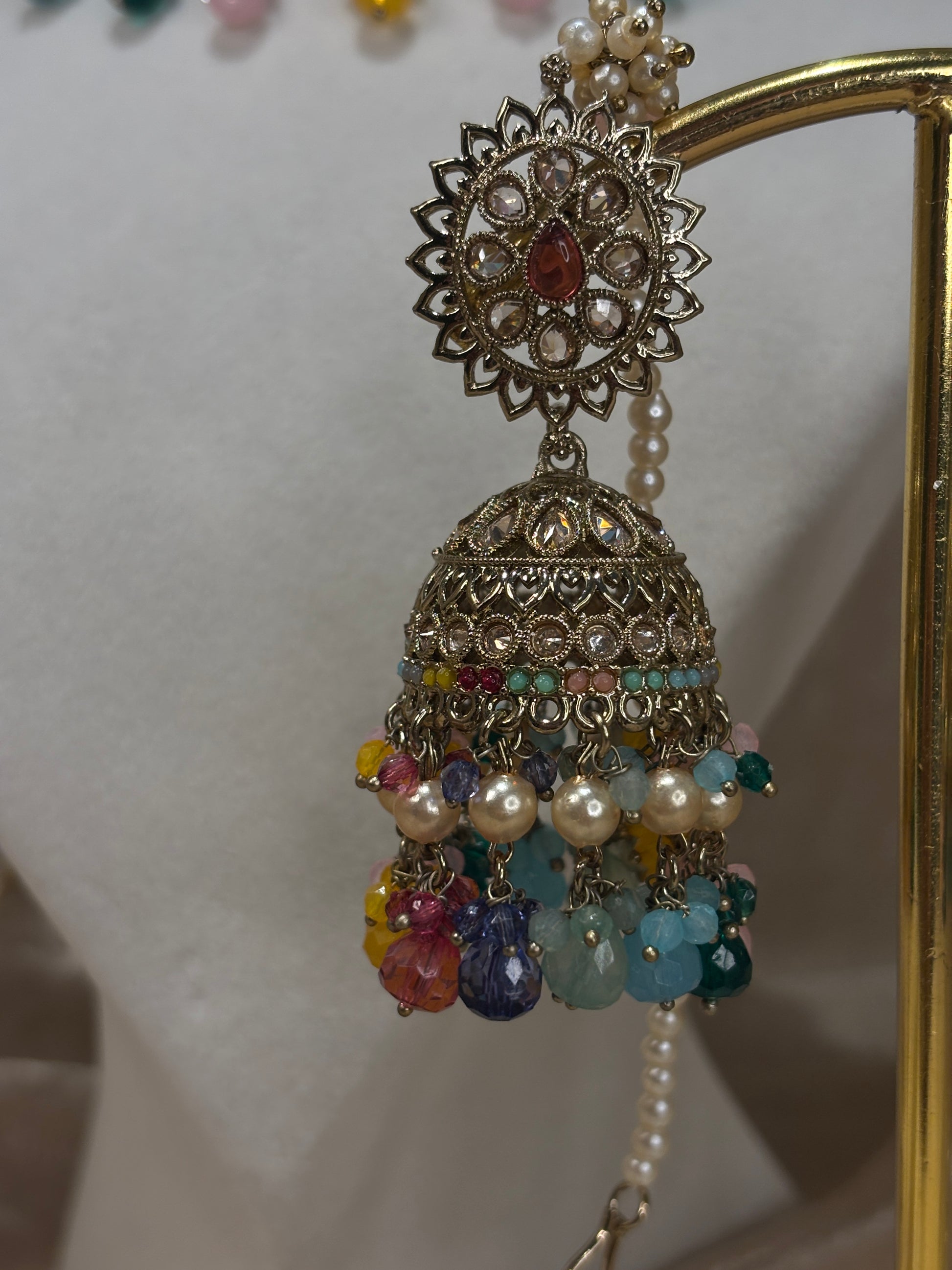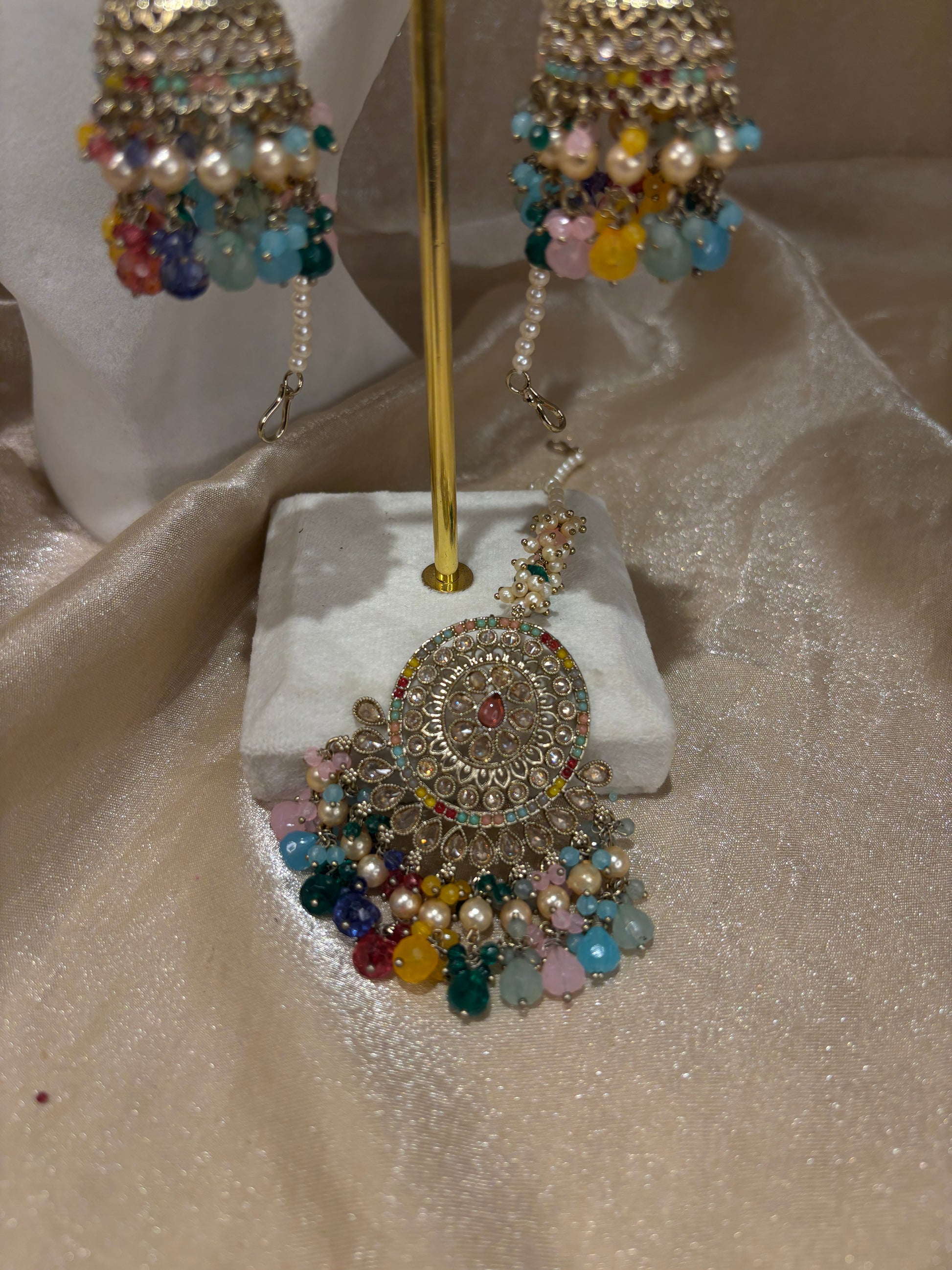 comes with jhumki earrings (With over the ear sahare) and oversized tikka
