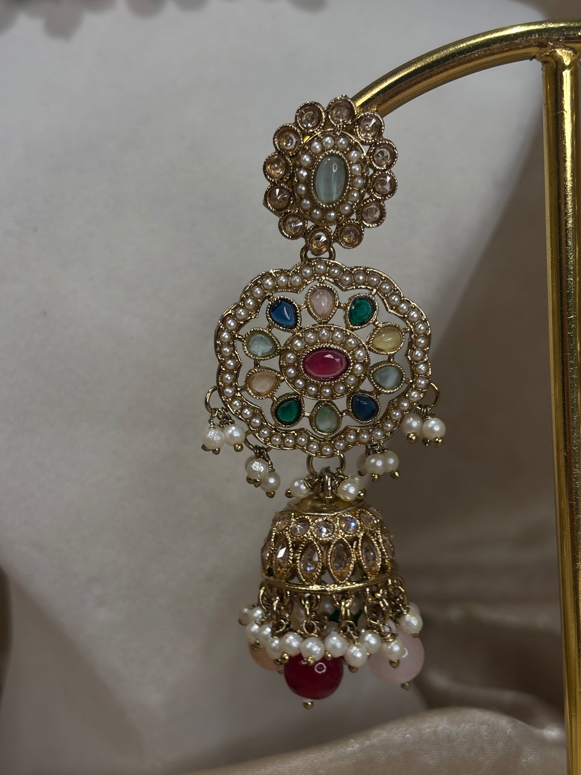 multi-coloured choker set with small pearl details; comes with jhumki earrings and tikka