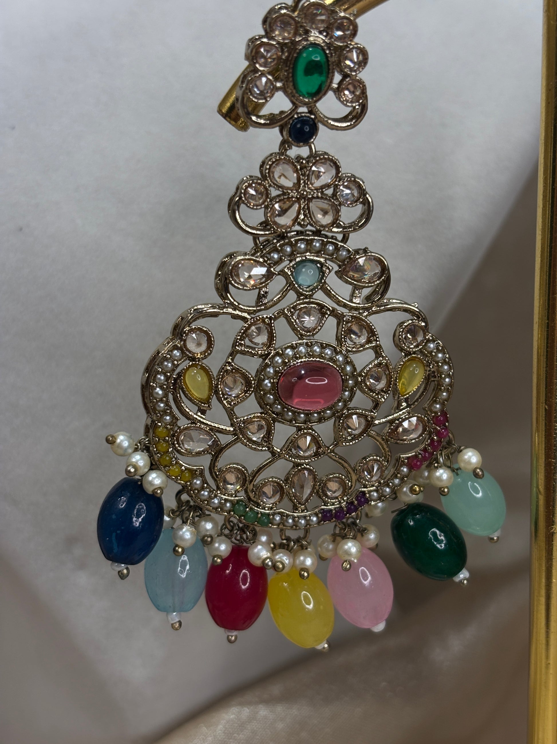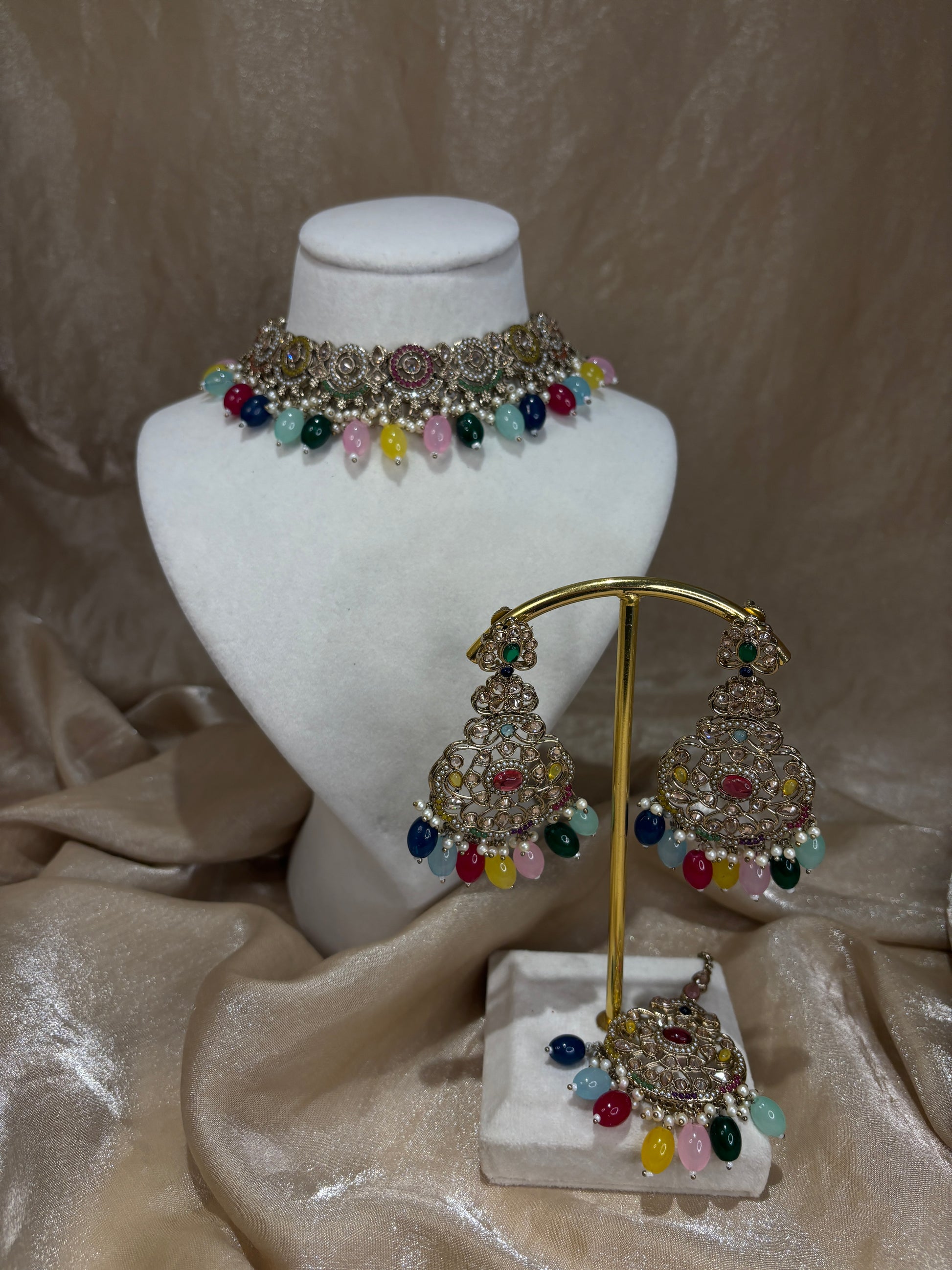 Multi-coloured choker with pearl details; can also be worn as a necklace