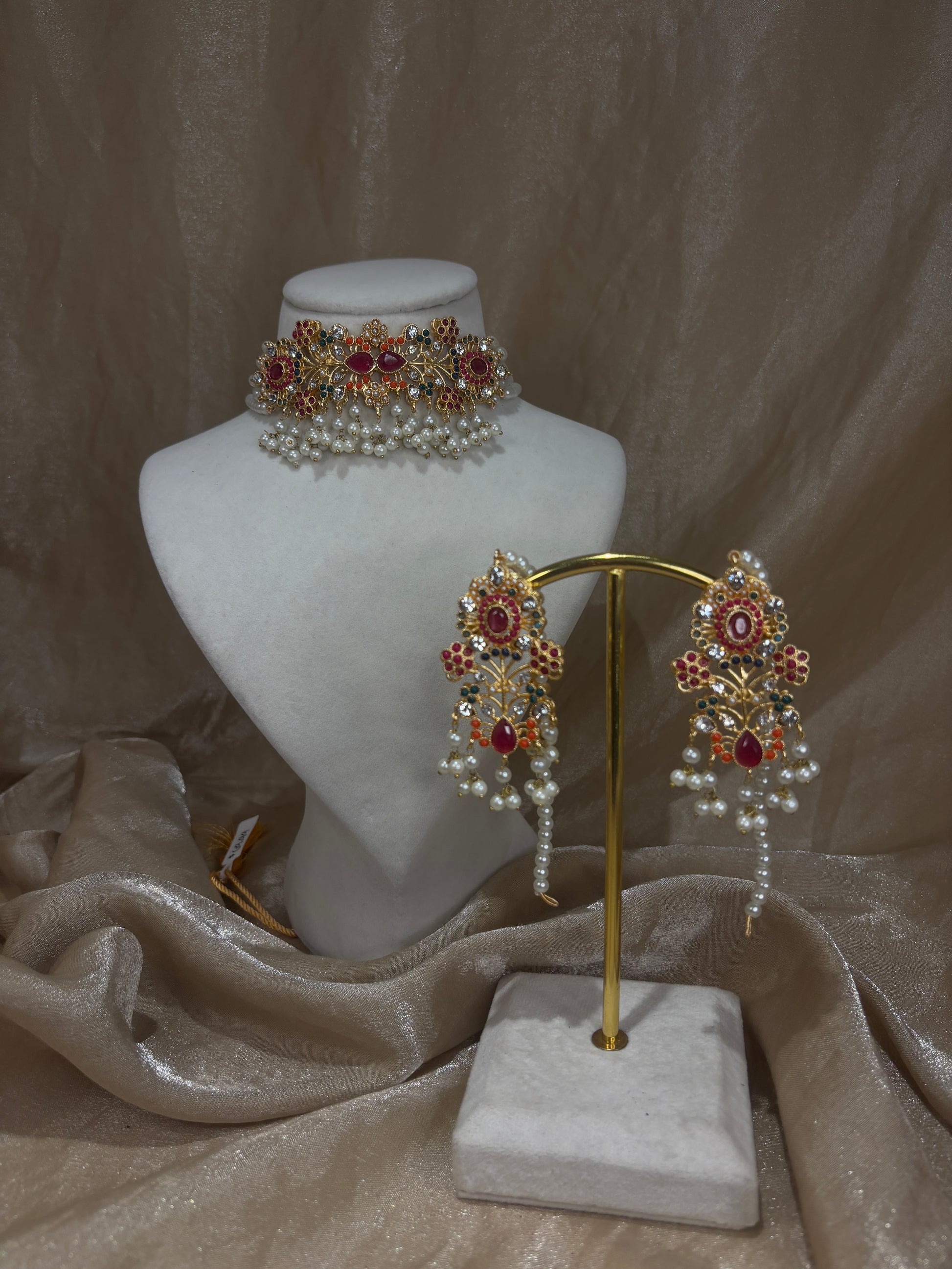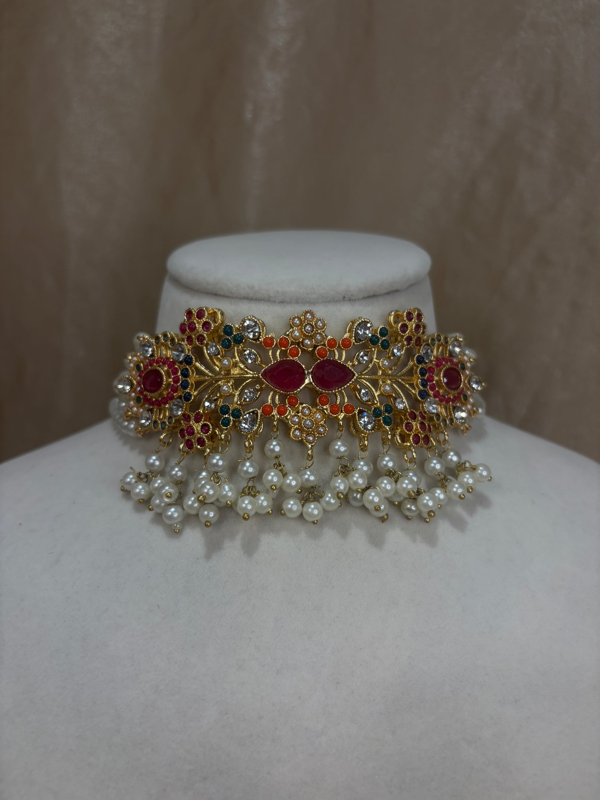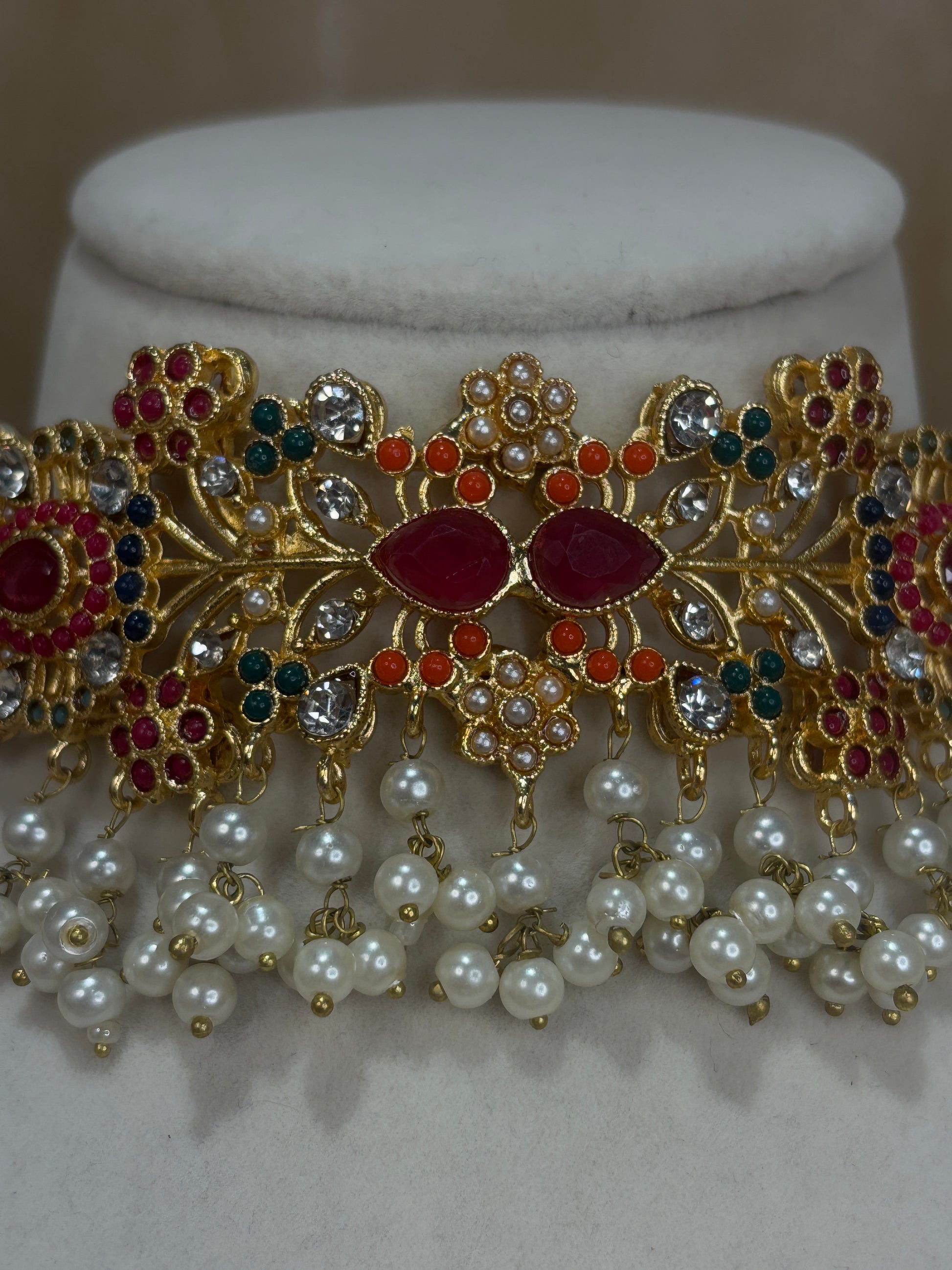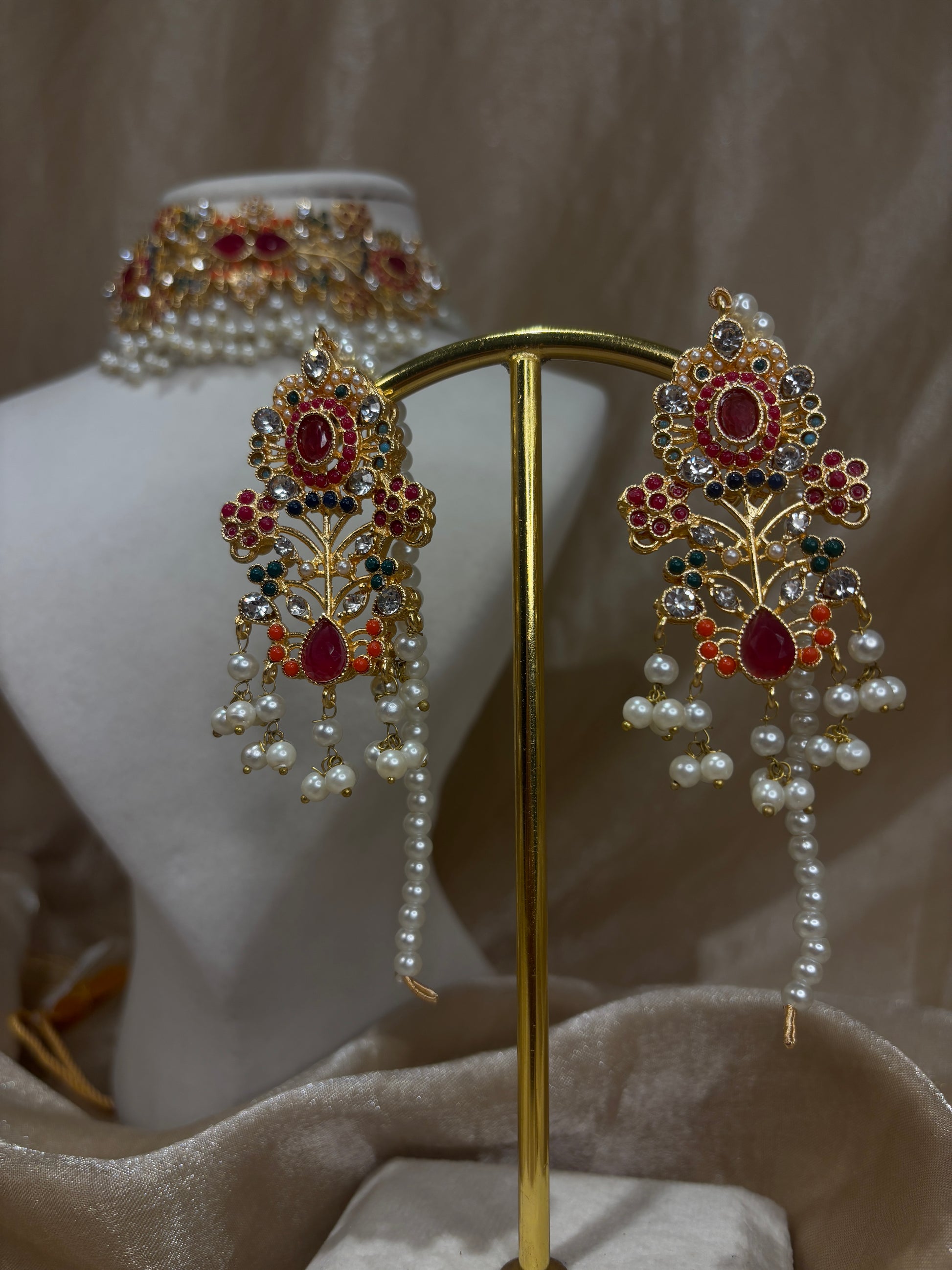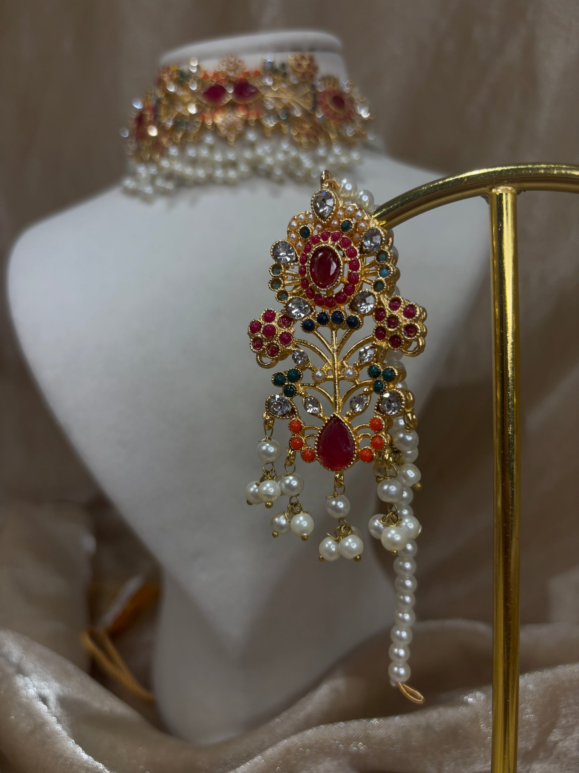 Multi-colour Pakistani nav rattan set with earrings (with over the ear sahare) and tikka