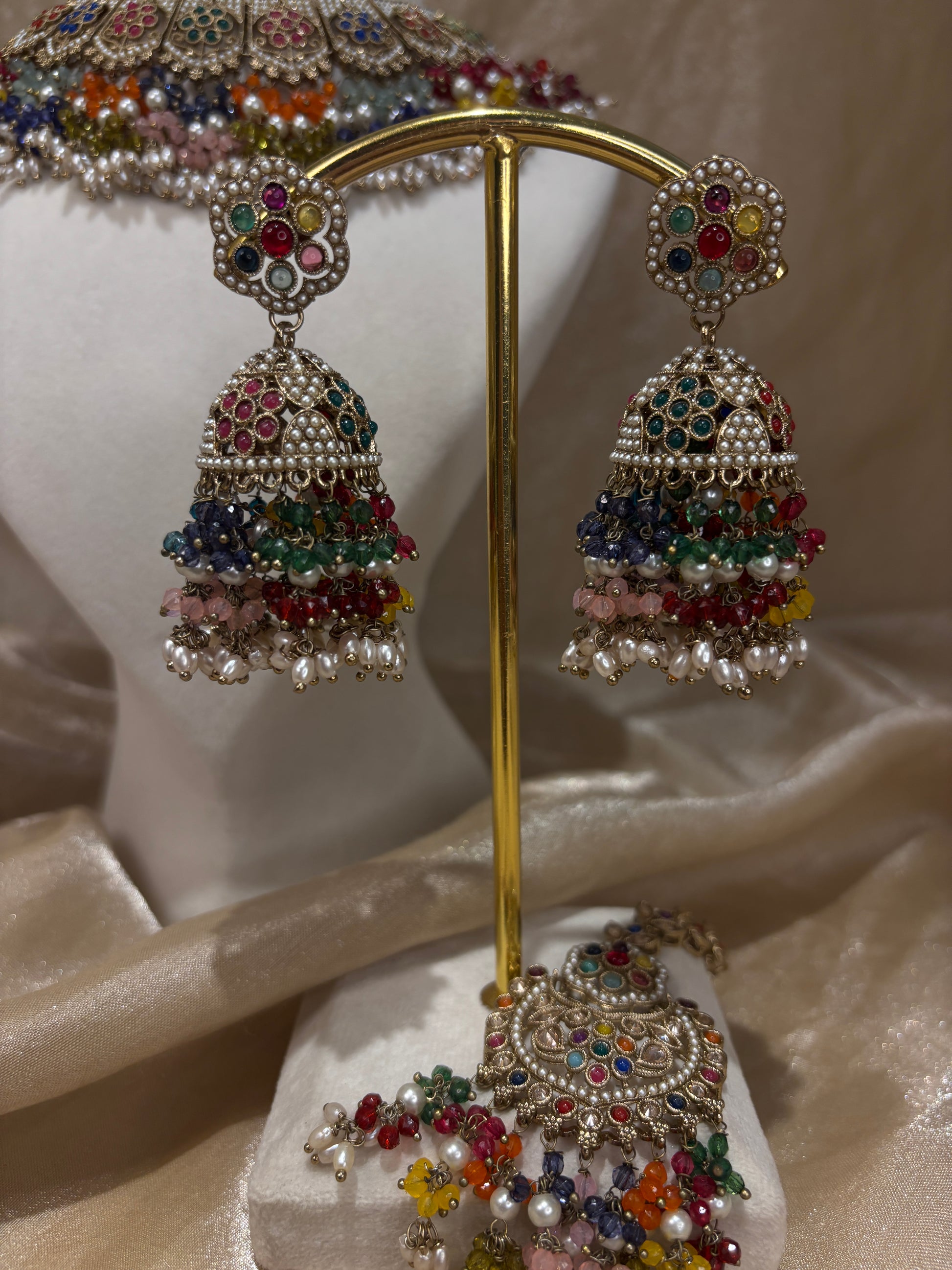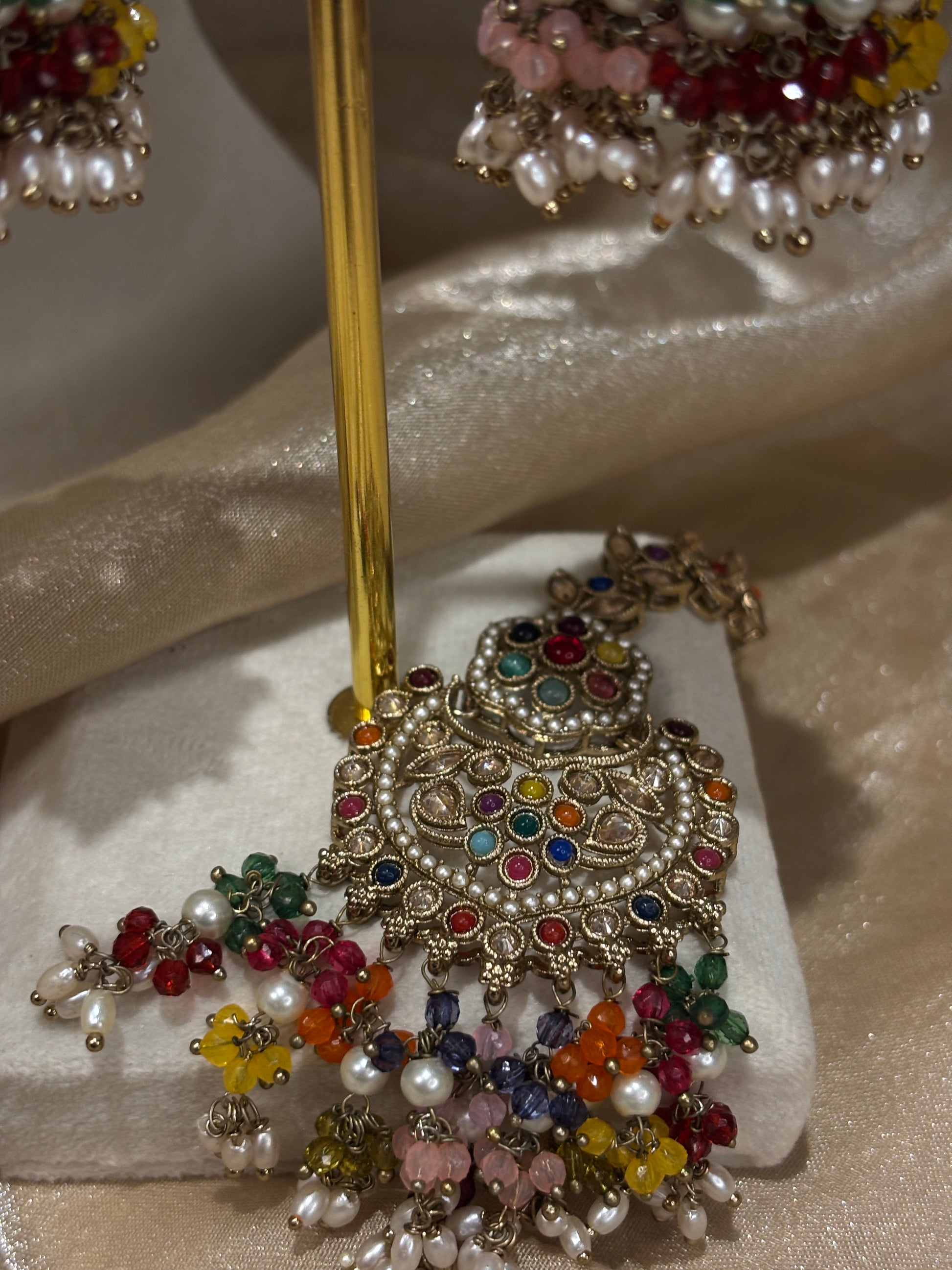 multi-coloured statement necklace with pearl details; comes with jhumki earrings and statement tikka