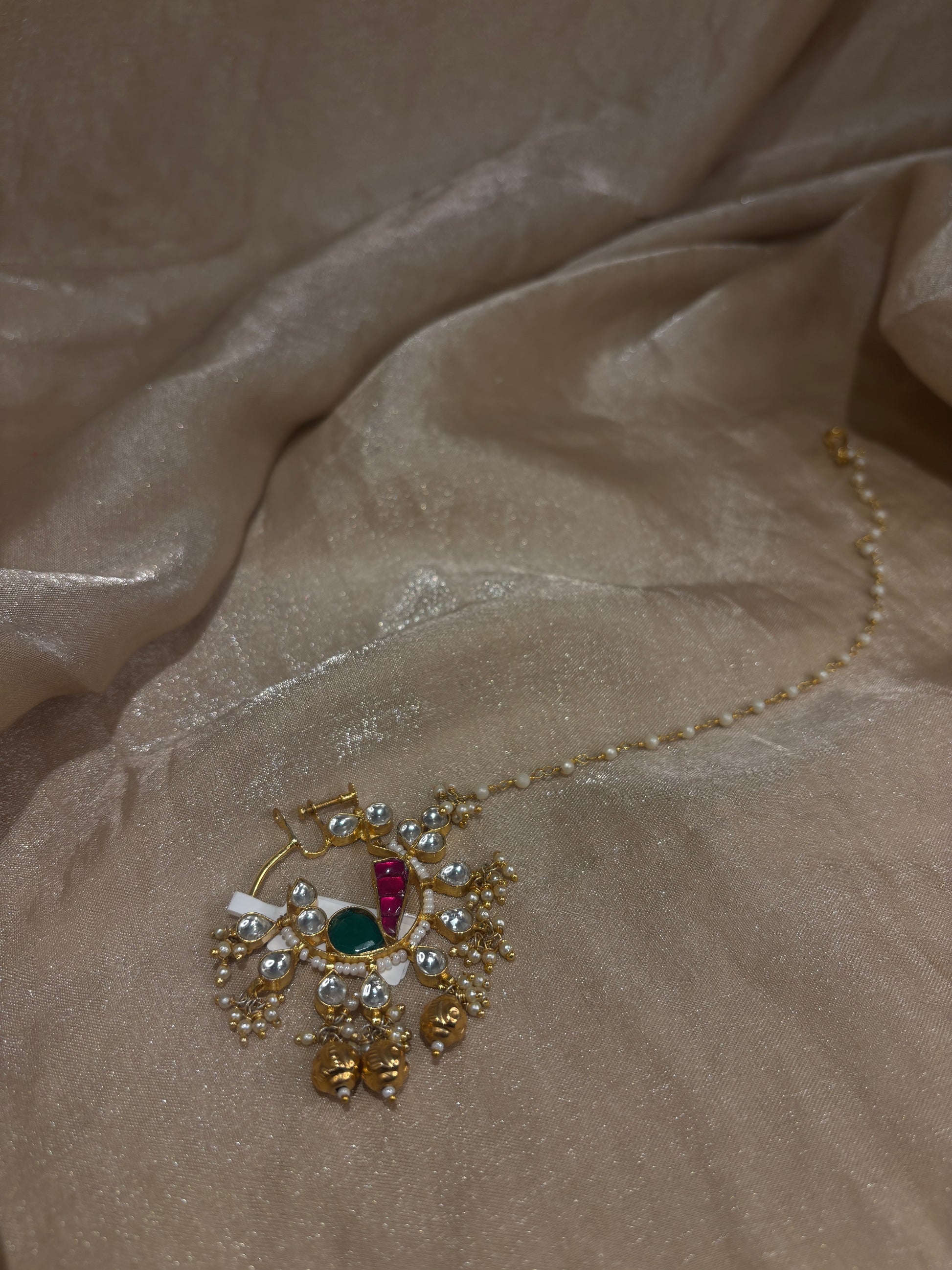 Statement 22k gold plated ahmedabadi pachi kundan nose ring with emerald green and maroon details; about 2.5 inches in diameter