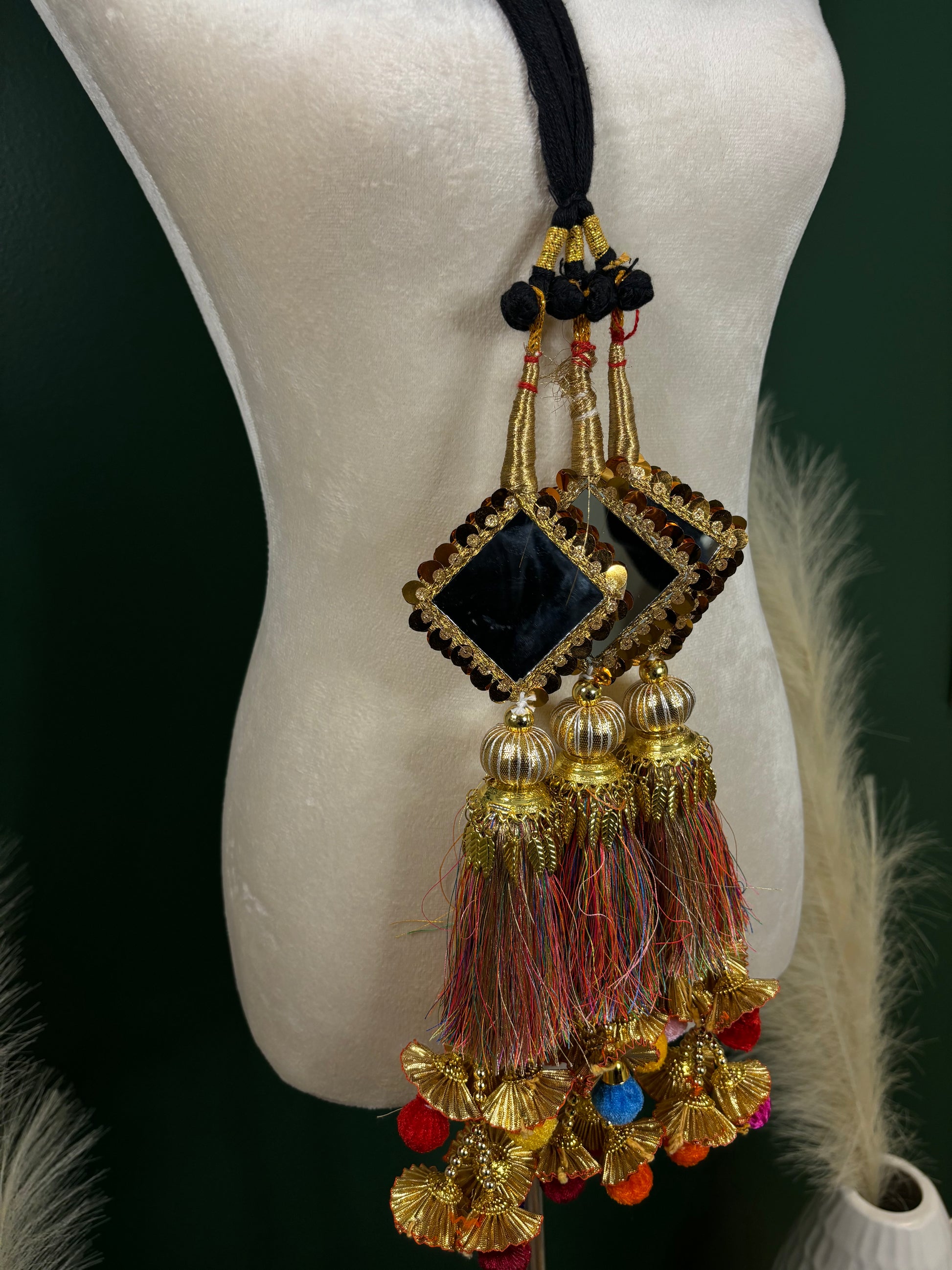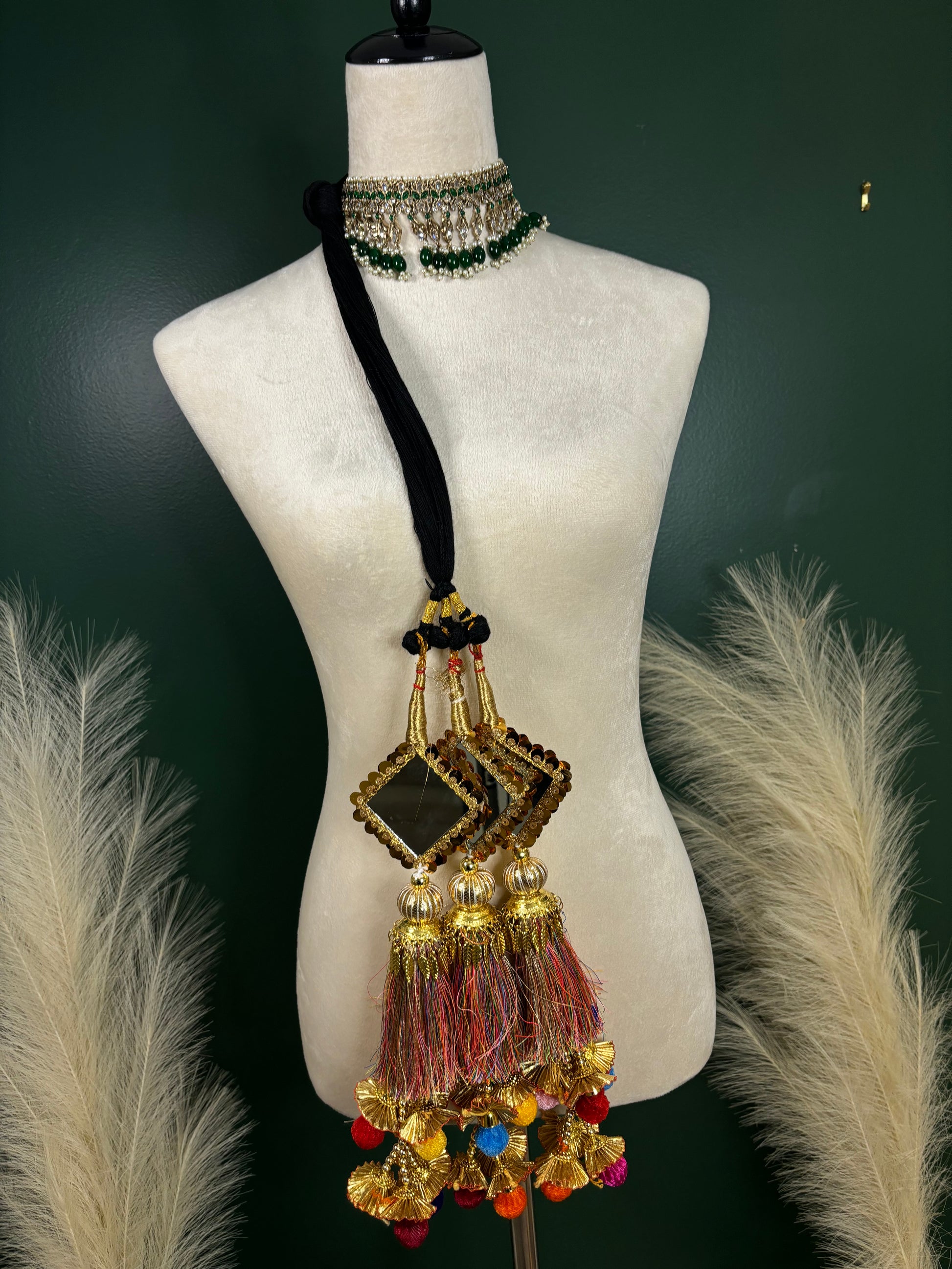 Transitional multi-colour parandi with diamond mirrors; braided into hair