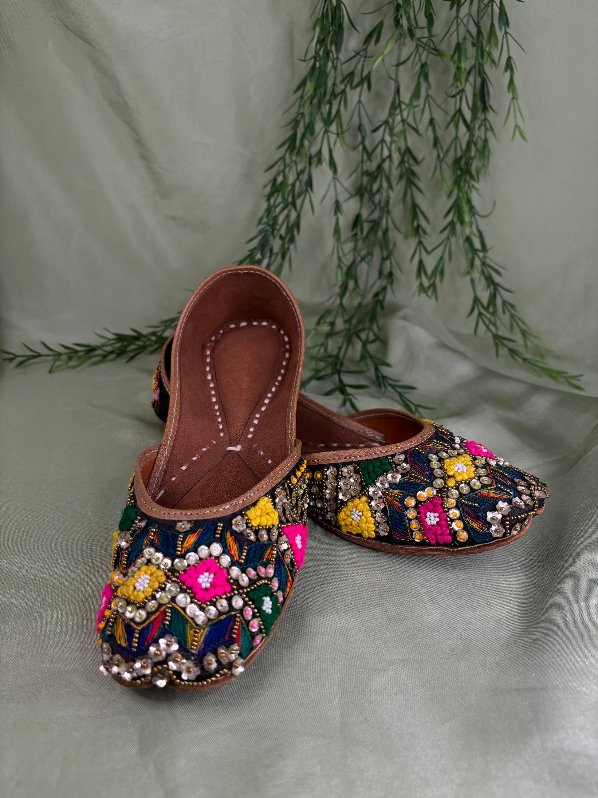 Abstract multi-colour jutti with thread and sequins work. All of our juttiyan are double padded for maximum comfort!