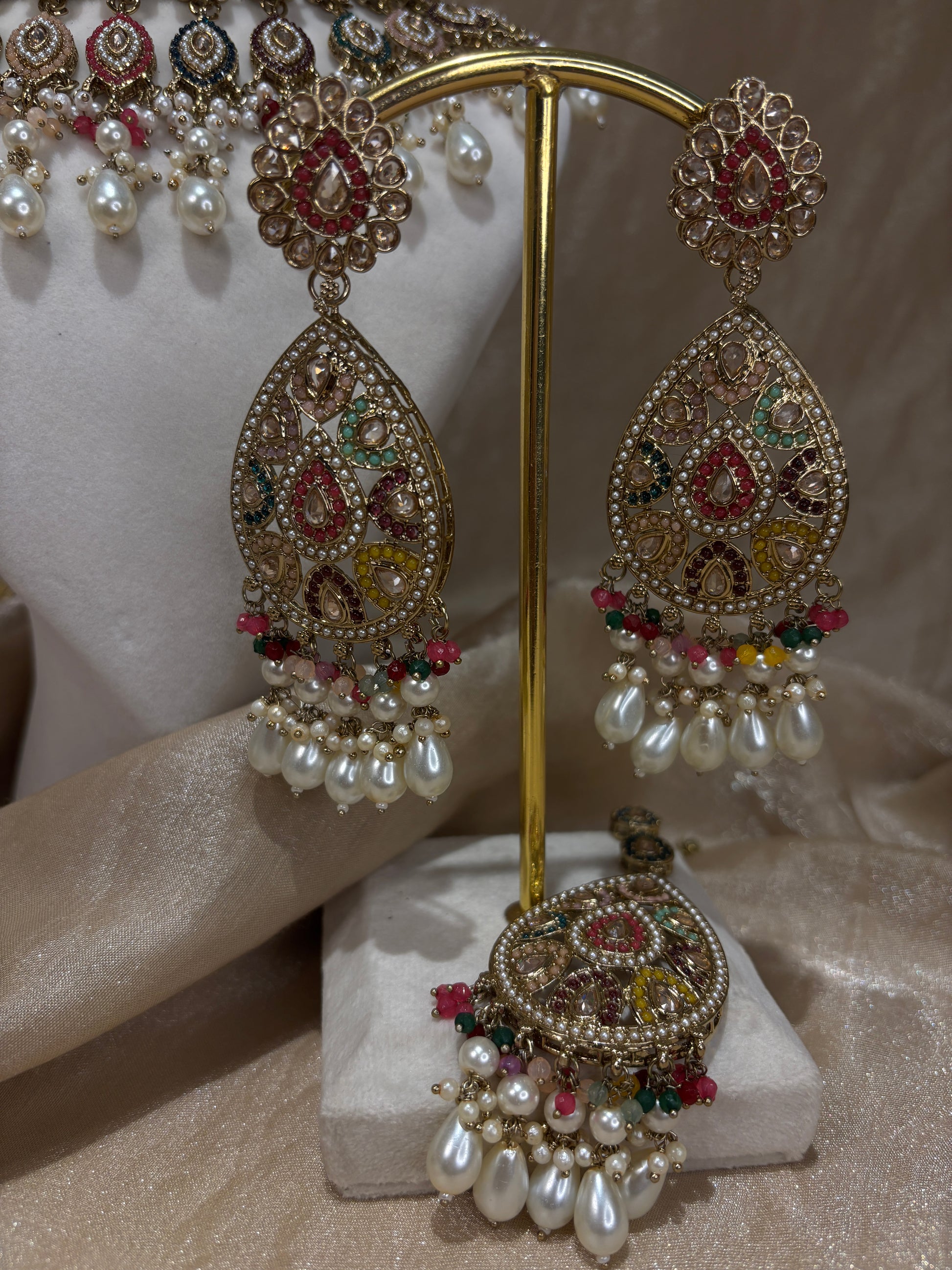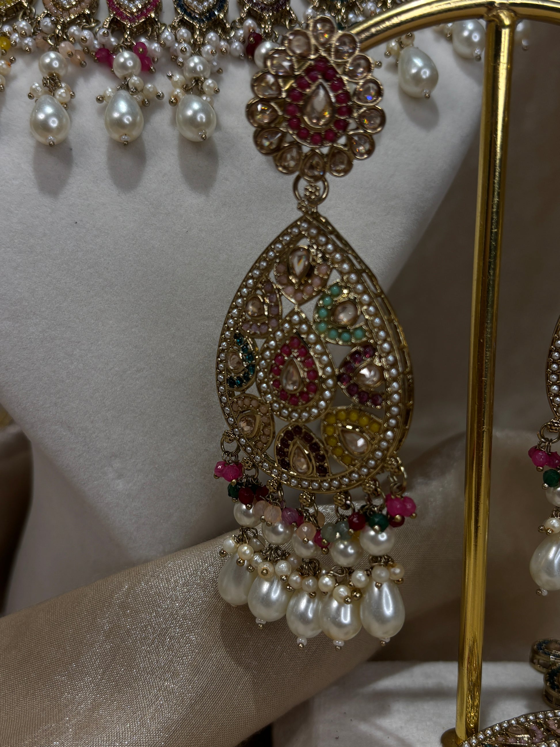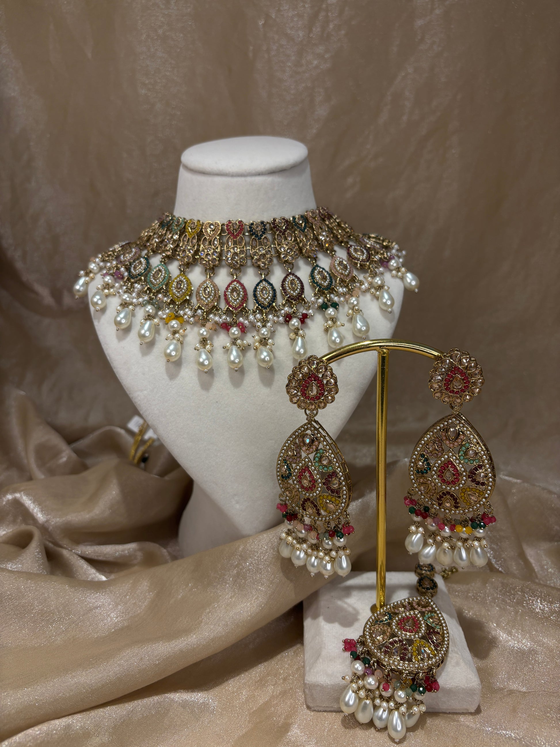 Multi-coloured statement choker with intricate pearl details; can also be worn as a necklace