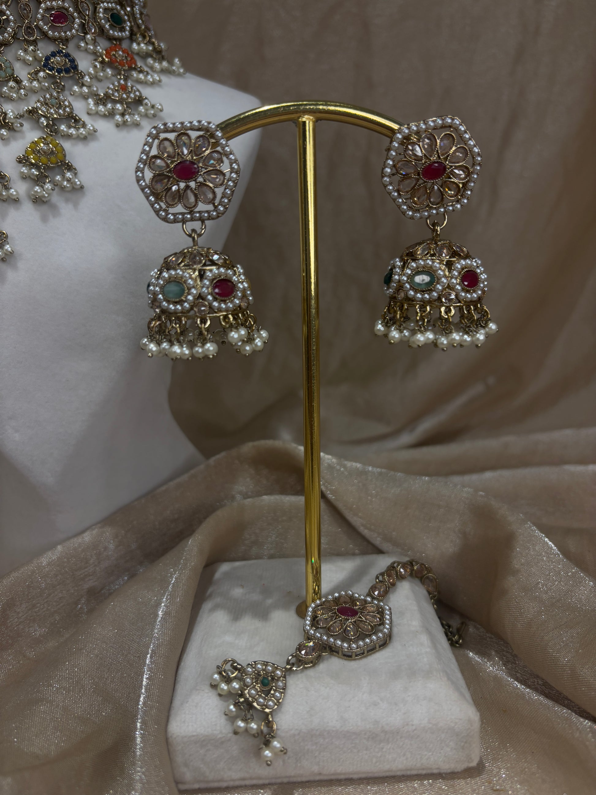 Multi colour choker in v-shape design with pearl details; comes with jhumki and tikka