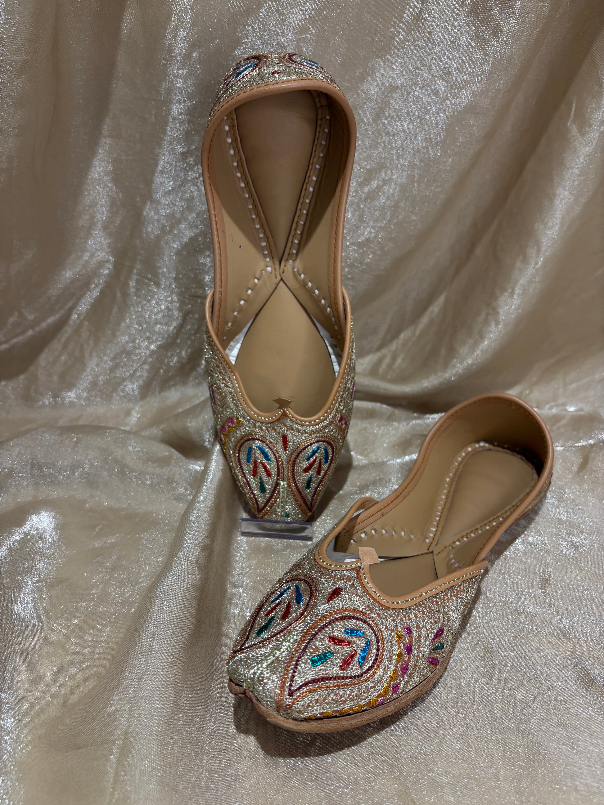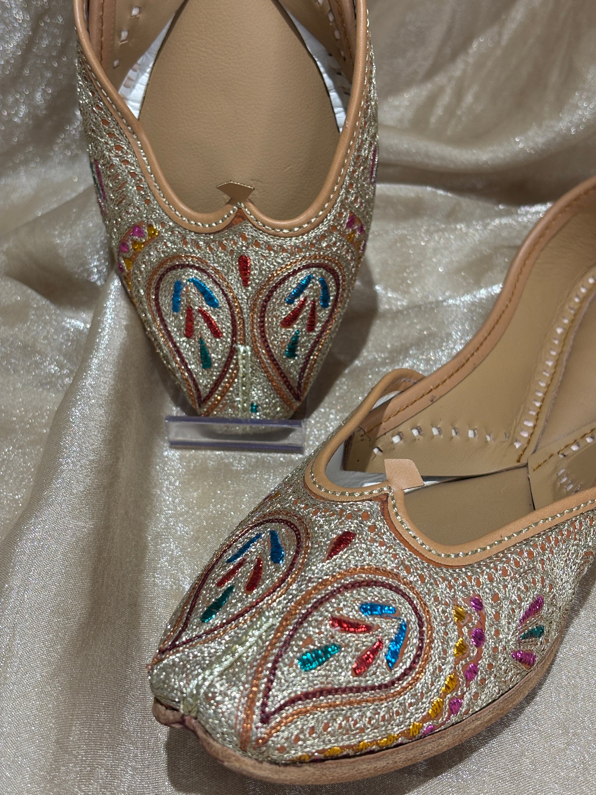 multi-coloured punjabi jutti with detailed embroidery; all juttis come with double padding for ultimate comfort