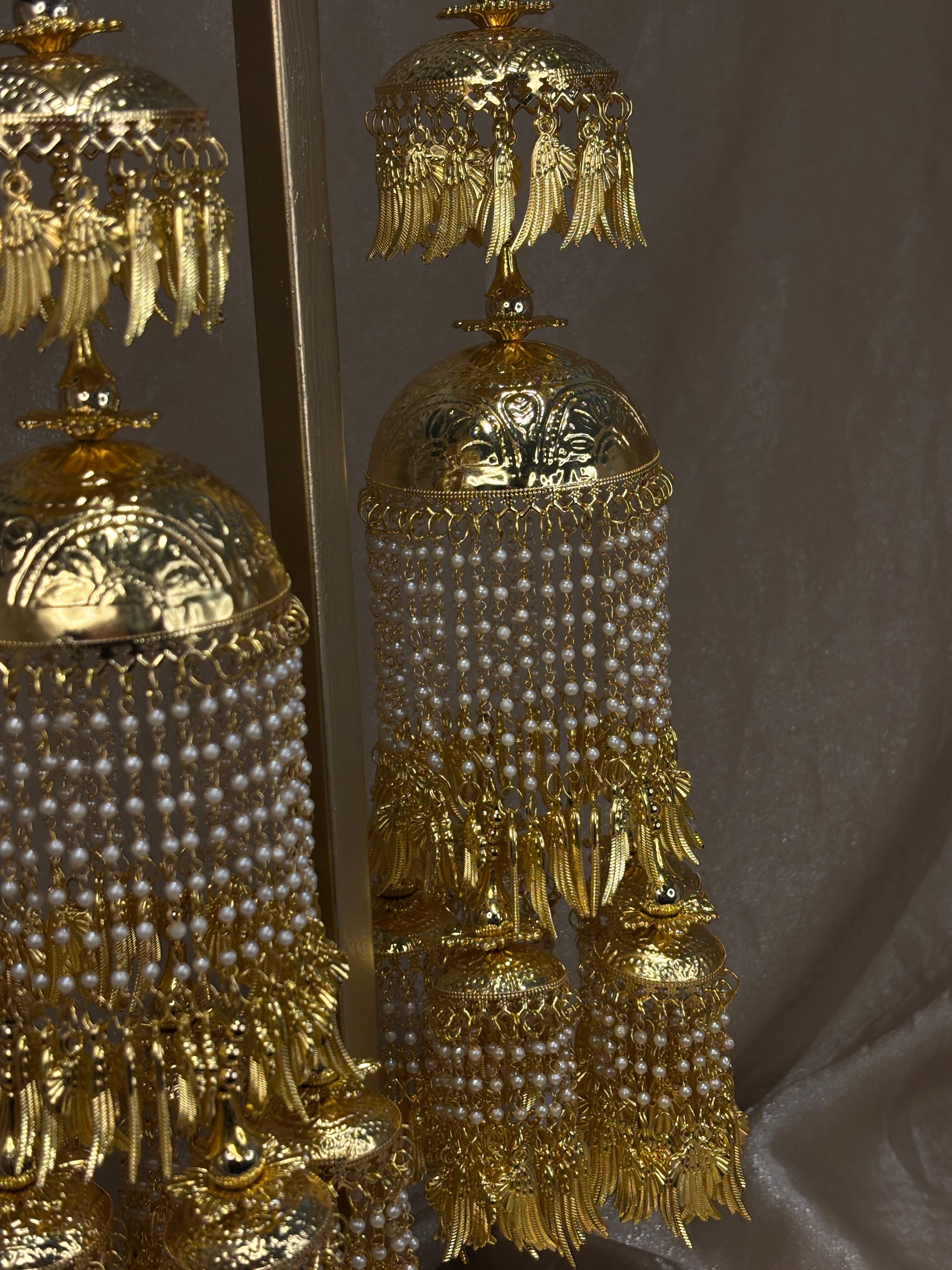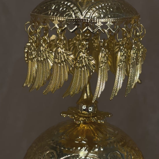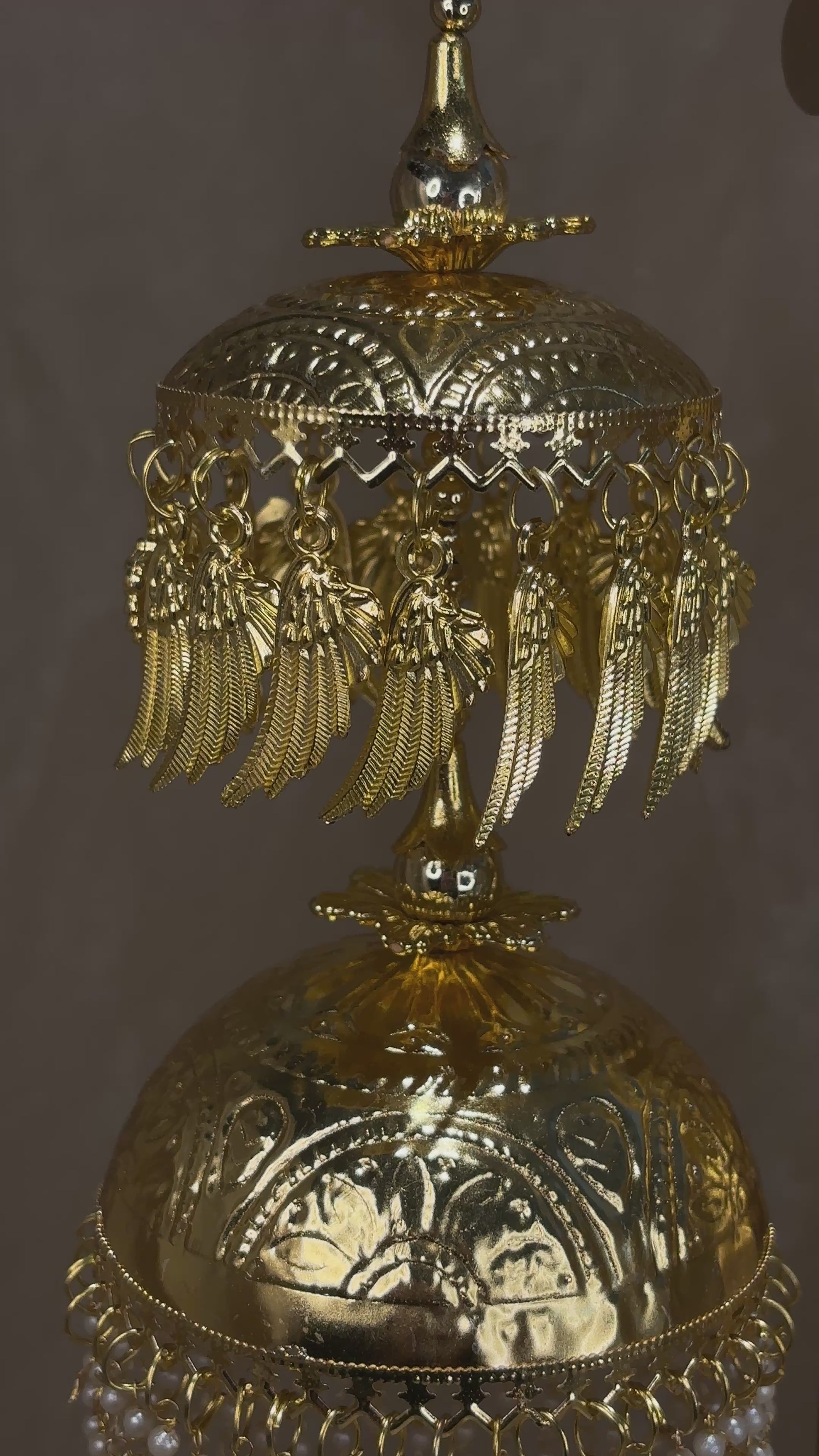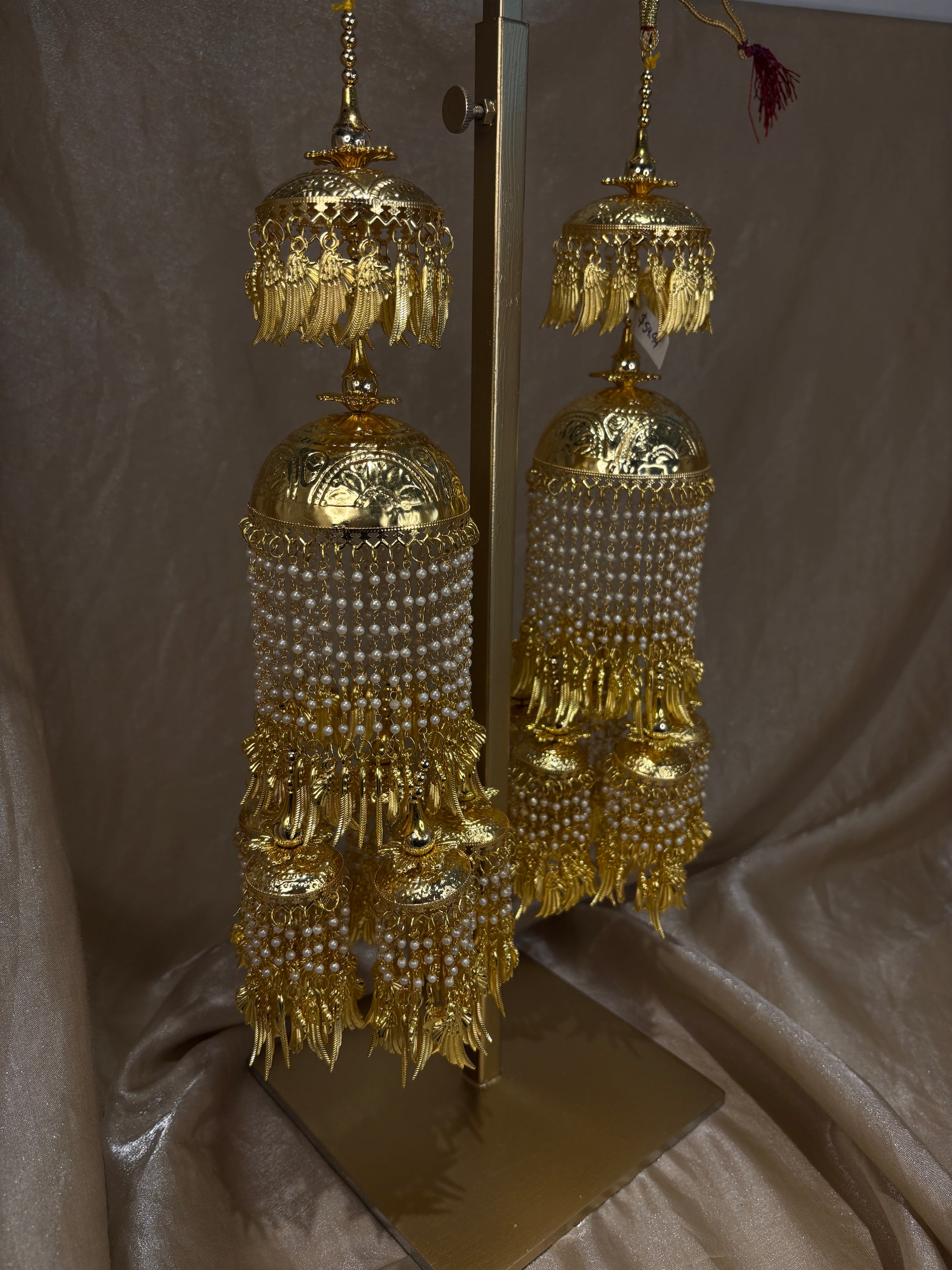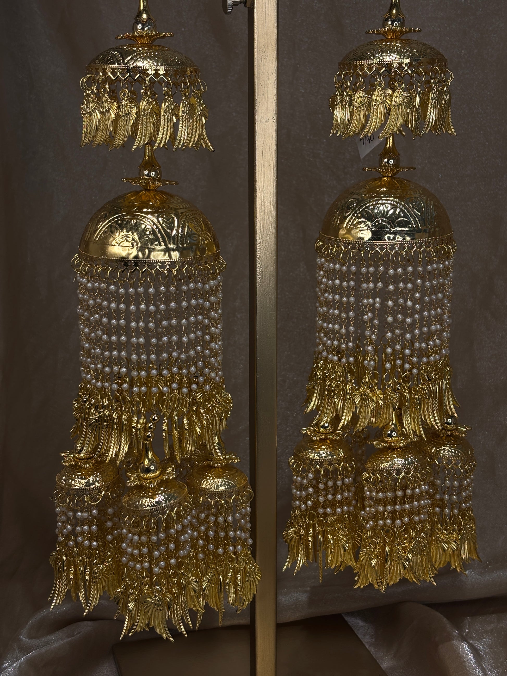 Statement pipal Patti kaleeray with pearl details; comes with adjustable string to attach to wrist. About 12 inches long.
