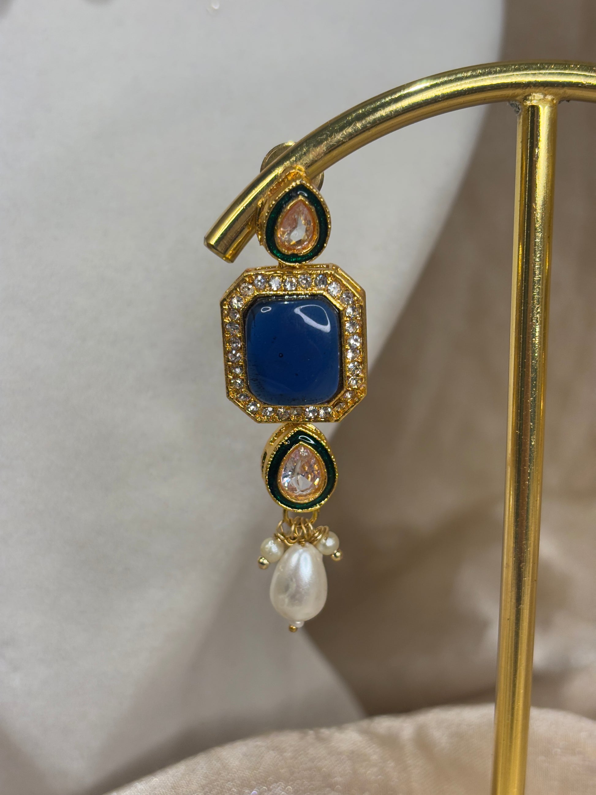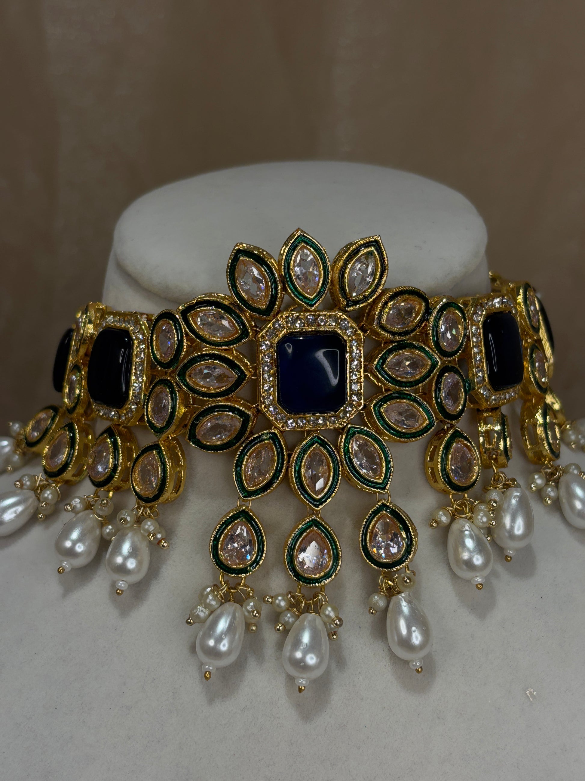 Navy blue Mona Lisa choker set with pearl details; comes with earrings and tikka