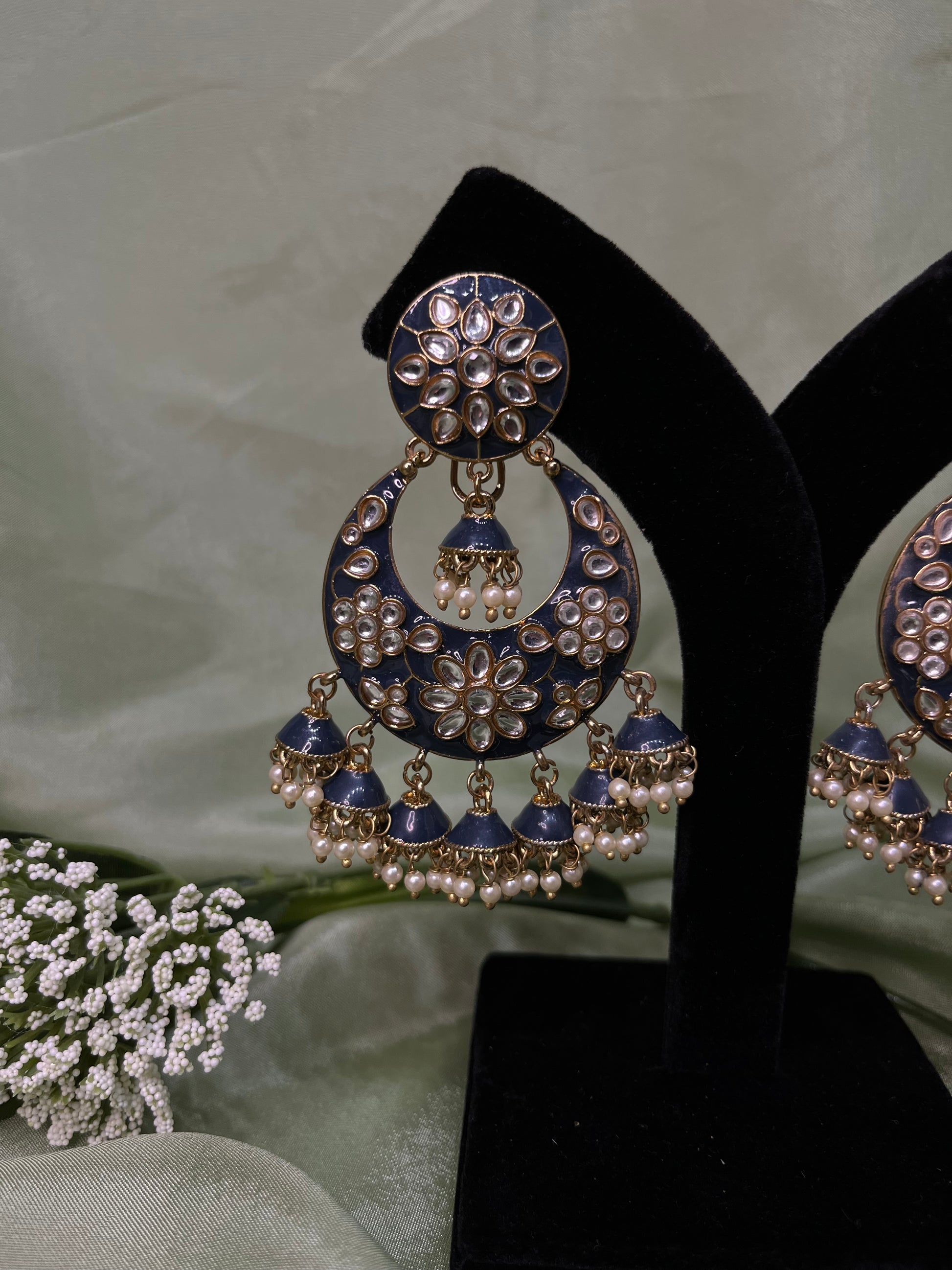Navy blue earrings with jhumki details.