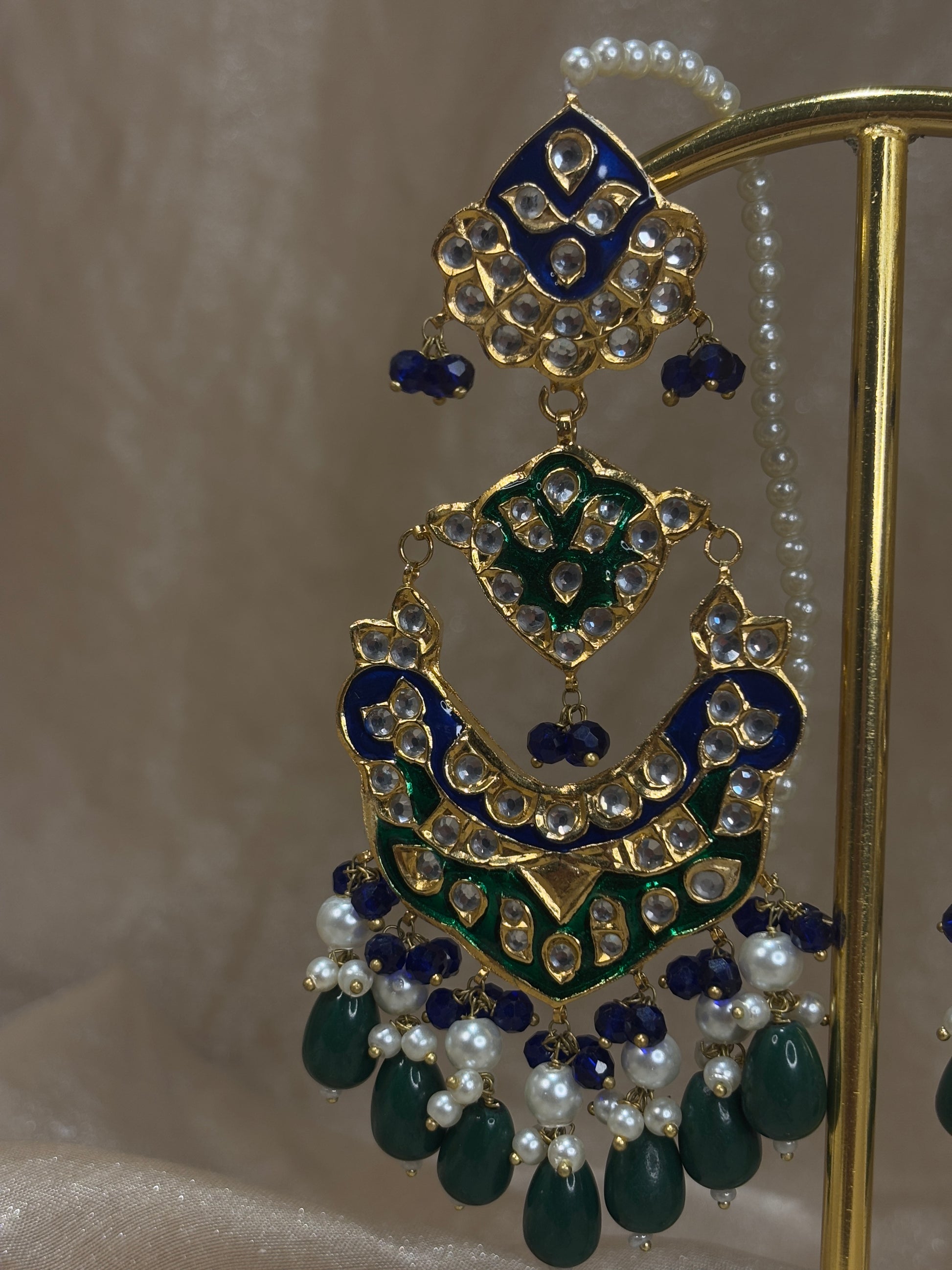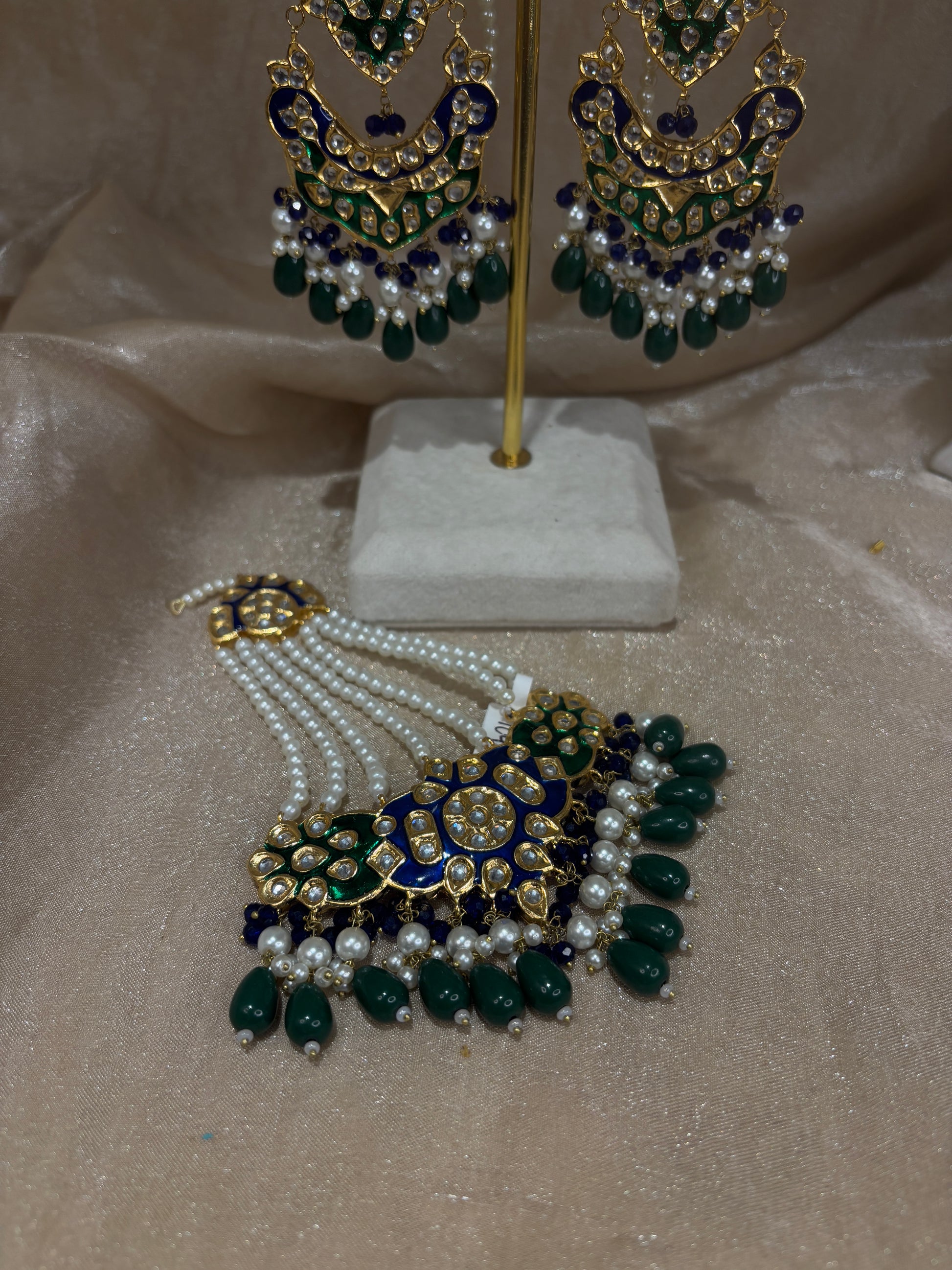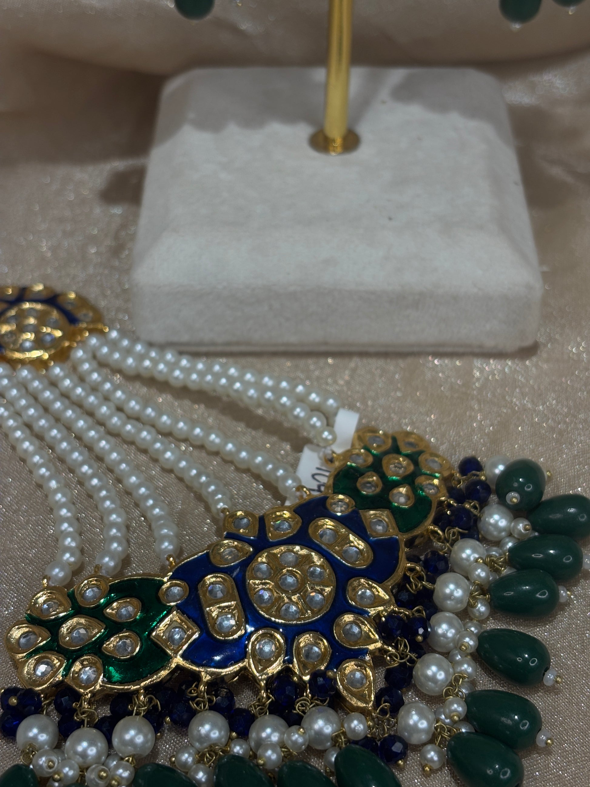Navy blue/emerald green 22k gold plated Pakistani thappa kundan; comes with earrings (with over the ear sahare) and passa