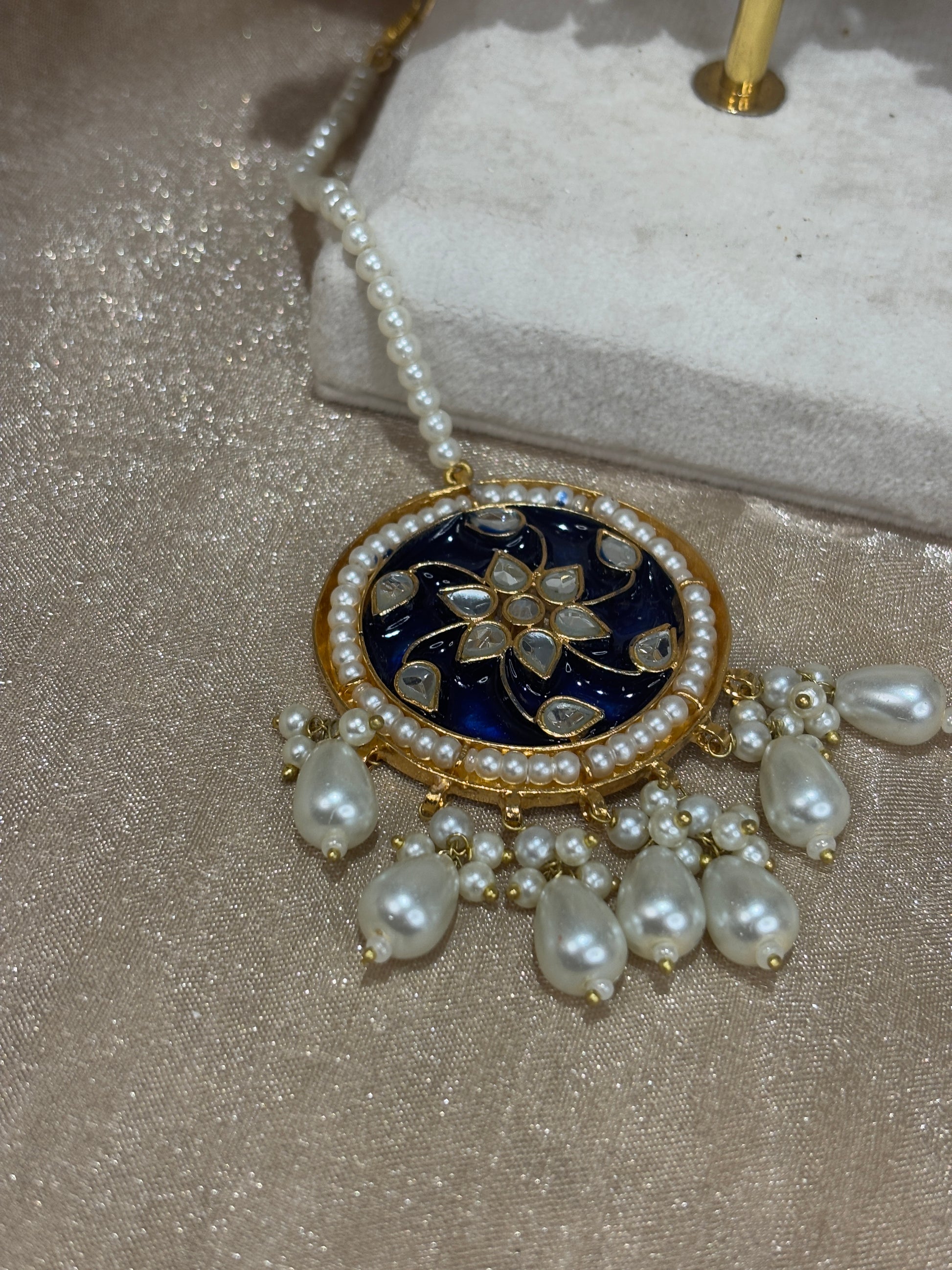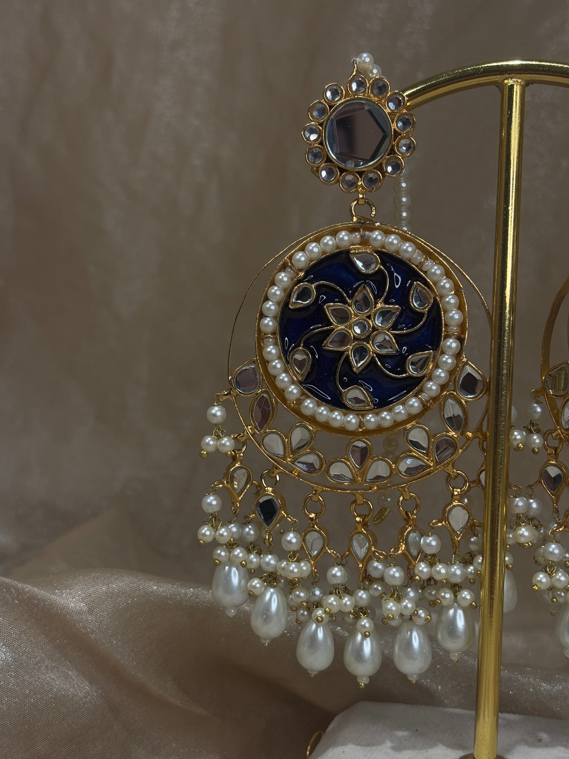 Navy blue 22k gold plated Pakistani farshi kundan statement earring and tikka set