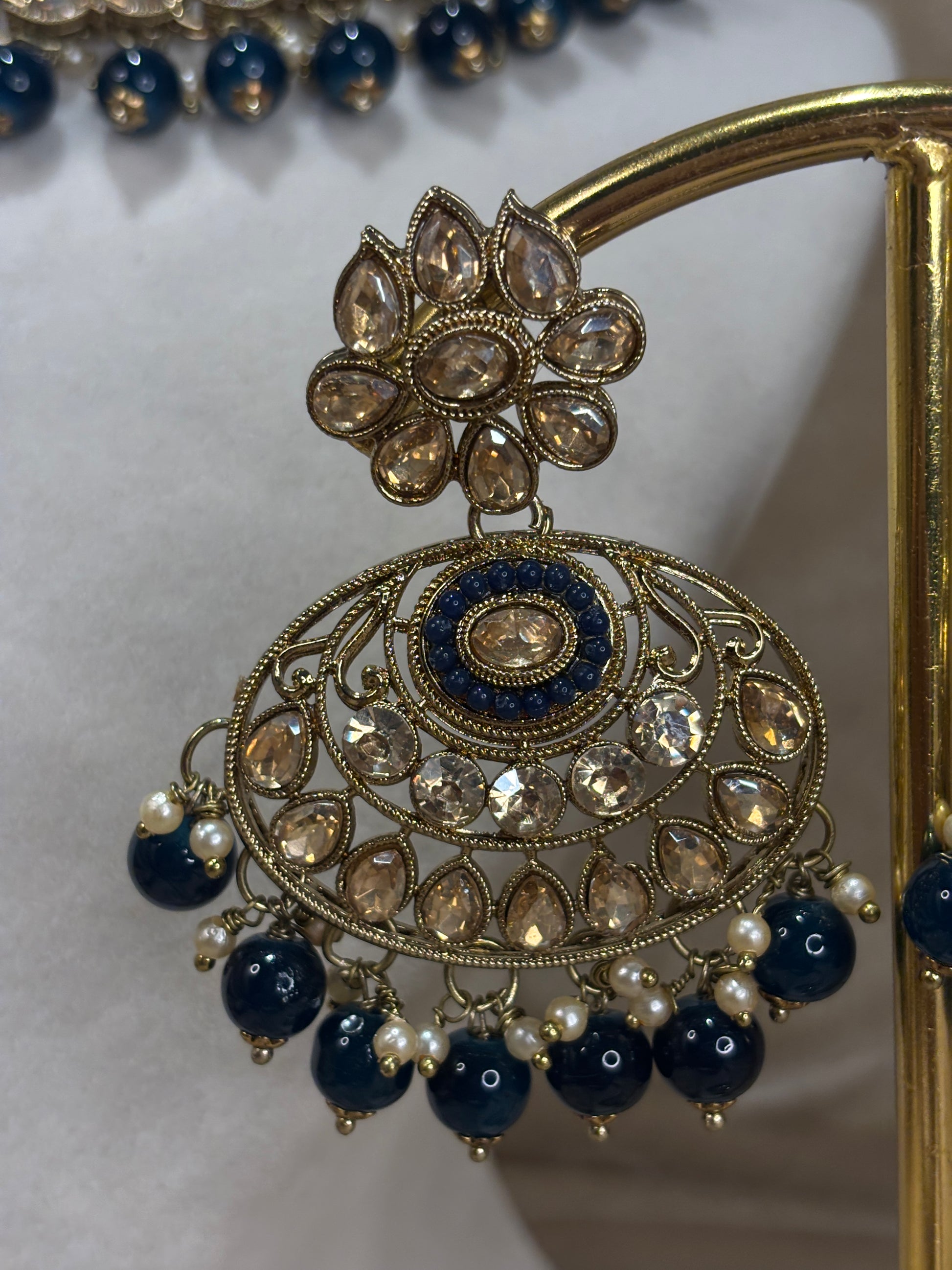 Navy blue necklace set with small pearl details; comes with earrings and tikka