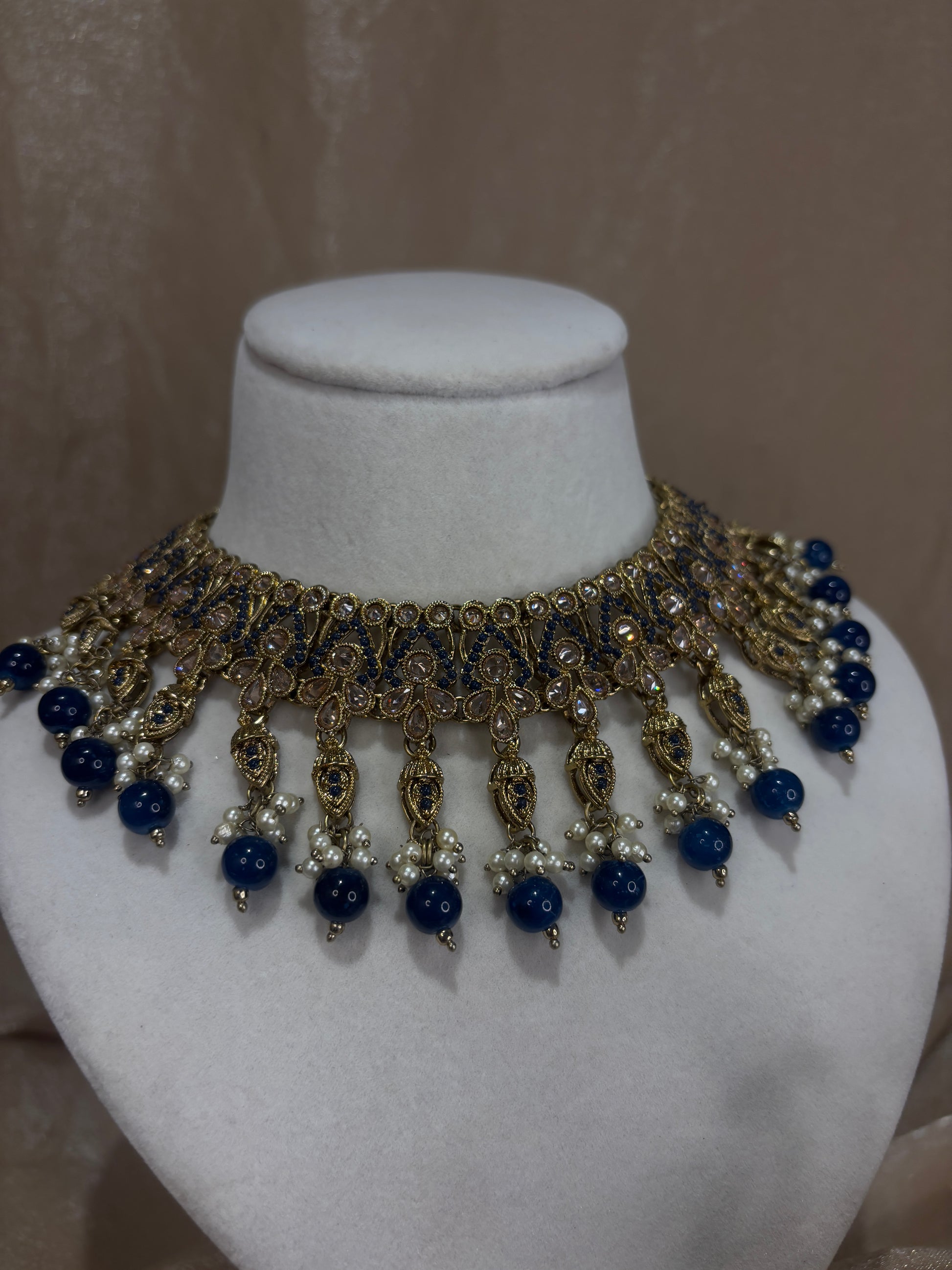 Navy blue necklace set with pearl details; comes with earrings and tikka