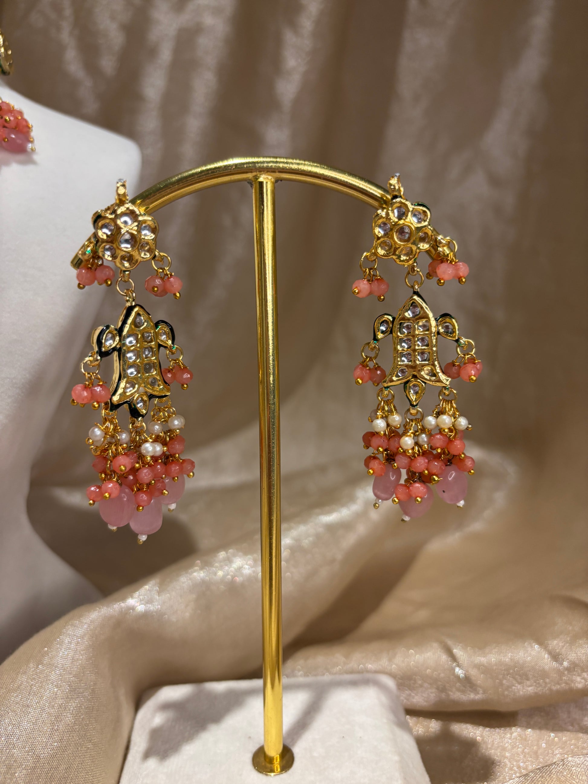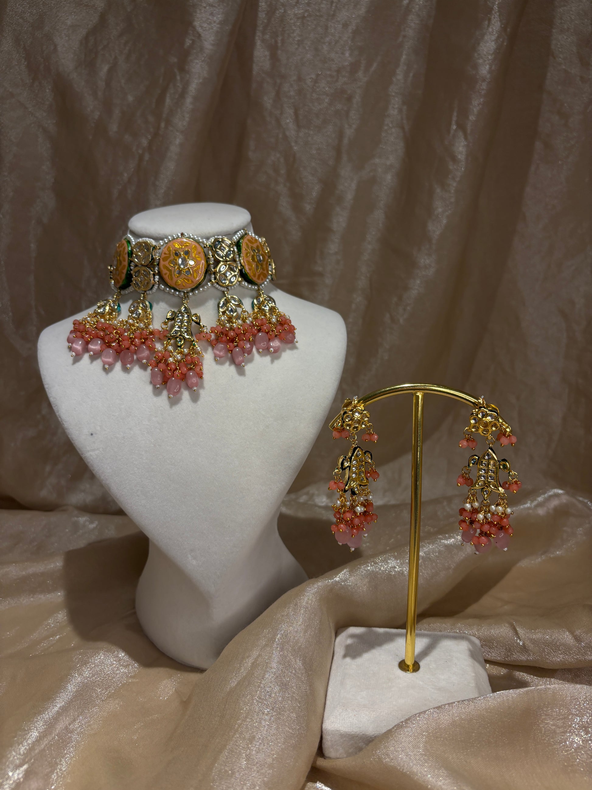 Orange and baby pink kundan choker set with meenakari (hand painted) details