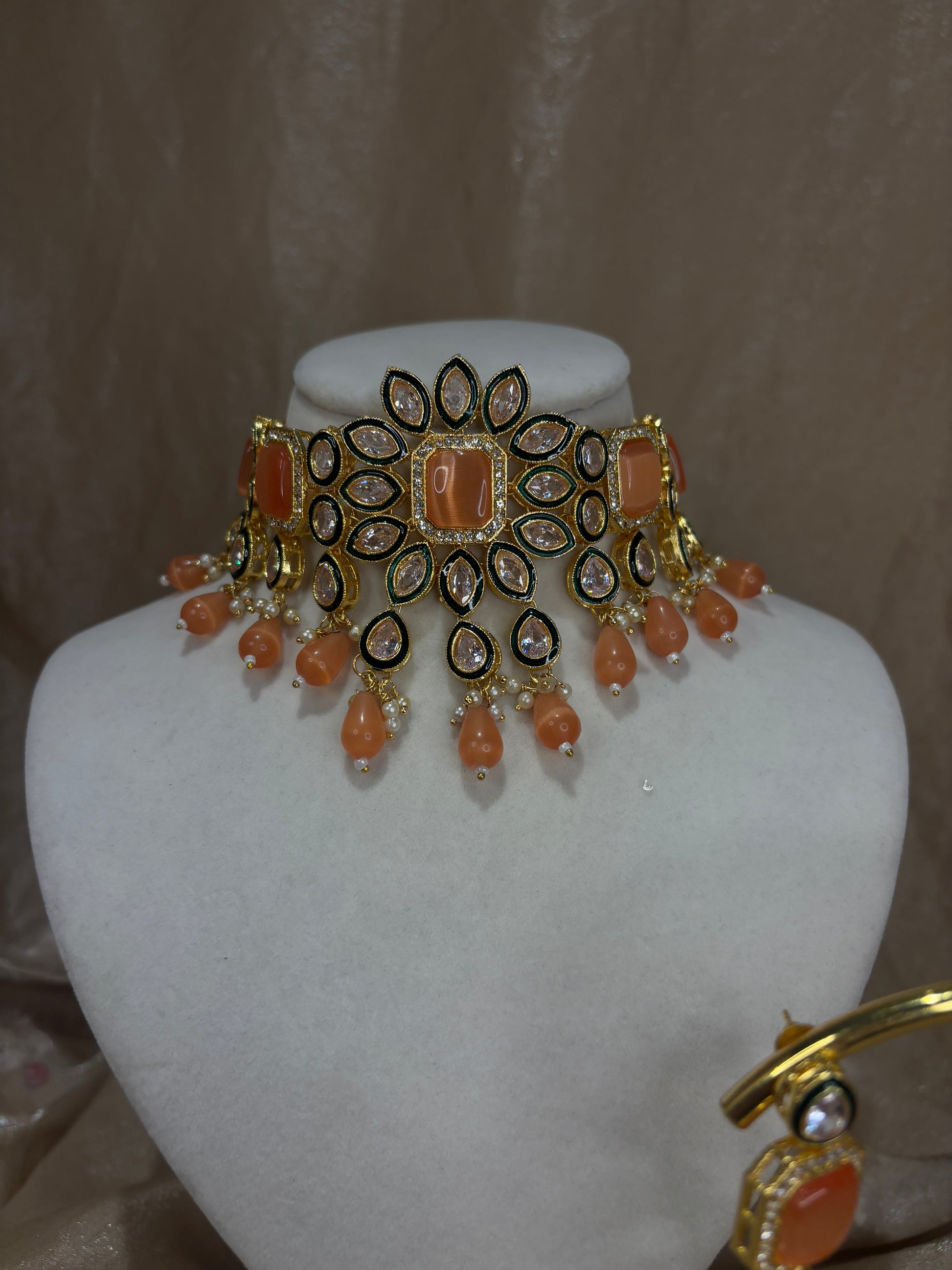 oRange Mona Lisa choker set with pearl details; comes with earrings and tikka