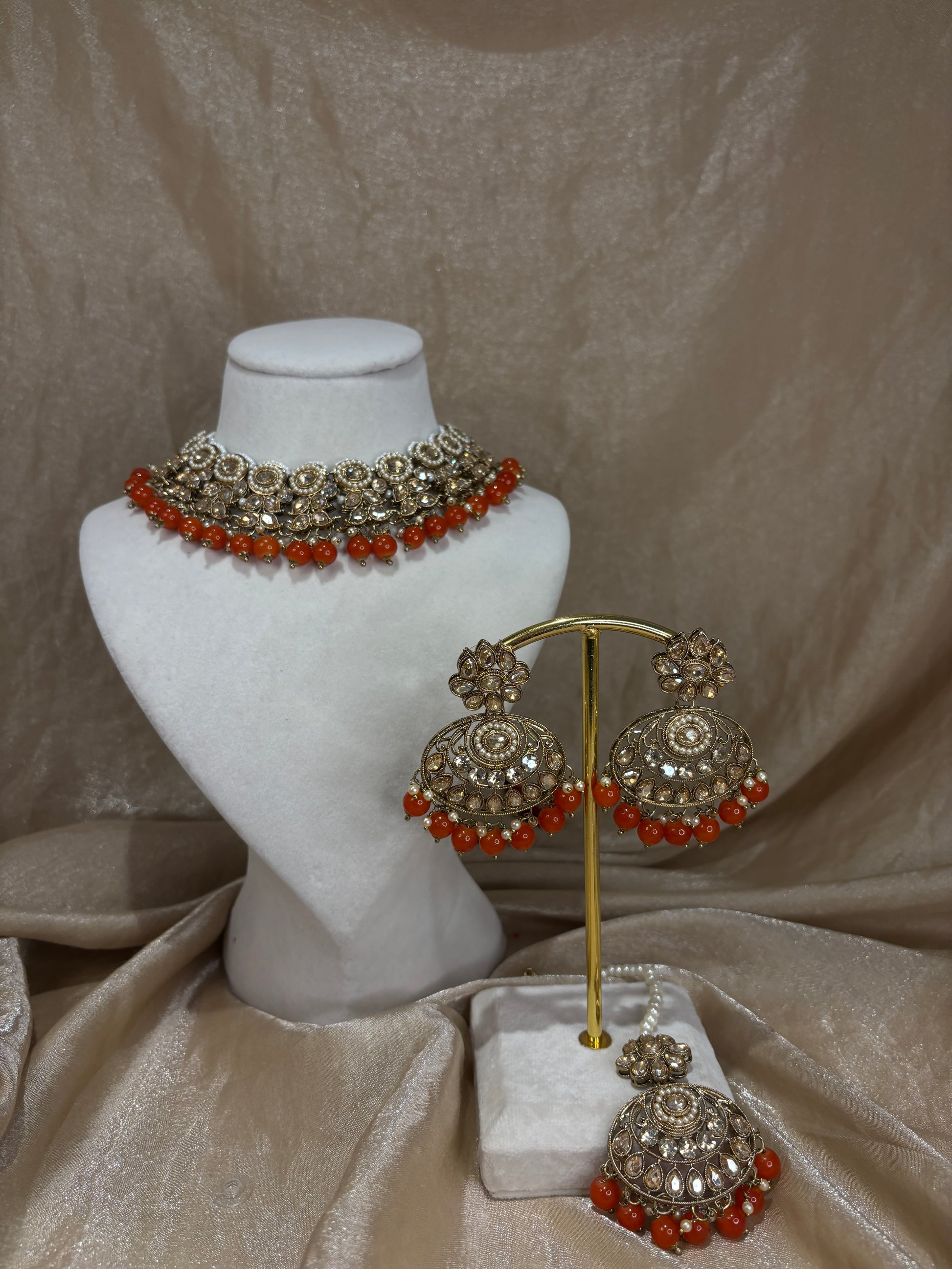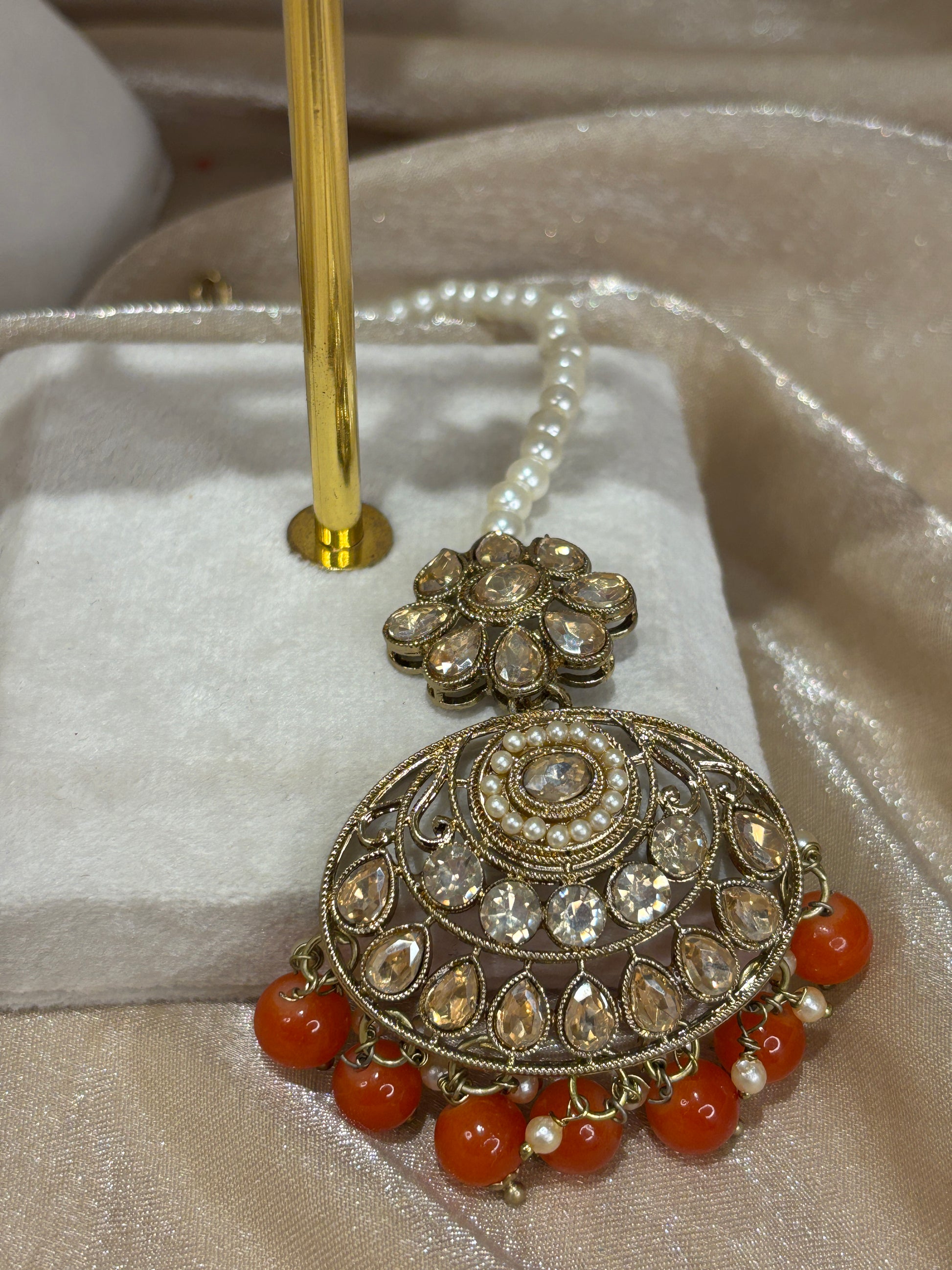 Bright orange necklace set with small pearl details; comes with earrings and tikka