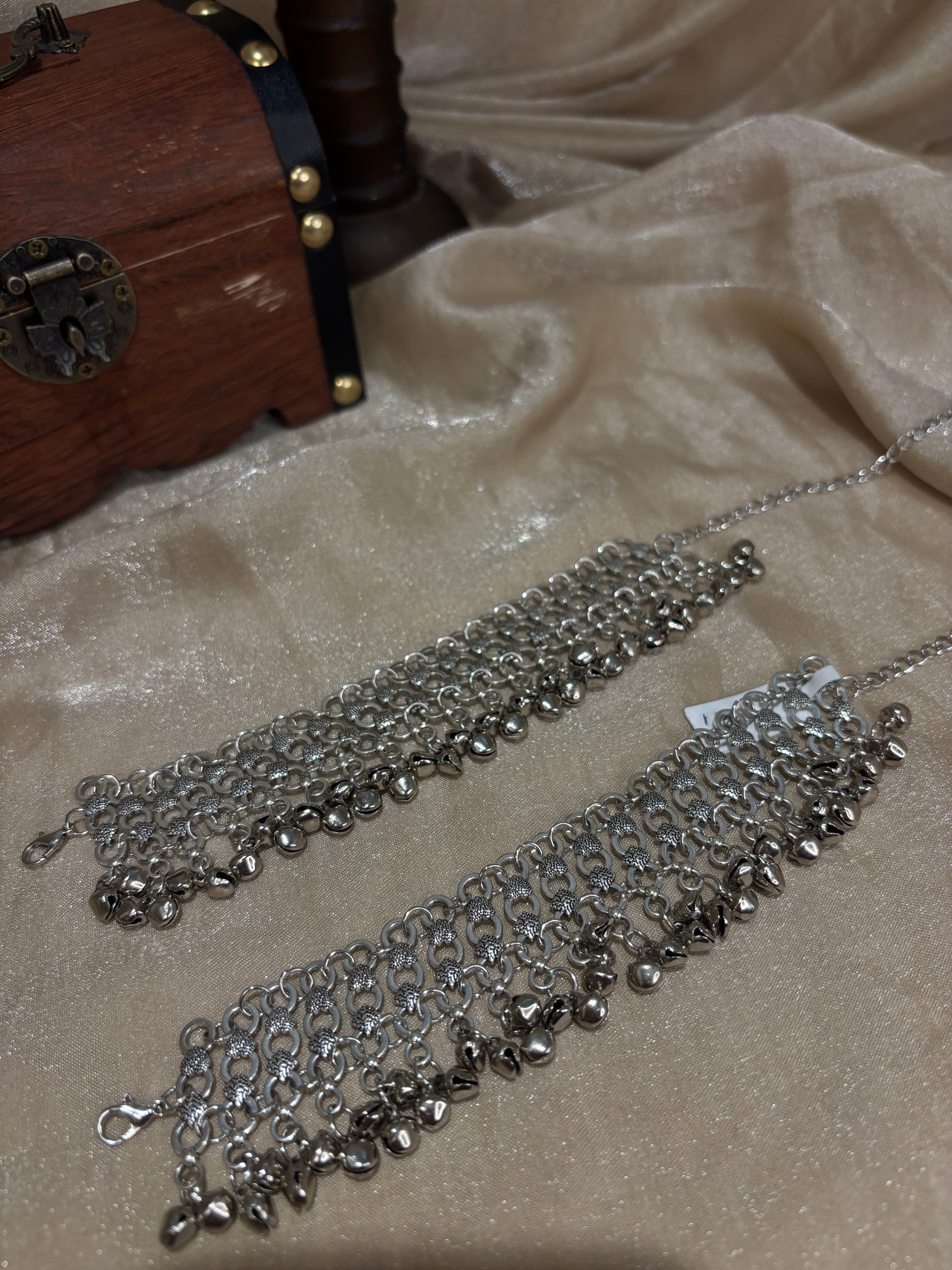 Oxidized anklets with bell details; comes in a pair