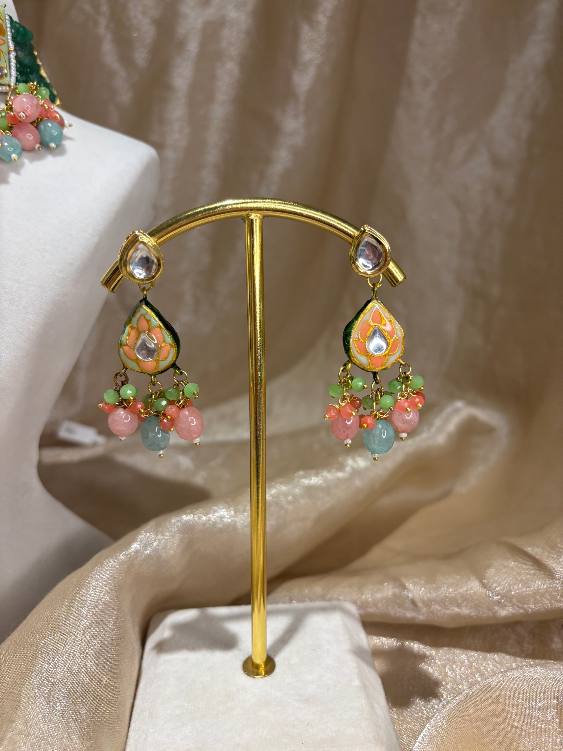 Peach and mint green kundan choker set with meenakari (hand painted) details; comes with earrings and tikka