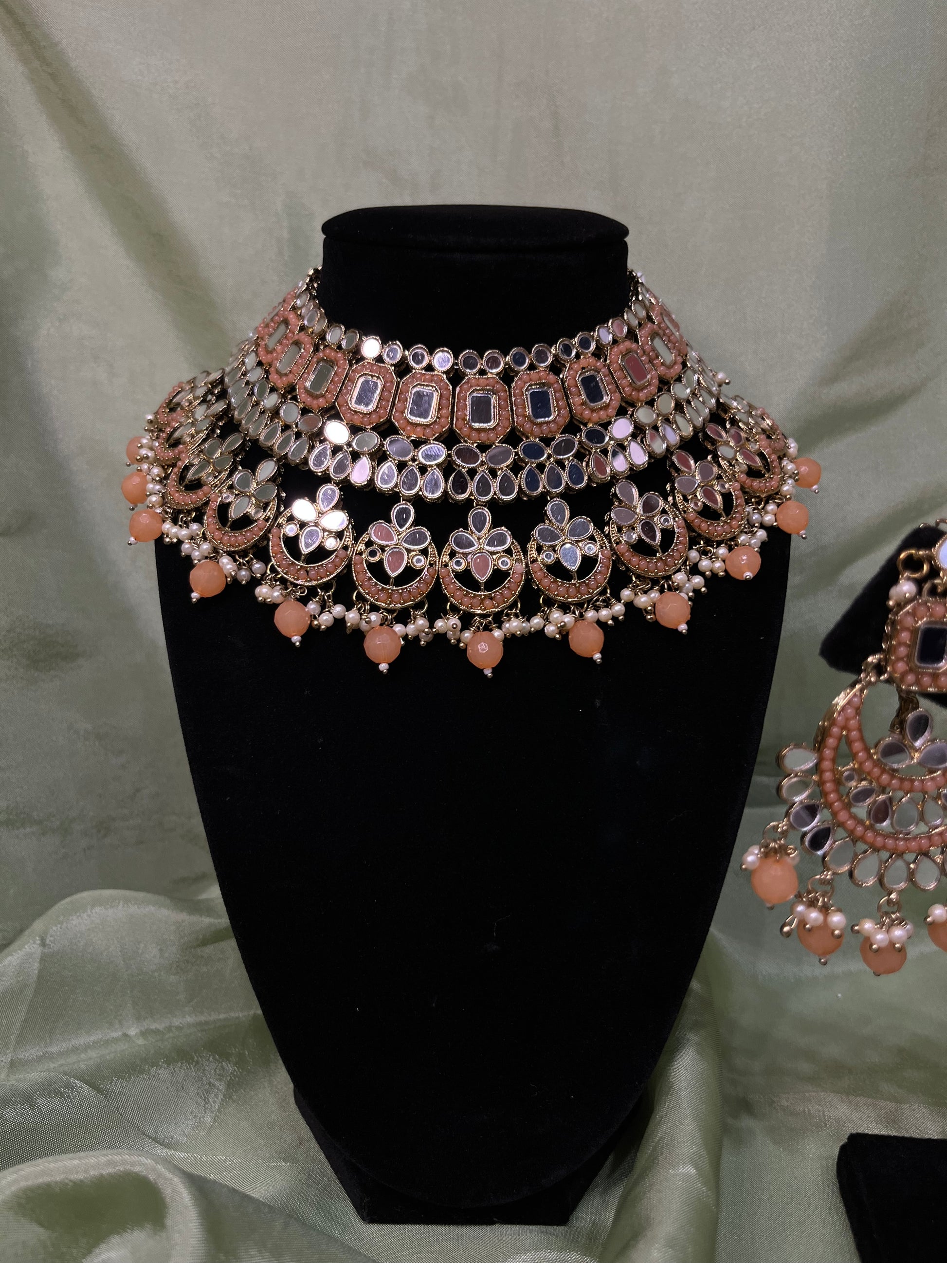 Heavy peach bridal mirror work set; comes with Sahara earrings and tikka