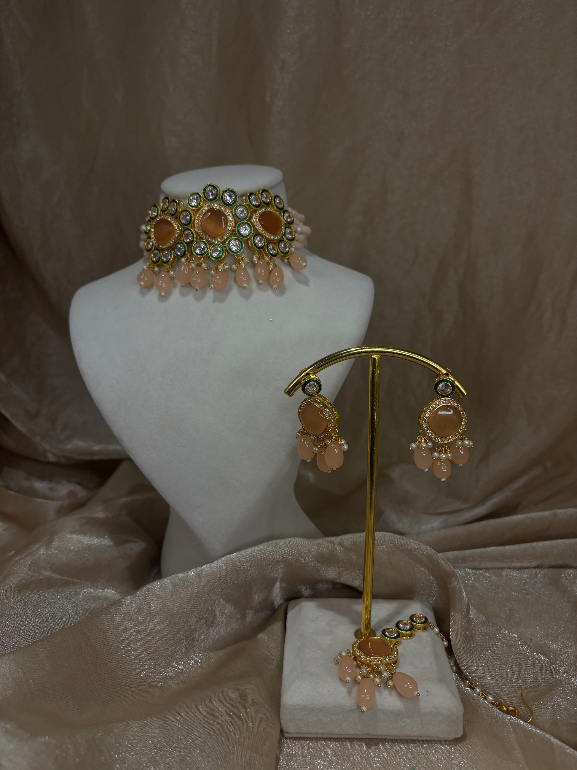 peach Mona Lisa flower detail set; comes with earrings and tikka